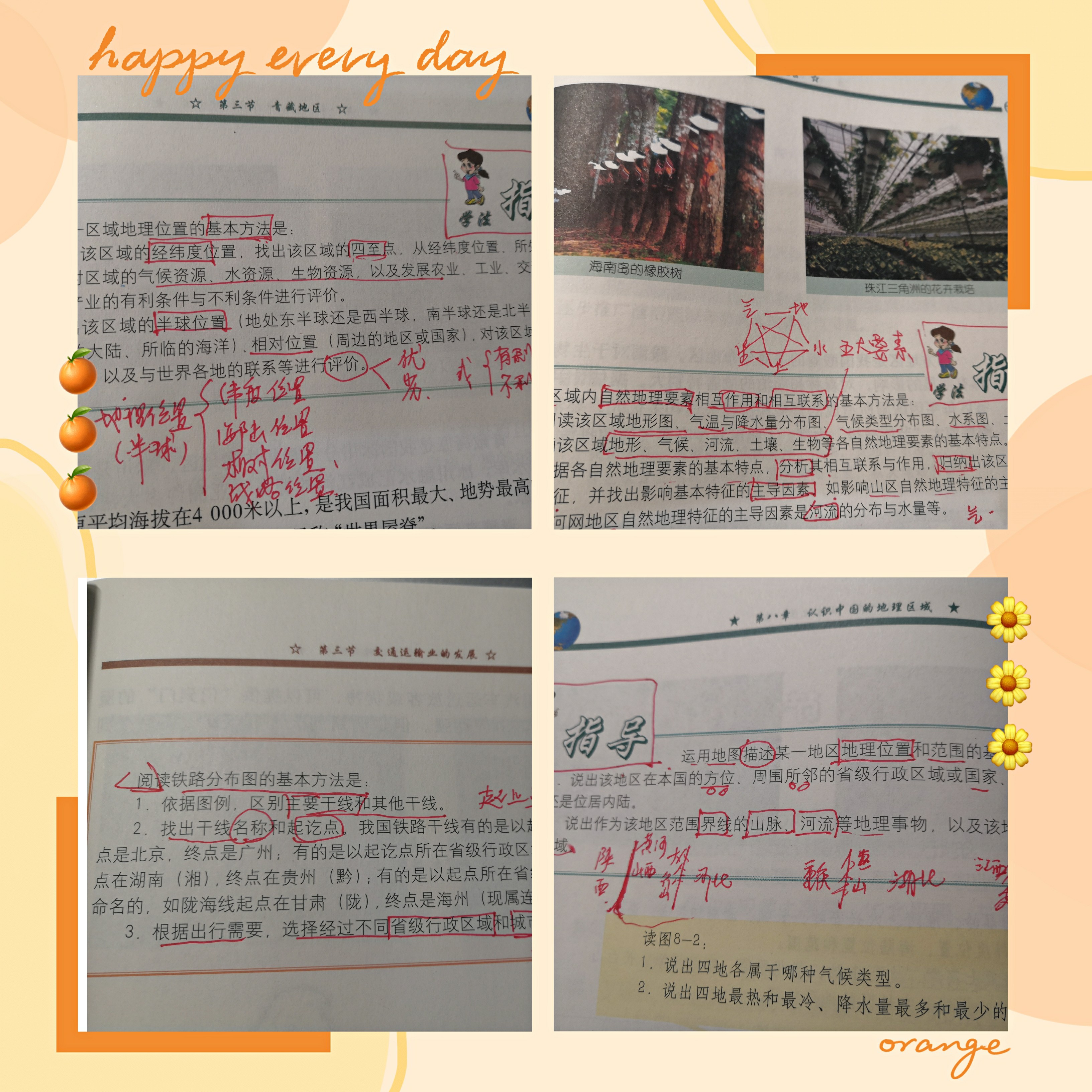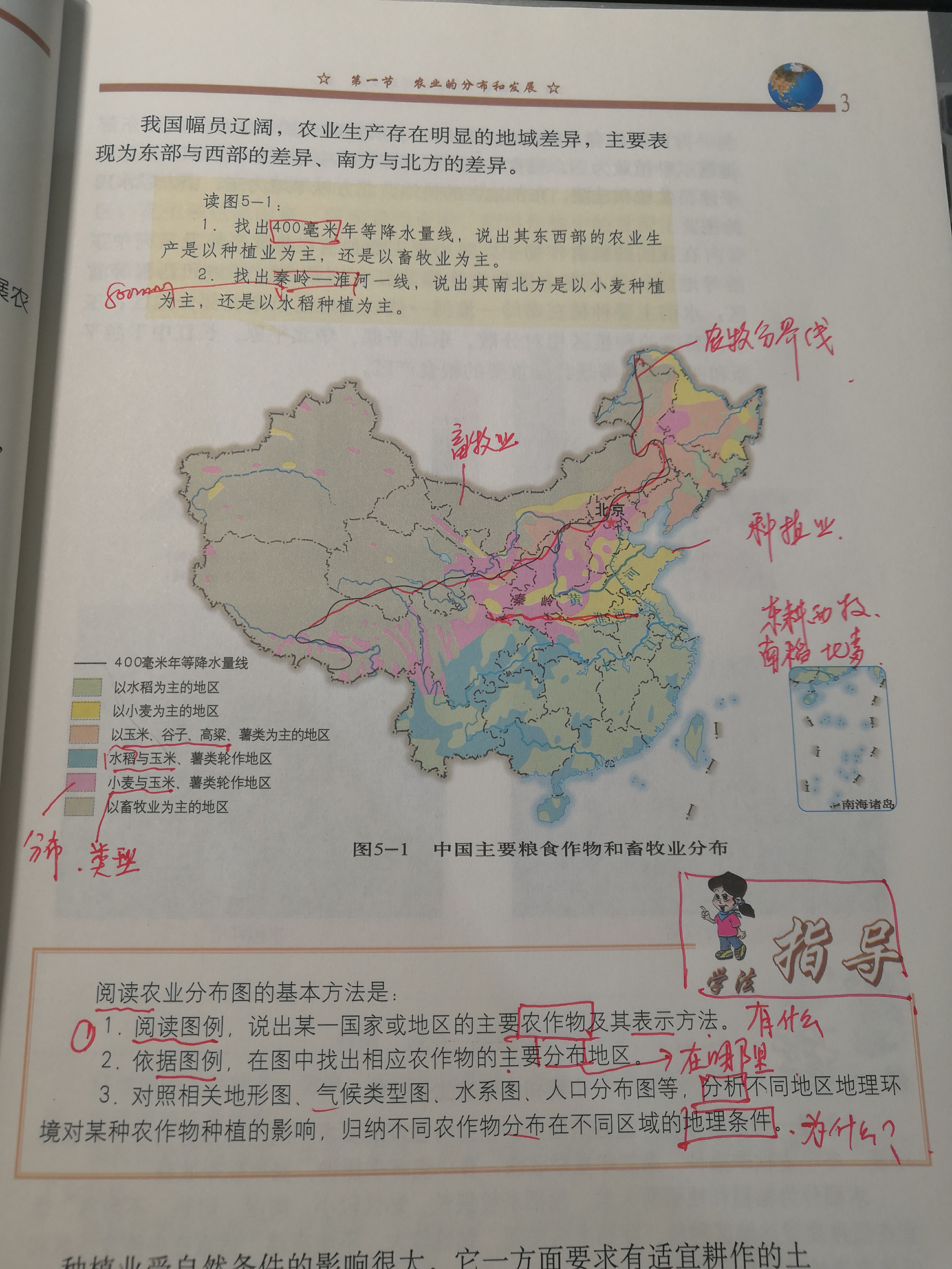 中图北京版初中地理教材每个章节都有相对应解题技巧或答题思路的学法指导。越到后期复习,越要回归教材。比如:复习我国农业分布内容时,学法指导如下:第一步看教材图例。第二步找农作物类型——依据图例。第三步找农作物分布——对照地形、气候、降水等资料,分析原因。这样复习,有图有依据,既直观又简洁,并且学会了回答此类题目的方法,极大提高复习效率,同时规范了答题的内容和步骤。