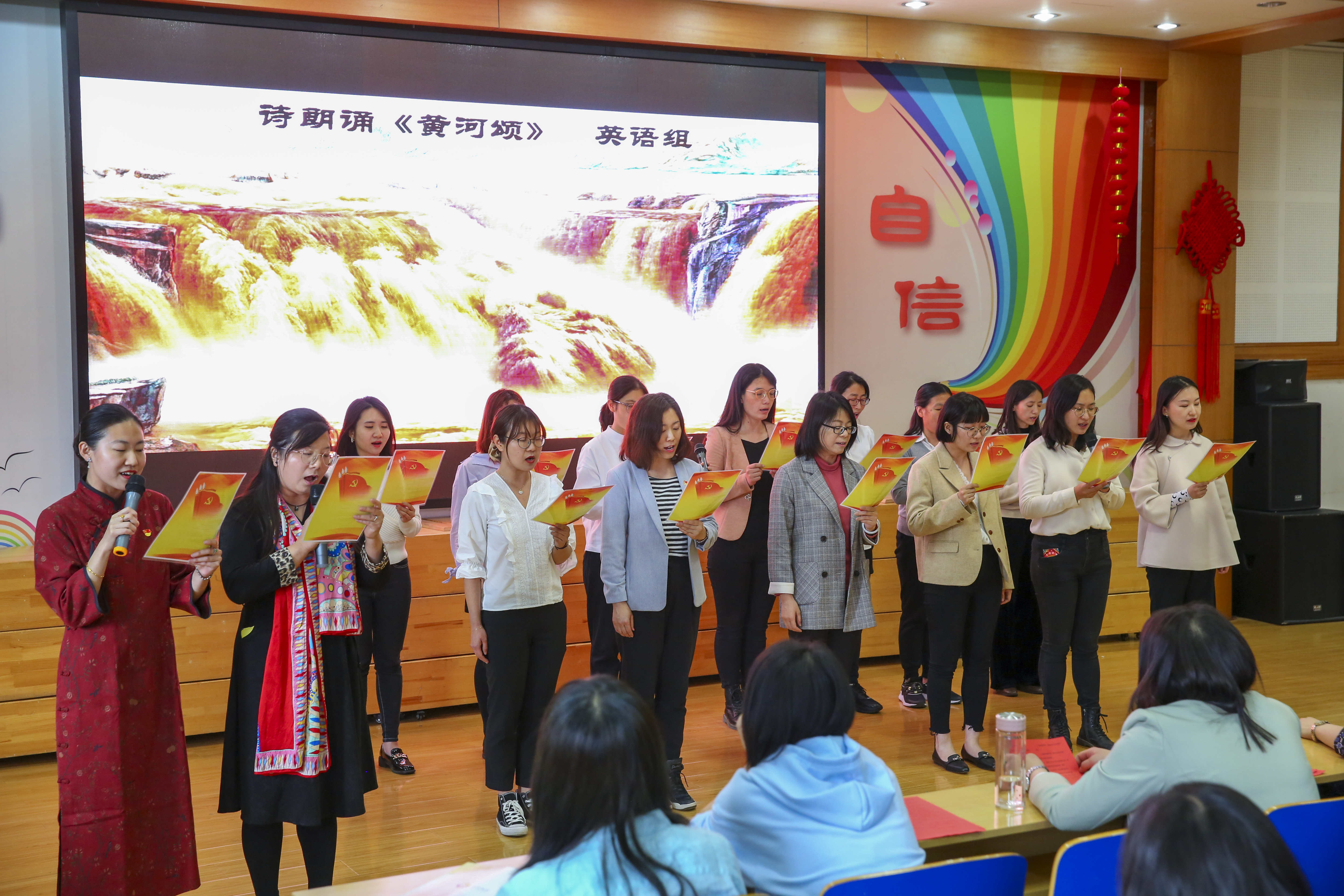 一段段心潮澎湃的朗诵、一首首深入人心的歌曲带领老师们一同穿越历史的烽烟,重温了中国共产党的光辉历程,回顾了老一辈共产党人的峥嵘岁月,讴歌了为民族独立和人民解放而英勇奋斗的伟大精神,在时代的乐章里唱响“和一人”的赤诚与豪迈。庆祝活动精彩纷呈、鼓舞人心,“和一人”将不忘初心、牢记使命,传承先辈们的革命精神,发扬敢闯敢试、敢为人先、埋头苦干的“和一”精神。演出最后,干部组来带的诗朗诵《读中国》将全场气氛推向高潮,伴随着《我爱你中国》这首气势恢宏的红色经典歌曲,庆祝活动圆满落下帷幕。