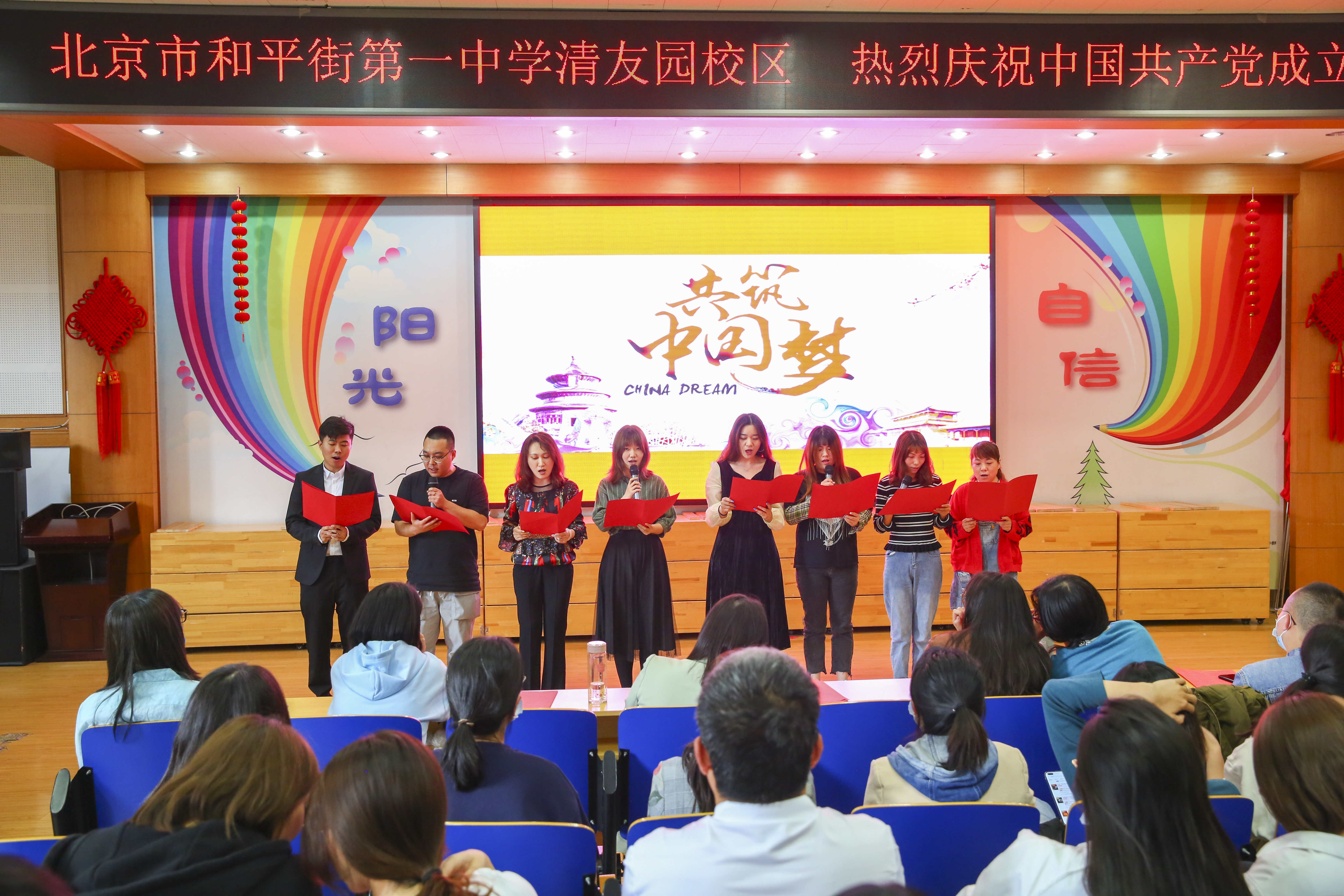 100年风雨兼程,100年峥嵘岁月,100年砥砺奋进,中国共产党带领中国人民取得了举世瞩目的辉煌成就。今天我们用嘹亮的声音,抒发对党、对祖国的满腔挚爱,对党一百岁生日的诚挚祝福。随着主持人宣布:“北京市和平街第一中学清友园校区歌颂祖国 歌颂党——庆祝中国共产党成立100周年活动正式开始”庆祝活动拉开了序幕。