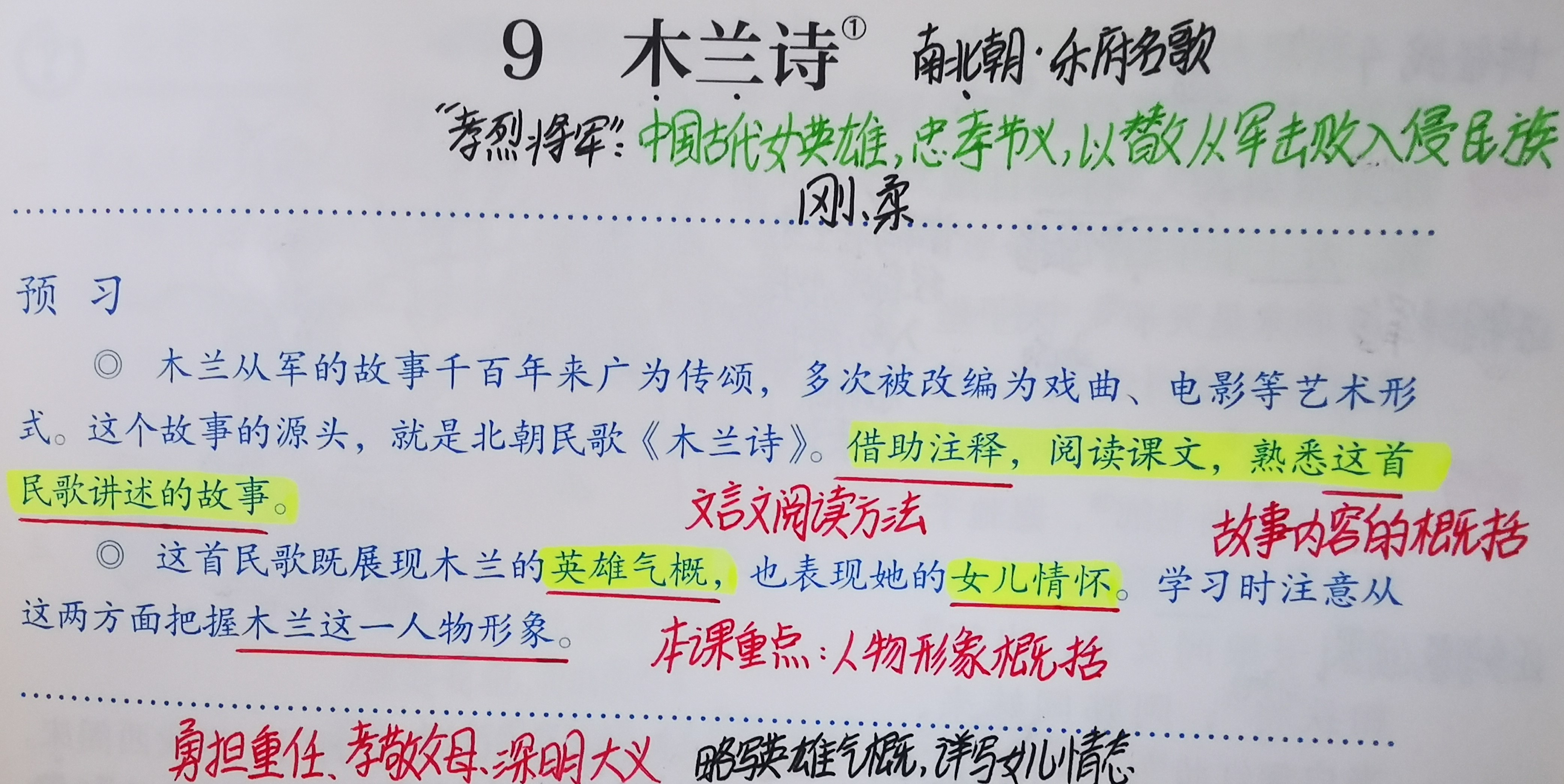 读预习提示,明确本课学习方法和阅读重点。例如:第9课预习提示中“借助注释,熟悉这首民歌讲述的故事”提示我们学习重点之一为“故事内容的概括”,方法为“借助注释”;“从这两方面把握木兰这一人物形象”提示我们本课学习重点之二为木兰人物形象概括,角度为“英雄气概”和“女儿情怀”。