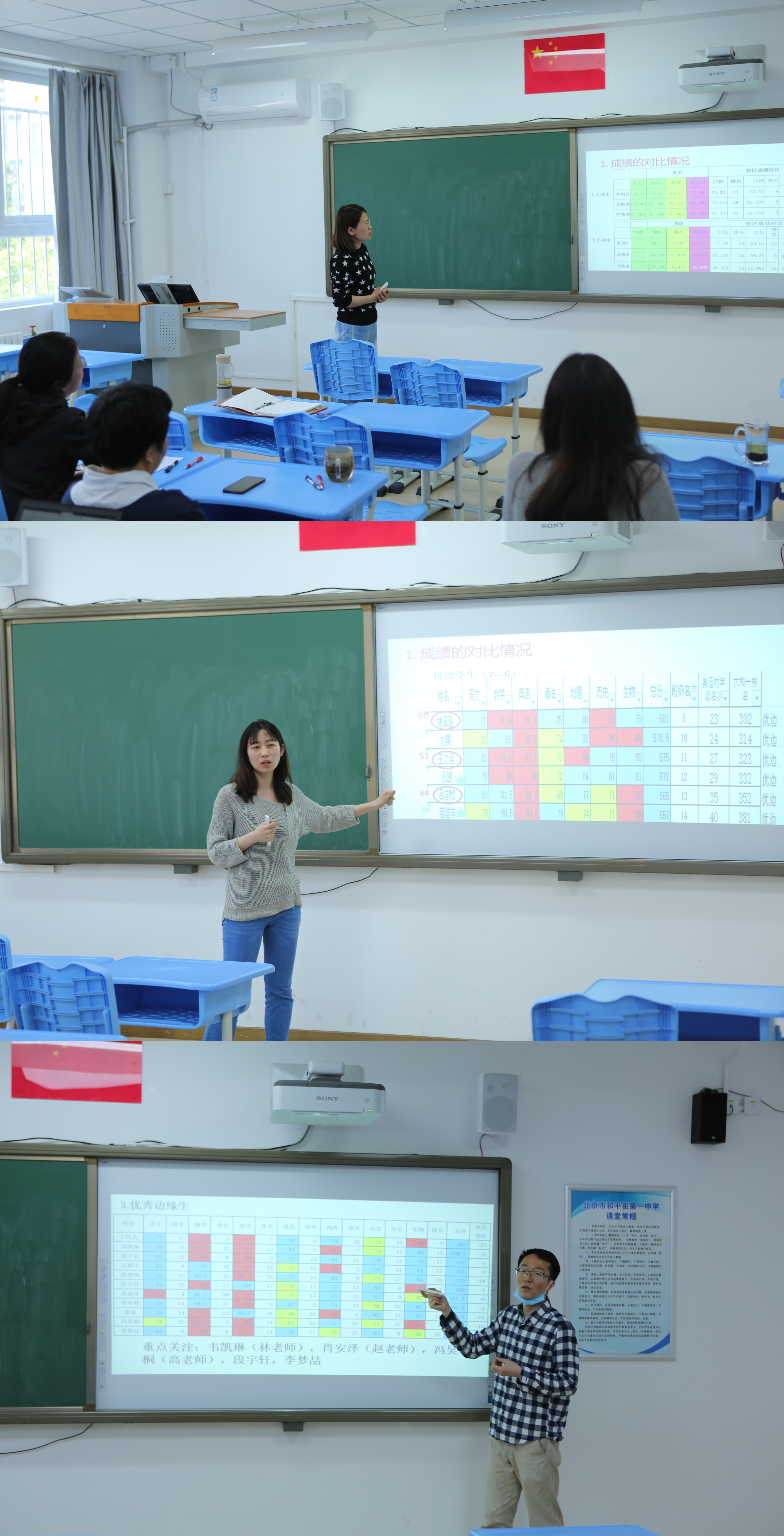 初一年级班主任王珊珊老师、董佳琦老师和林殿吉老师就前一阶段本班边缘生帮扶情况进行了汇报,并从班级学科均衡性角度分析优势学科的长处和弱势学科的问题,寻找提升策略。各学科教师也积极交流,对如何提高学生成绩献言献策。
