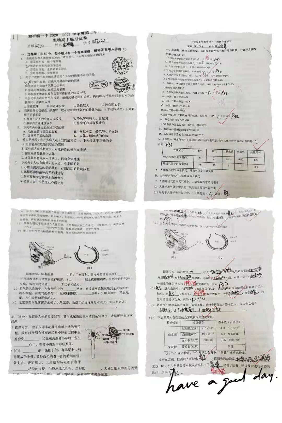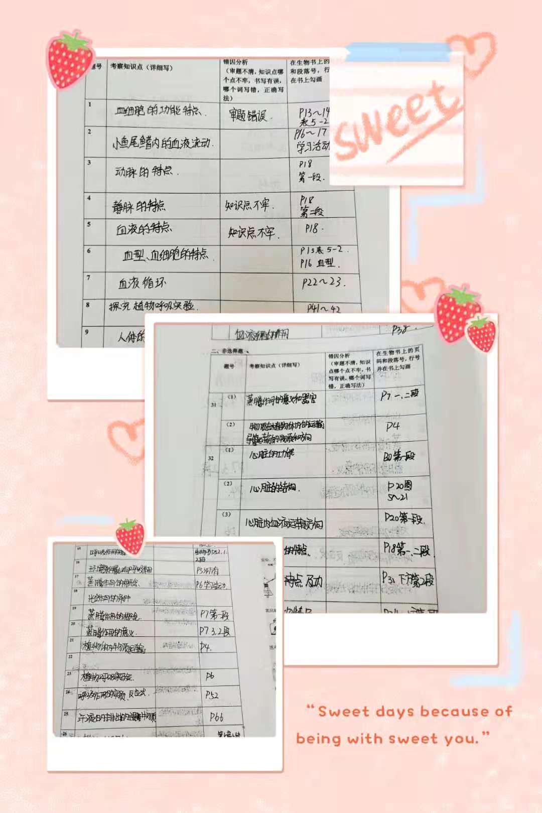初一年级生物备课组让学生根据试卷内容写出相应的考察知识点,分析错因,并在教材上找出相应的段落和行号。