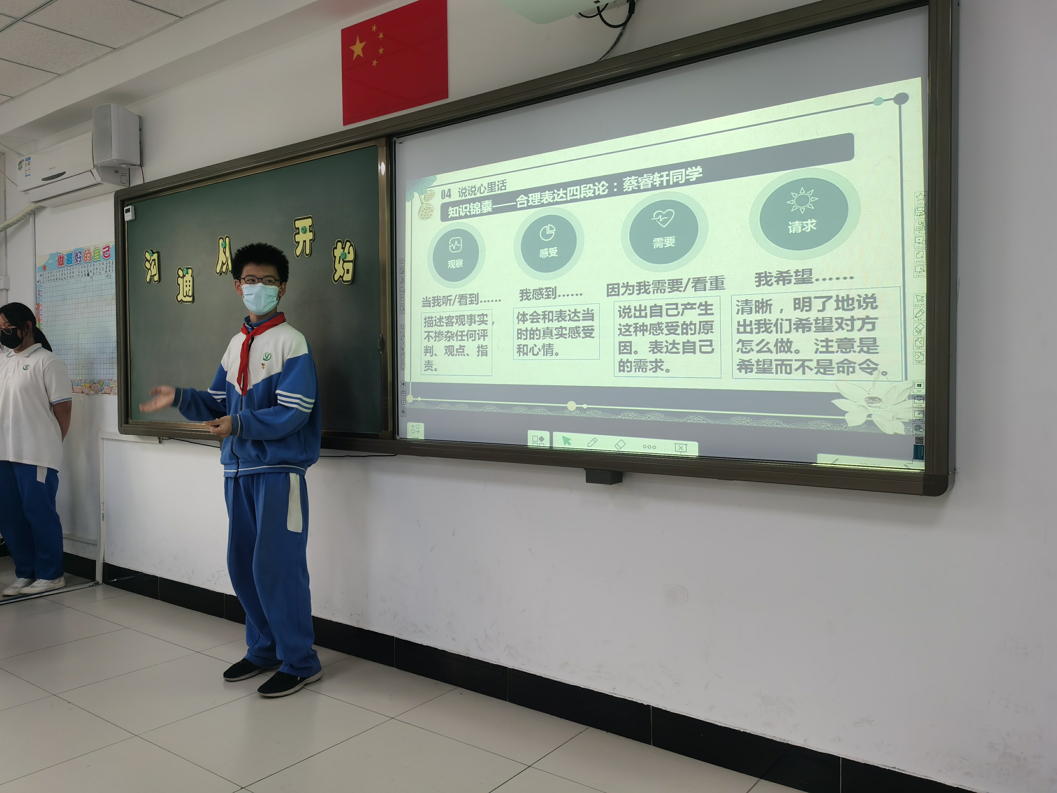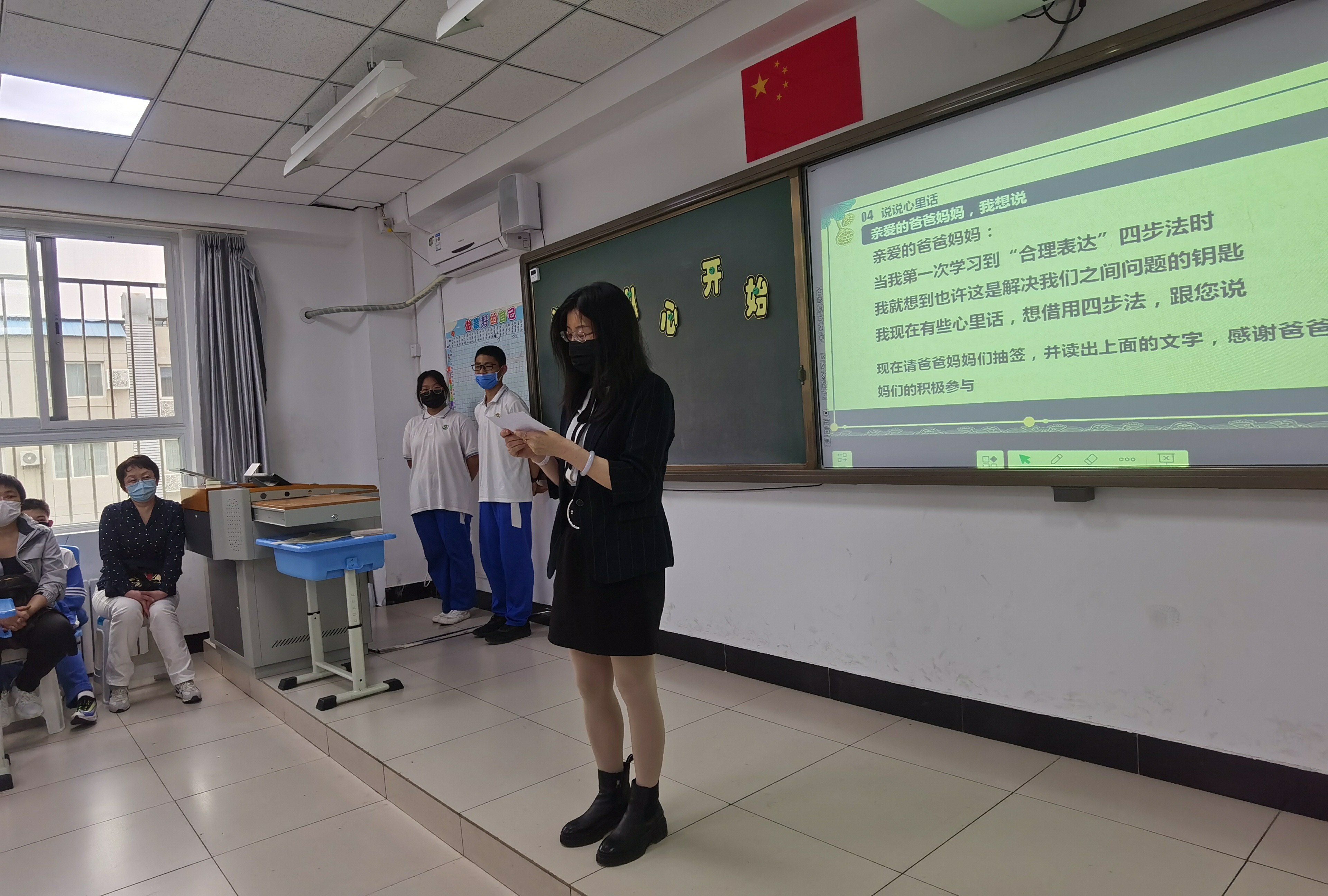 良好的家庭氛围和亲子关系能促进孩子的健康成长,此次家长会,各班学生在心理老师张妮的指导下,自编自演心理情景剧,展示“合理表达四段论”的沟通方式在亲子交流中的作用,家长和学生现场运用四段论进行沟通和表达,学生勇敢地说出了对家长的感激和诉求,家长也表达了对孩子的理解和期望,现场气氛温暖融洽。