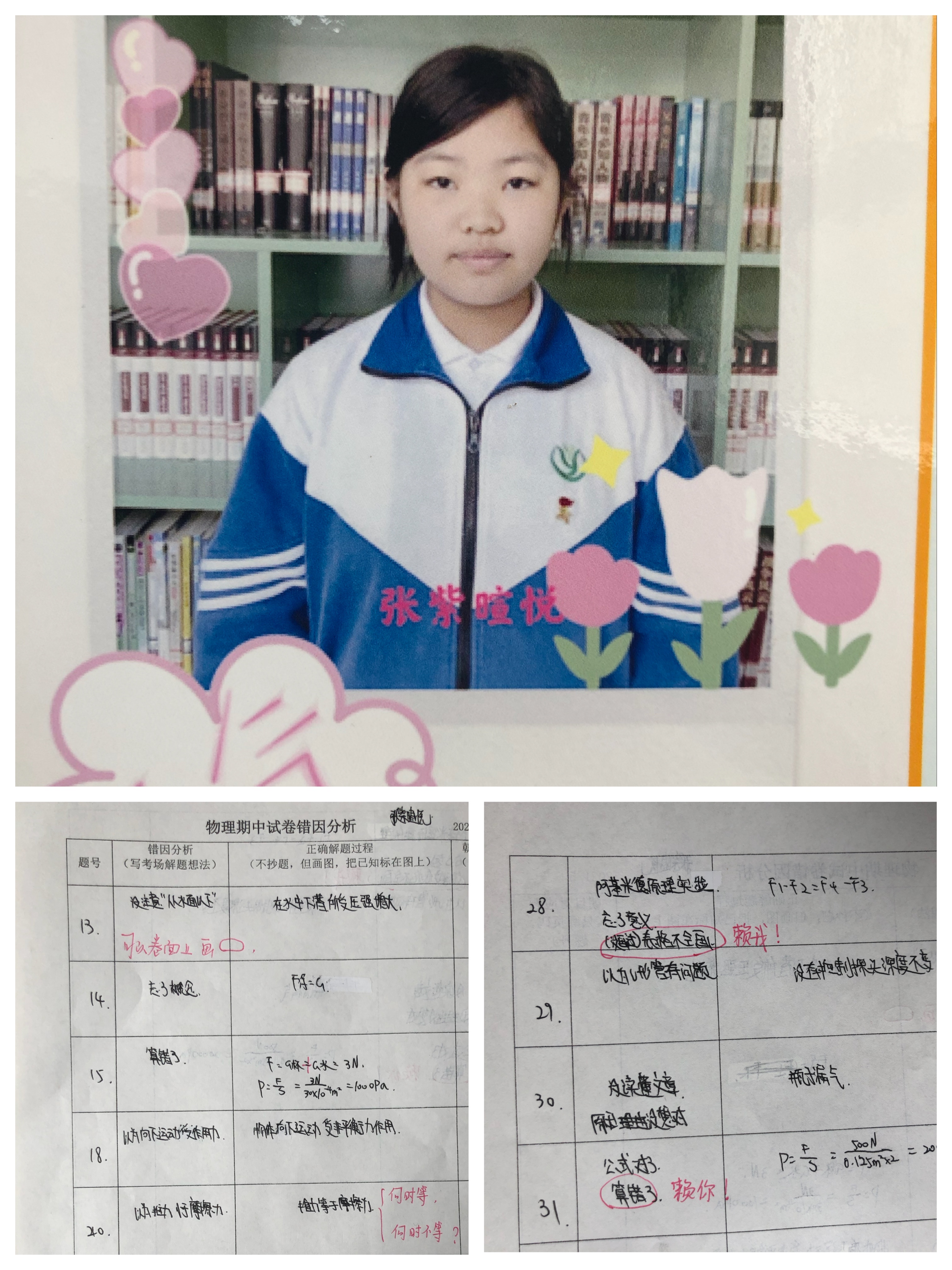 初二20班冯曦同学在错因分析中,发现自己审题不清,概念模糊的问题,通过书写正确的解题过程进行一一核对。在以后的学习中,将理解物理量“是什么,为什么,怎么用”放在首位,重视物理概念的建立过程,严格要求自己。