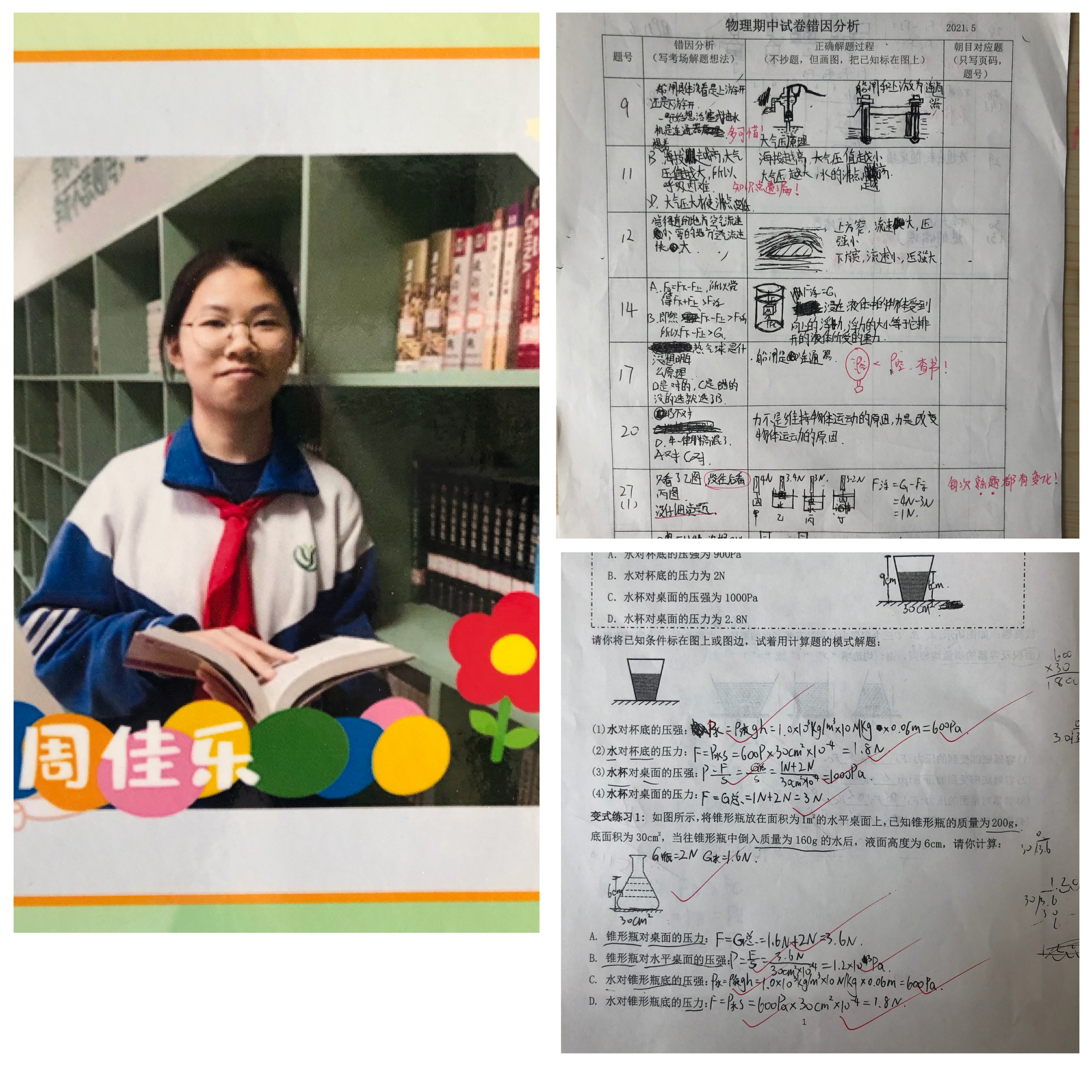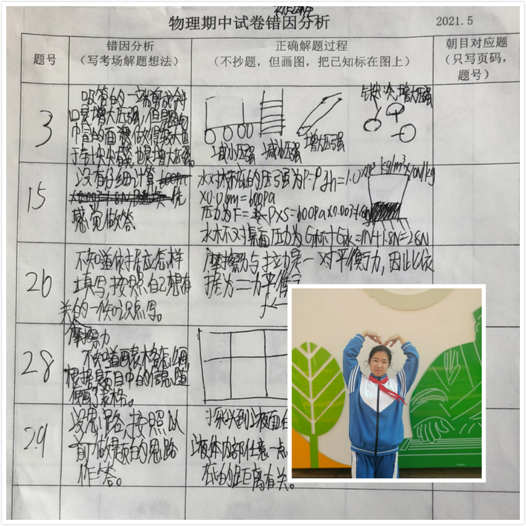 初二20班的周佳乐同学在错因分析中利用画模型图的方式,将易混知识点进行对比,也将重点内容进行错题反思,找出自己学习上的不足。她迅速调整自己的学习方法,重理解,多做变式练习,将每一个知识点吃透弄懂。