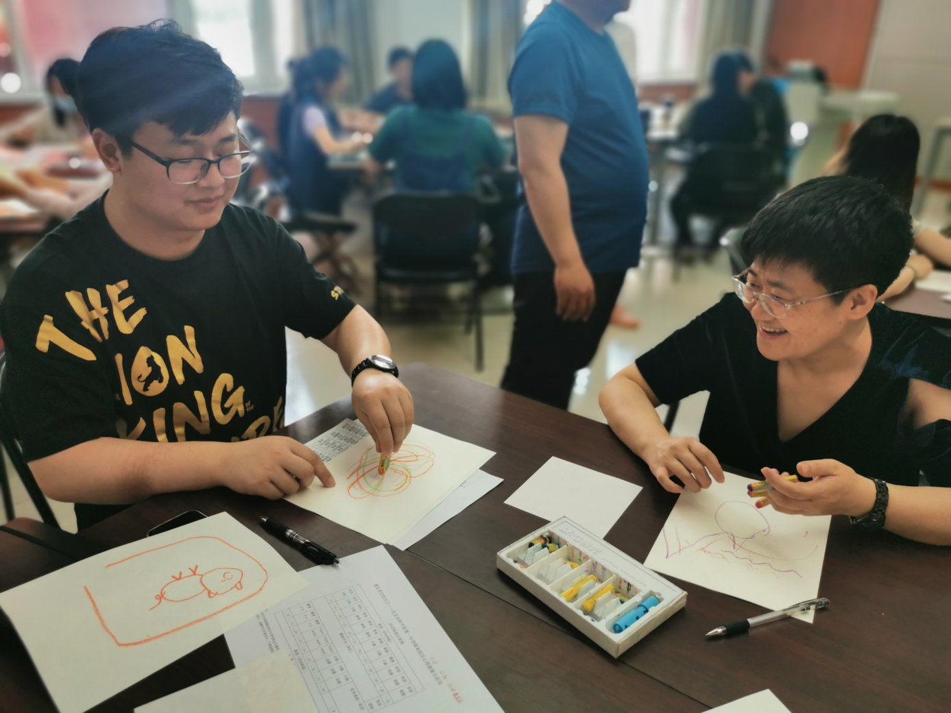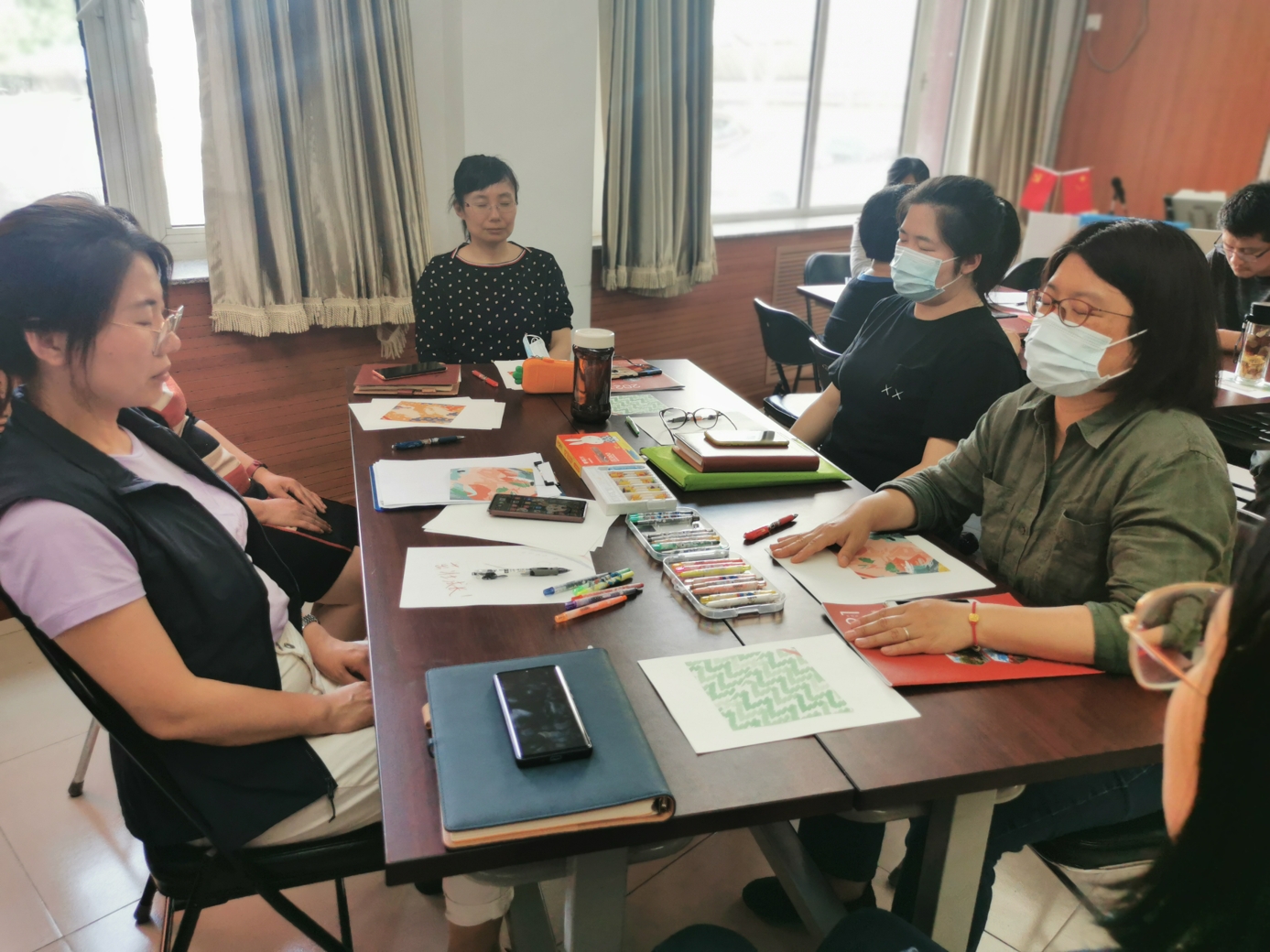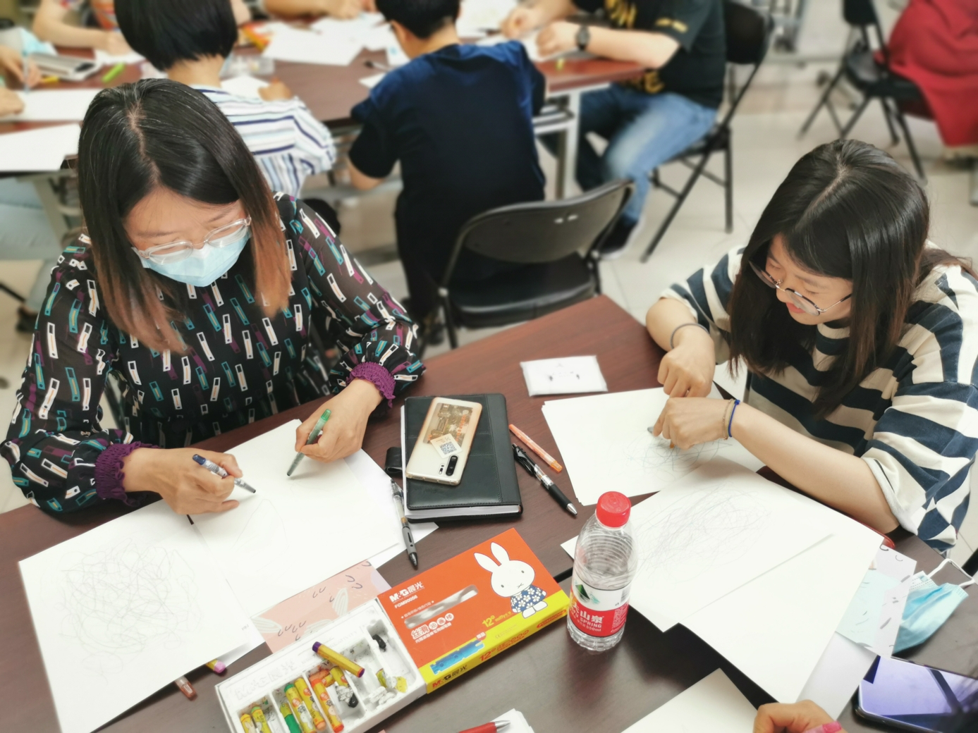 心理教师刘志宏首先以一个小调查引入活动,询问老师们在生活和工作中是否出现过一些难以名状的情绪。接着,在平静的背景音乐与柔和的引导语中,刘老师带领大家进行了一段正念冥想。每位参与的老师都闭上眼睛,跟随引导语进行着呼吸的专注和身体的放松。当老师们能够面对流淌于当下的情绪体验时,在舒缓的音乐背景中,老师们用不同颜色的蜡笔在纸上进行涂鸦,让情绪投射于纸上,并依照引导给自己的作品起名字,写下故事。老师们创作完还进行了分享,大家互相认真聆听,在分享中互相疗愈。最后,每位老师给自己写下了一句鼓励、充满爱意的话语。