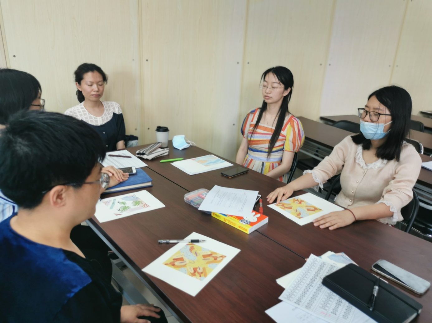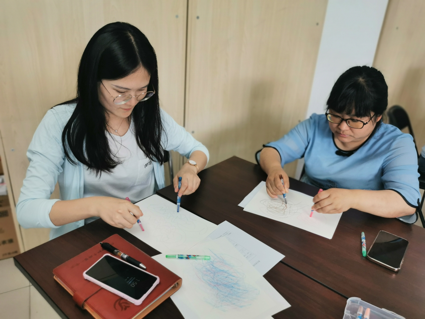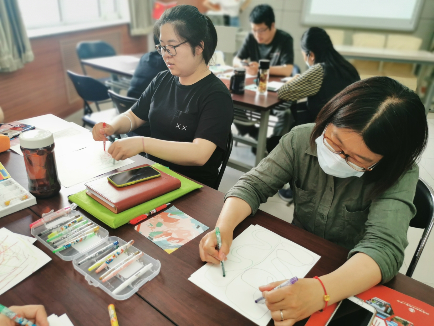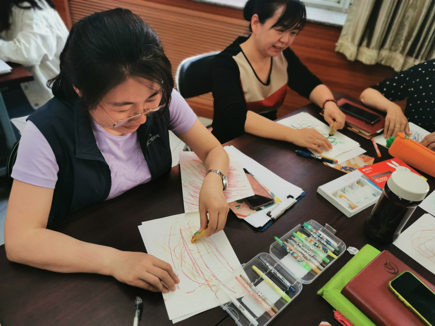 心理教师刘志宏首先以一个小调查引入活动,询问老师们在生活和工作中是否出现过一些难以名状的情绪。接着,在平静的背景音乐与柔和的引导语中,刘老师带领大家进行了一段正念冥想。每位参与的老师都闭上眼睛,跟随引导语进行着呼吸的专注和身体的放松。当老师们能够面对流淌于当下的情绪体验时,在舒缓的音乐背景中,老师们用不同颜色的蜡笔在纸上进行涂鸦,让情绪投射于纸上,并依照引导给自己的作品起名字,写下故事。老师们创作完还进行了分享,大家互相认真聆听,在分享中互相疗愈。最后,每位老师给自己写下了一句鼓励、充满爱意的话语。