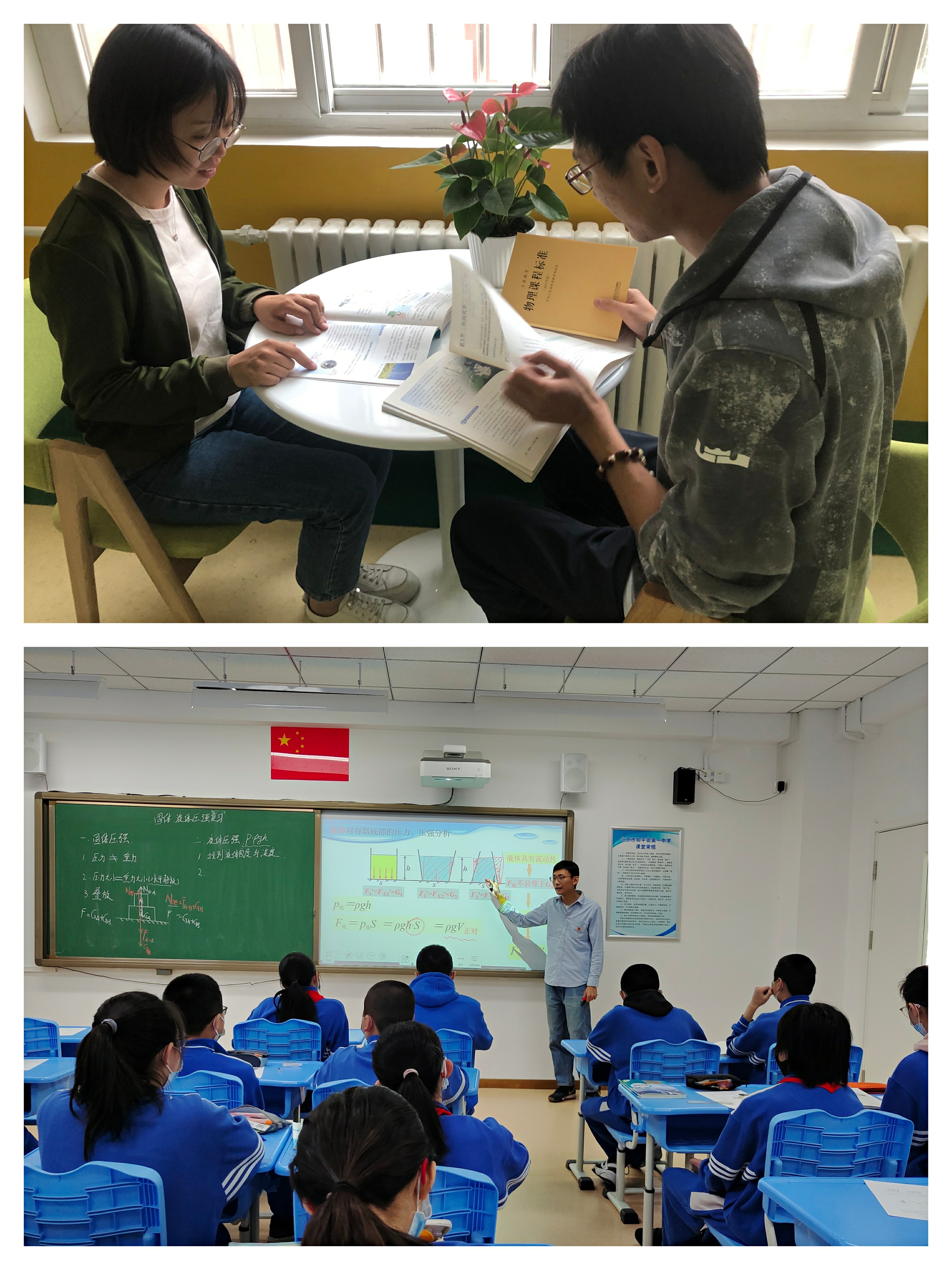 物理郑磊老师通过三个探究实验总结影响压强的相关因素,并利用得出的实验结论以解决相关问题。物理组内交流,聚焦学生练习时教师巡视、学生答题、单独辅导的教学方式方法。