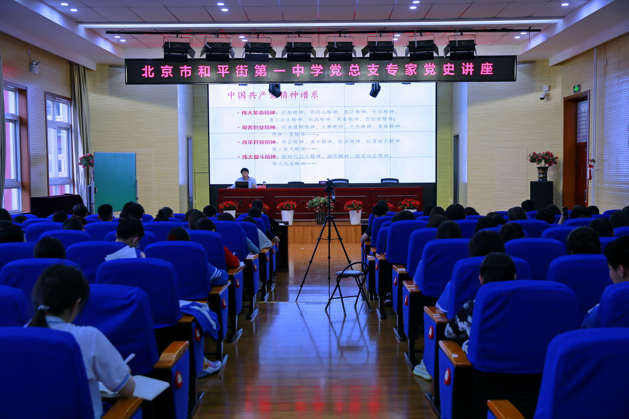 2021年5月18日,和平街一中在和平街高中校区举行党史学习专题讲座。校区全体教职工、高三年级学生和高一年级入党积极分子聆听了讲座。活动由张静书记主持。