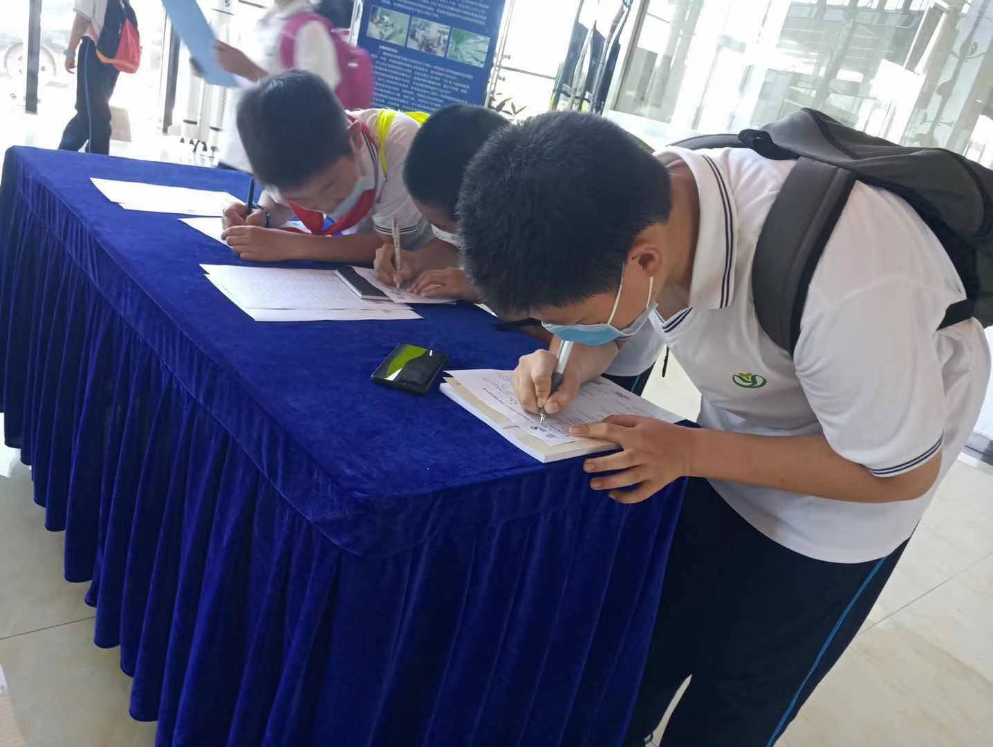 同学们拿着写有任务的任务卡边参观、边记录:通过生动的航天工程讲解和面对面的交流方式激发起孩子们对航天工程育种的好奇;精彩的宣传片萌发了同学们对航天工程育种的兴趣;积极参与科普问答互动。