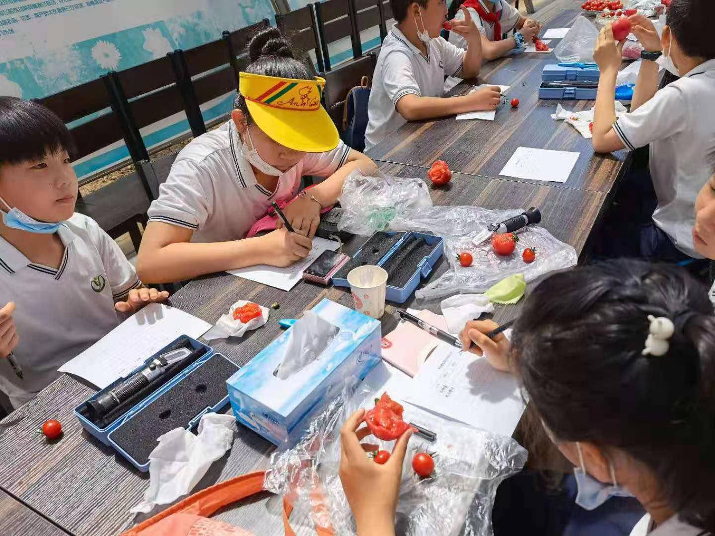 同学们在老师的带领下参观了航天工程育种新品种温室,认识各种类别的航天育种蔬菜,学习航天工程育种植物组织培养技术,并亲自测试航红樱1号的含糖量。同学们在动手中获得了乐趣,收获了知识,锻炼了动手实践能力。