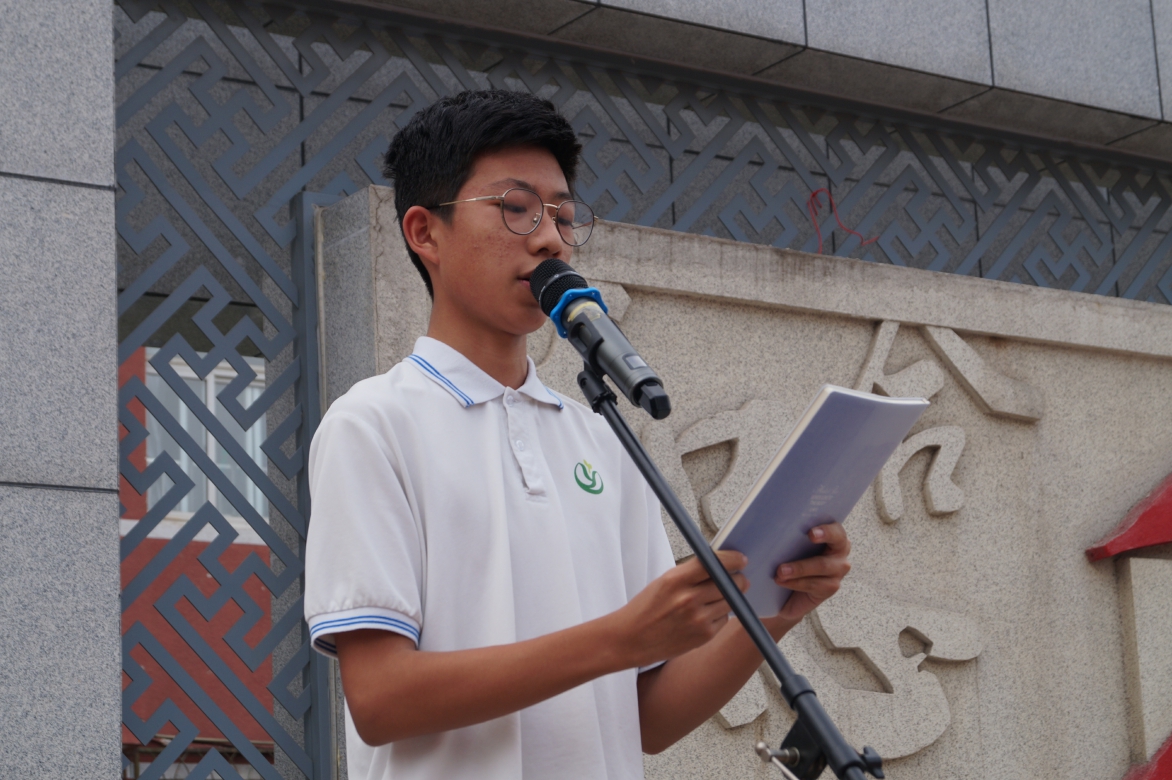 作为新一届国旗班代表初一7班盛和同学首先向老国旗班成员致敬,感谢前辈这一年来的辛苦付出,同时带领第三届全体成员向全校表态:他们会接过重担、牢记责任、继承国旗班的优良传统,发扬国旗班不怕吃苦精神,认真训练,用辛勤的汗水,为国旗班赢得新的辉煌。