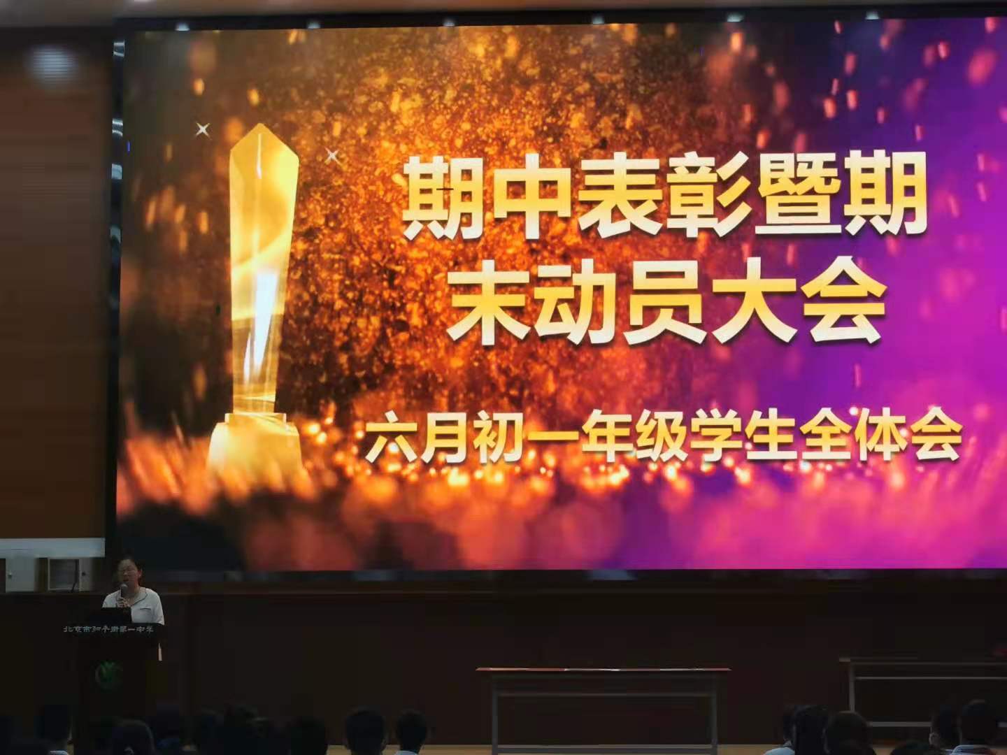2021年6月8日下午四时,和平街一中朝来校区在风雨操场组织召开了初一年级期中表彰暨期末动员大会,年级组长陈立娟老师主持会议,全体初一学生及班主任参加。