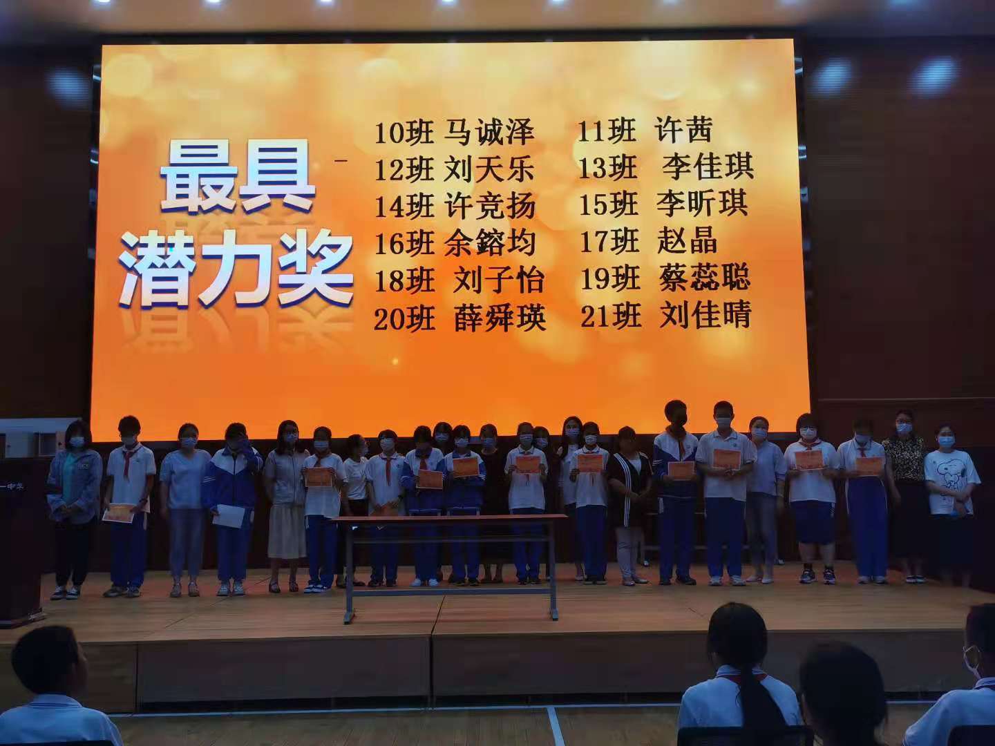 会议的开始陈老师为了激励更多同学燃起对学习的动力,对期中考试中表现突出的学生进行了隆重地表彰,为总分优异和总分进步大的同学颁发了荣誉证书,还对初一各班最具潜力的学生进行了提名和表彰。随后,初一20班孙熙柠作为学生代表分享了自己在学习过程中总结出的一些行之有效的小妙招,台下同学用心听记,反响很好。