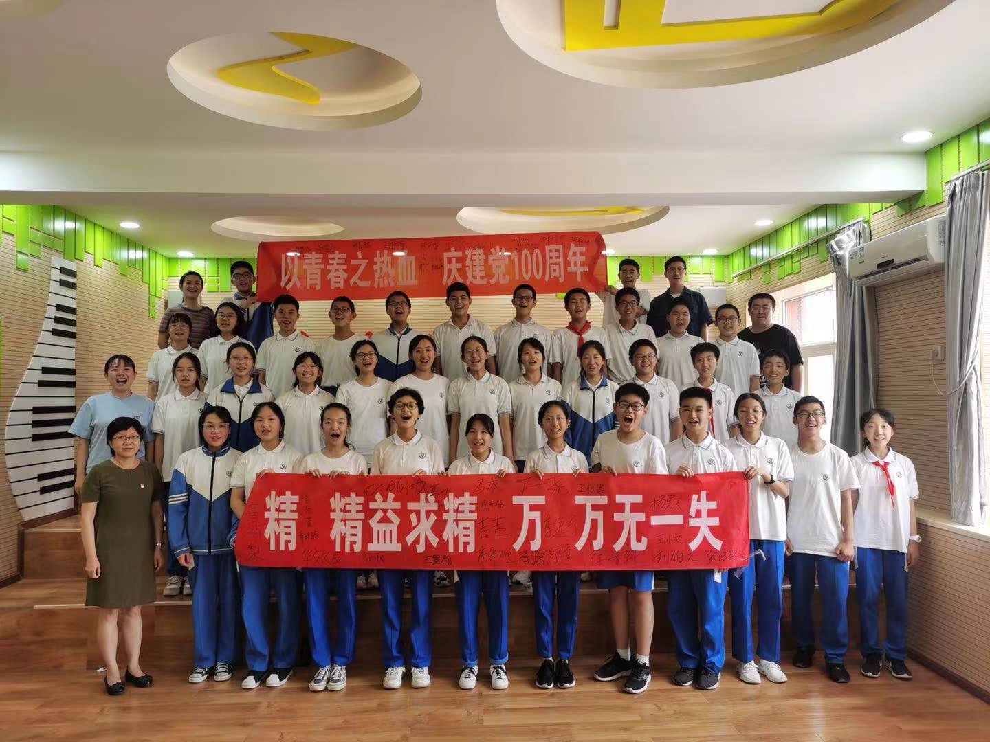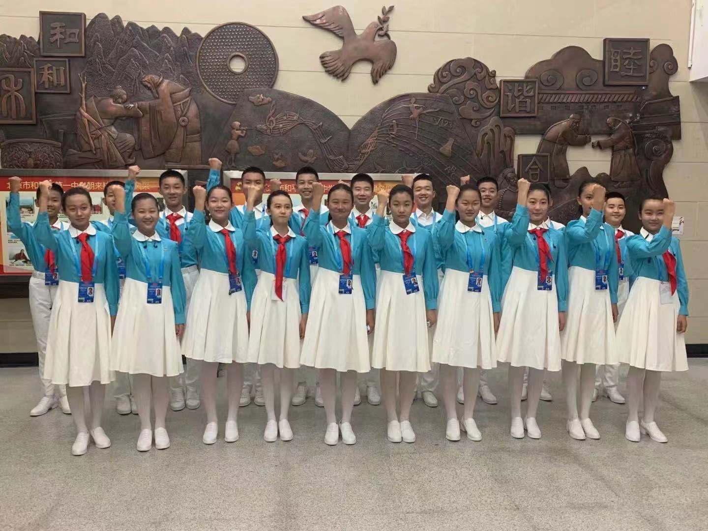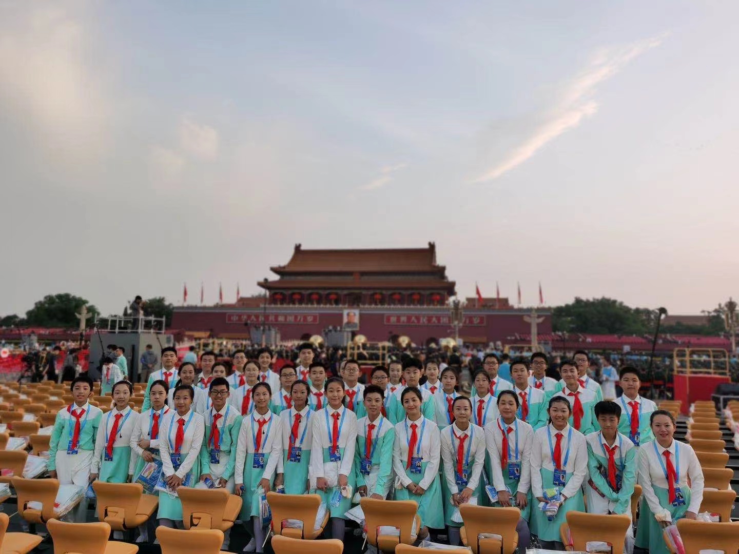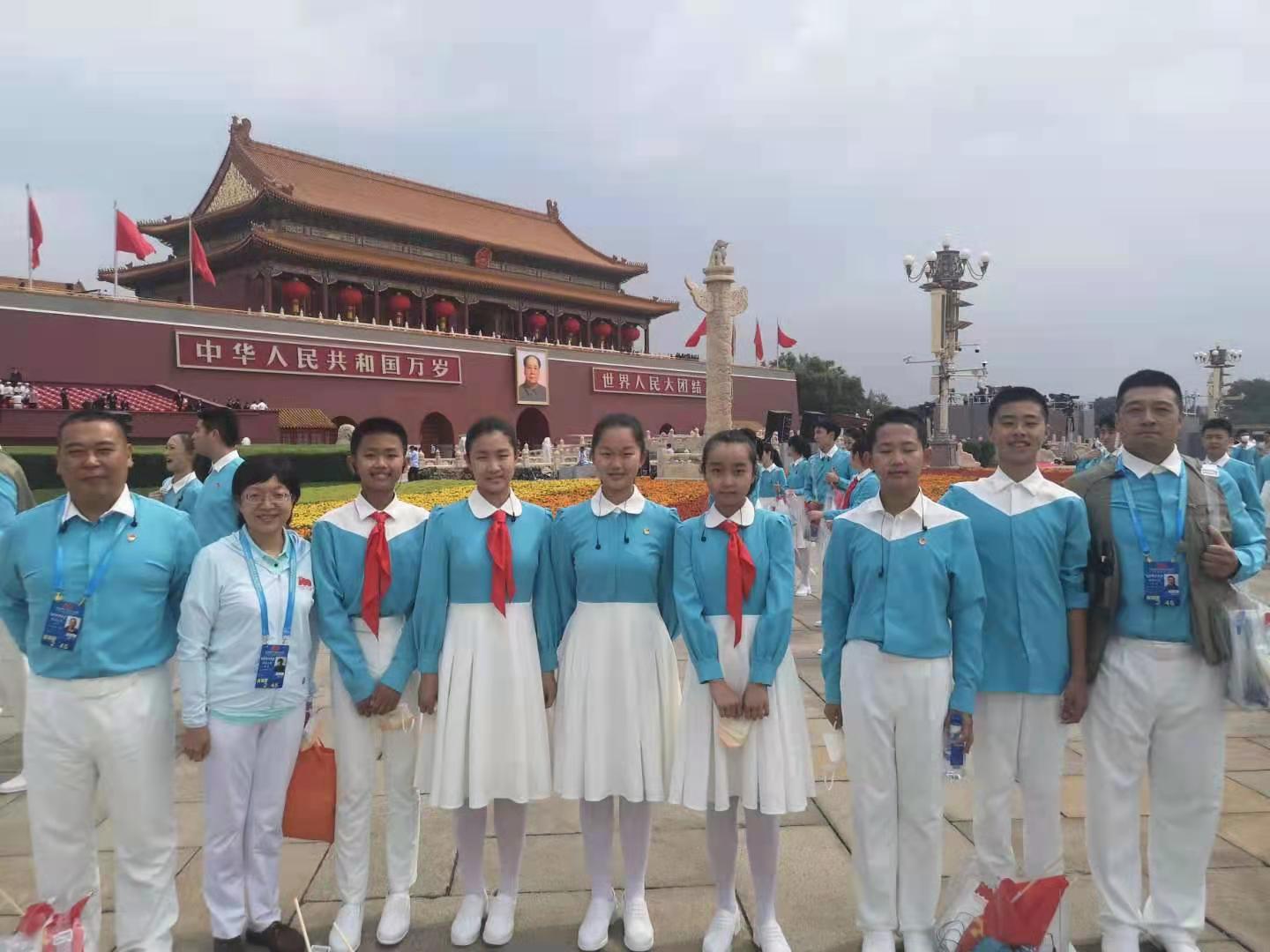 100多个日夜,在合唱团房子维主任、朱舒曼老师、石权老师、郝鑫老师、夏曼青老师,献词团张东辉主任、刘宏顺老师、孟葛老师以及全体学生的共同努力下,在所有家长的大力支持下,和一师生无一人掉队,大家一起见证了北京从初春到炎夏,一起度过了难忘的每一天,一起看到了天安门的圆月,一起高喊‘我爱你中国’,精精益求精,万万无一失,圆满完成了各项训练任务。