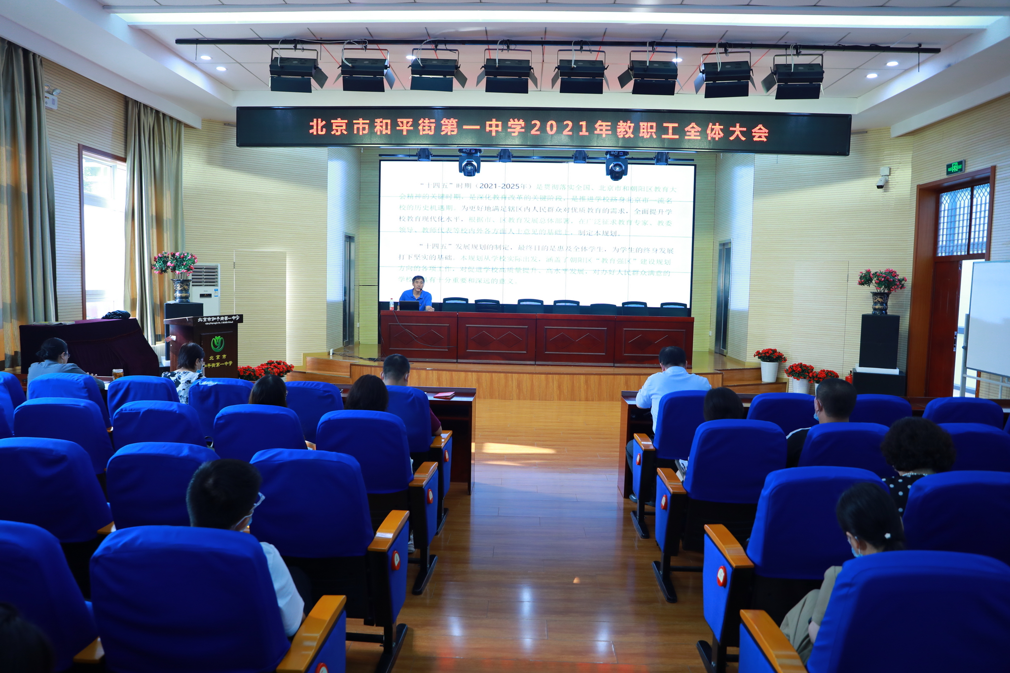 会上,首先由党总支书记张静、校区主管副校长曹成勇为新学年学校聘任的校级领导、中层干部、教研组长、年级组长、导师带教师傅颁发聘书。之后,曹成勇副校长就《北京市和平街第一中学教育集团“十四五”发展规划》进行了解读,就学校的“和合”教育哲学、“和合”文化、“和合”办学理念进行了详细阐释,就学校办学规模、队伍情况、办学成果、存在问题进行了细致分析,并就十四五期间学校发展目标及教育教学各项工作实施策略进行了详细说明。曹成勇副校长还分别对《北京市和平街第一中学2021-2022学年度学校工作计划》《北京市和平街第一中学提高课堂教学质量、减轻学生作业负担实施方案》进行了解读,并提出了具体工作要求。张习文校助在会上对《北京市和平街第一中学2021-2022学年第一学期开学疫情防控工作方案》进行了解读,要求全体教职工高度重视疫情防控工作,认真做好开学前各项准备工作,确保秋季开学平安、顺利。