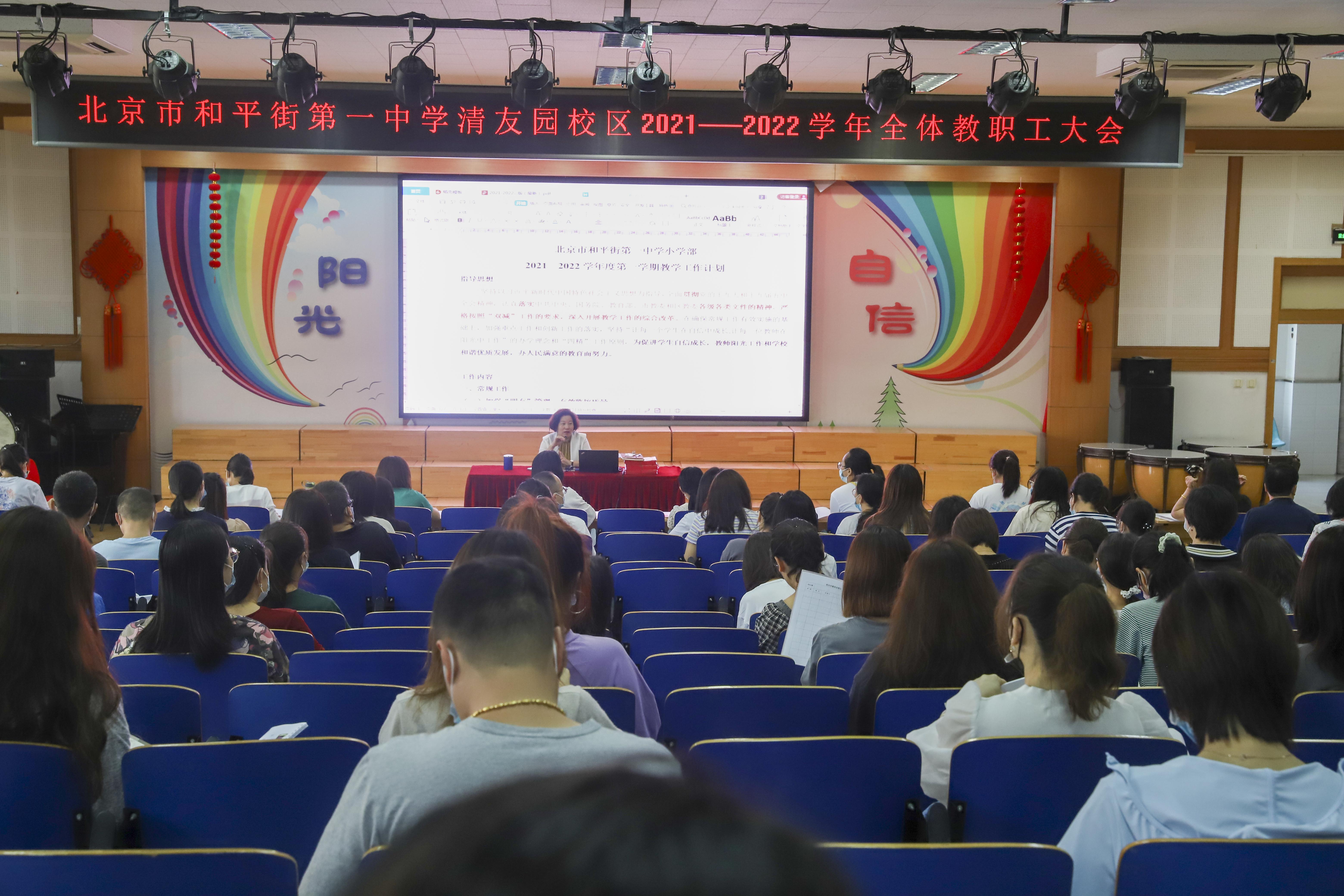 2021年8月30日上午,和平街一中清友园校区召开新学期全体教师大会。会议由校区主管校长殷桂萍主持,全体教师参加会议。