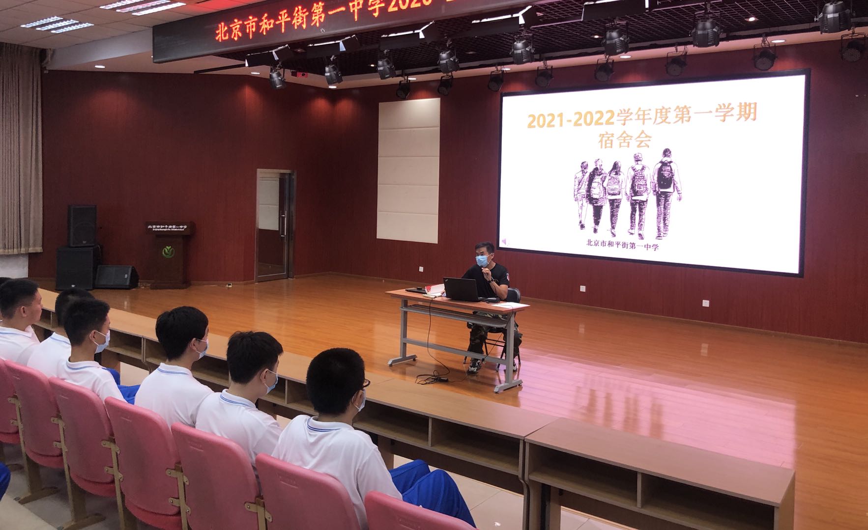 为了进一步规范学生宿舍管理,增强住宿生的安全意识、纪律意识、集体意识,创造一个安全、文明、舒适、整洁的住宿环境,2021年8月31日,北京市和平街第一中学莲葩园校区在五层阶梯教室召开了全体住宿生大学。莲葩园校区住宿生、宿舍教官以及学生发展处老师参加了此次会议。