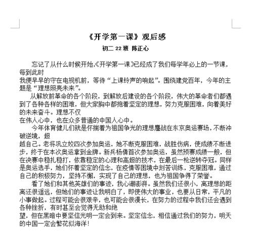 通过观看《开学第一课》,同学们受益匪浅。学校开展此次活动,不仅让学生经历了一次庄严的爱国洗礼,受到了深刻的爱国教育,产生了强烈的爱国情怀,而且使学生们认识到今天的幸福生活来之不易。