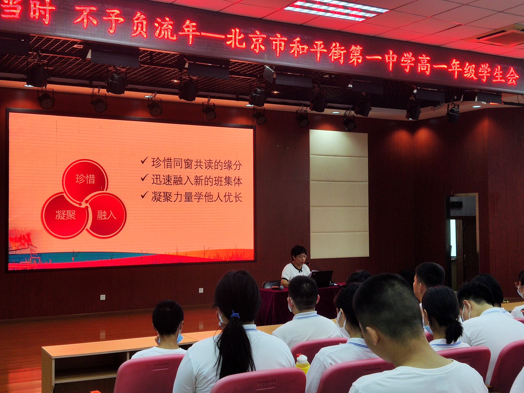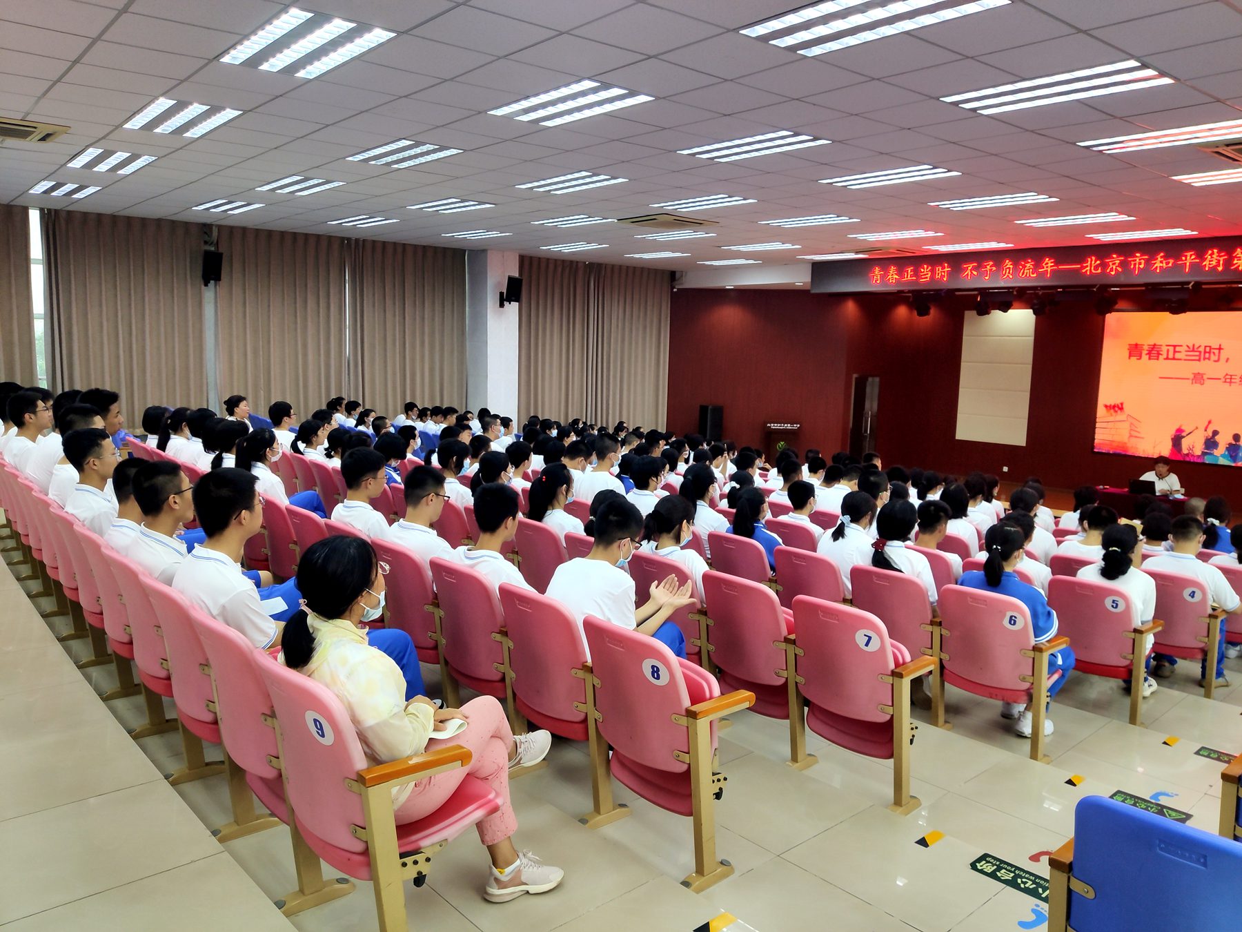 2021年9月2日下午16:30,莲葩园校区高一年级205名新生在五层阶梯教室召开了主题为“青春正当时,不予负流年”的学生会。学生会由年级组长程瑞芬老师主持。