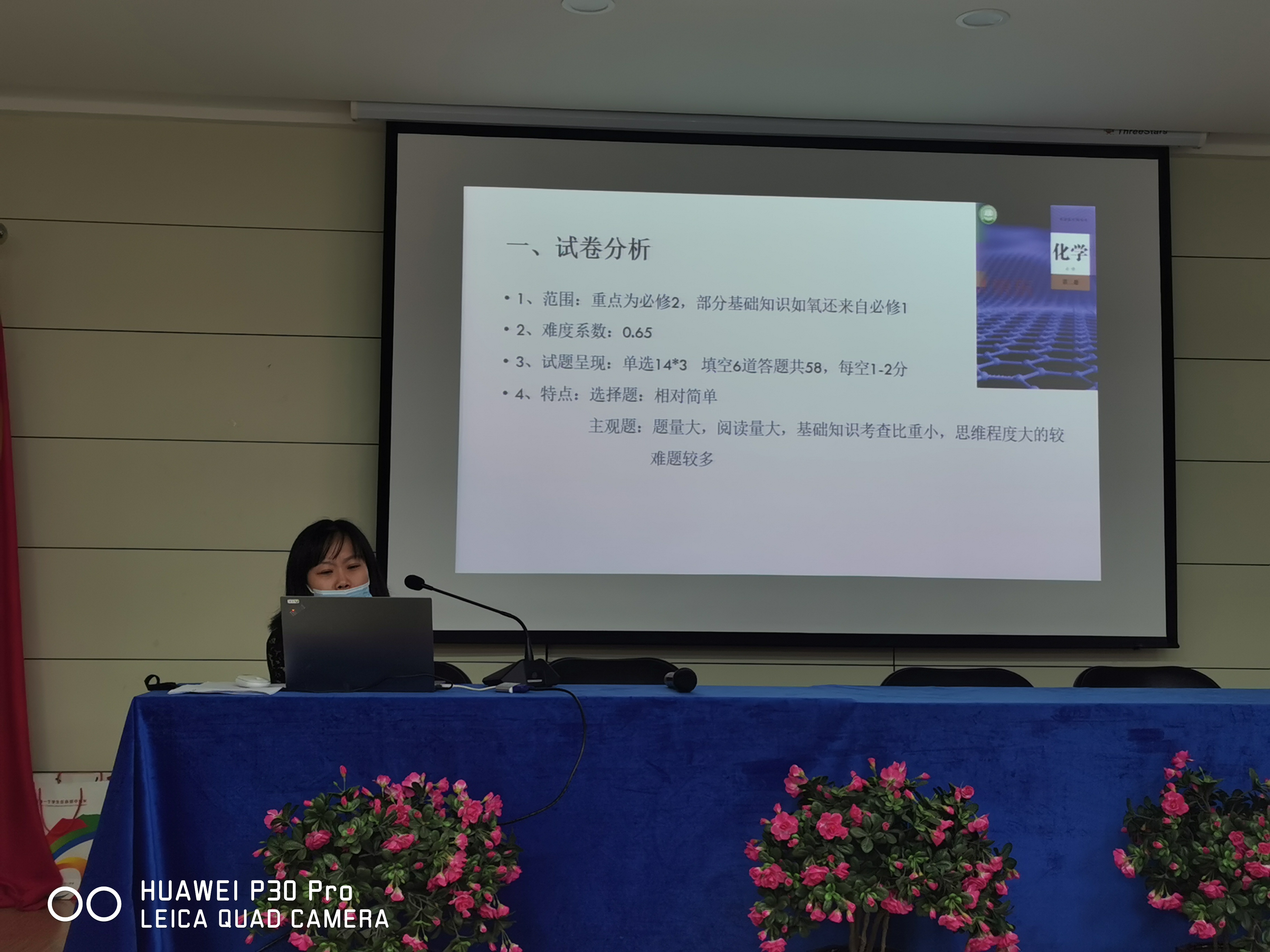 郑育竹老师代表化学备课组教师对期末考成绩进行分析总计。首先从考试难度、试卷结构入手,详细的分析学生的答题和得分情况,并对选考学生的成绩和区排位进行了纵向和横向的比对分析,找出了帮助学生分数提升的出路。