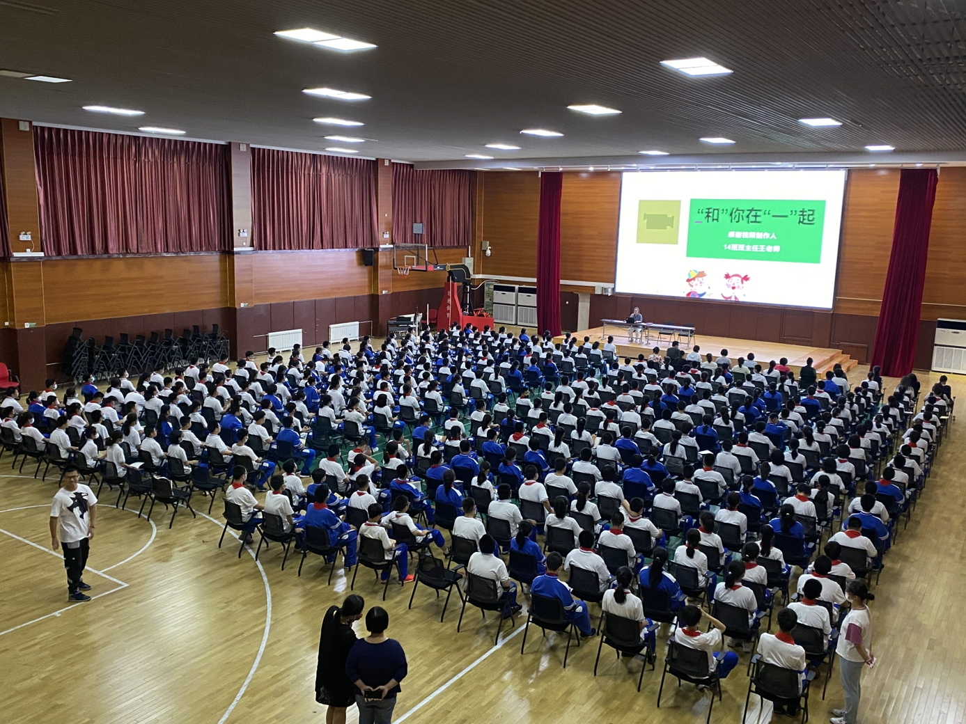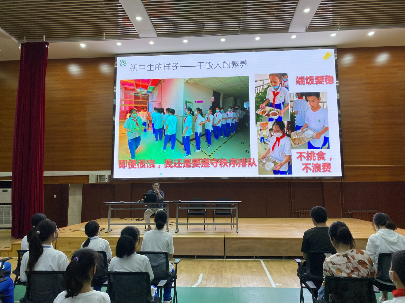 会上,刘老师首先介绍了和一朝来校区的初一教师队伍,这是一支团结奋进、业务精良、乐于奉献、富有爱心的团队,师资队伍雄厚。随后,刘老师介绍了初一同学们在开学七天以来的表现情况,包括晨读、午饭打餐、午休、队列以及课外活动等情况的介绍,对课堂上“如何听讲”作出明确的要求,以及表扬优秀班级的好习惯并要求大家以此为目标,严于律己。之后,展示初一9到18班的班级大合照、班级板报以及公众号,展现和一学子的风采。并表扬了各班获得优秀作业表彰的同学们。最后,对大家提出新的要求,在礼貌方面能团结同学,尊师敬友;课间有序活动;服装整洁清爽;午饭时整齐有序,节约粮食;作业提交快速准时;早读井然有序;上课时也遵循和一传统“抬头听课,低头写字”;自习时间能够自我管理,自主学习,最后希望各位同学更好的方向迈进。