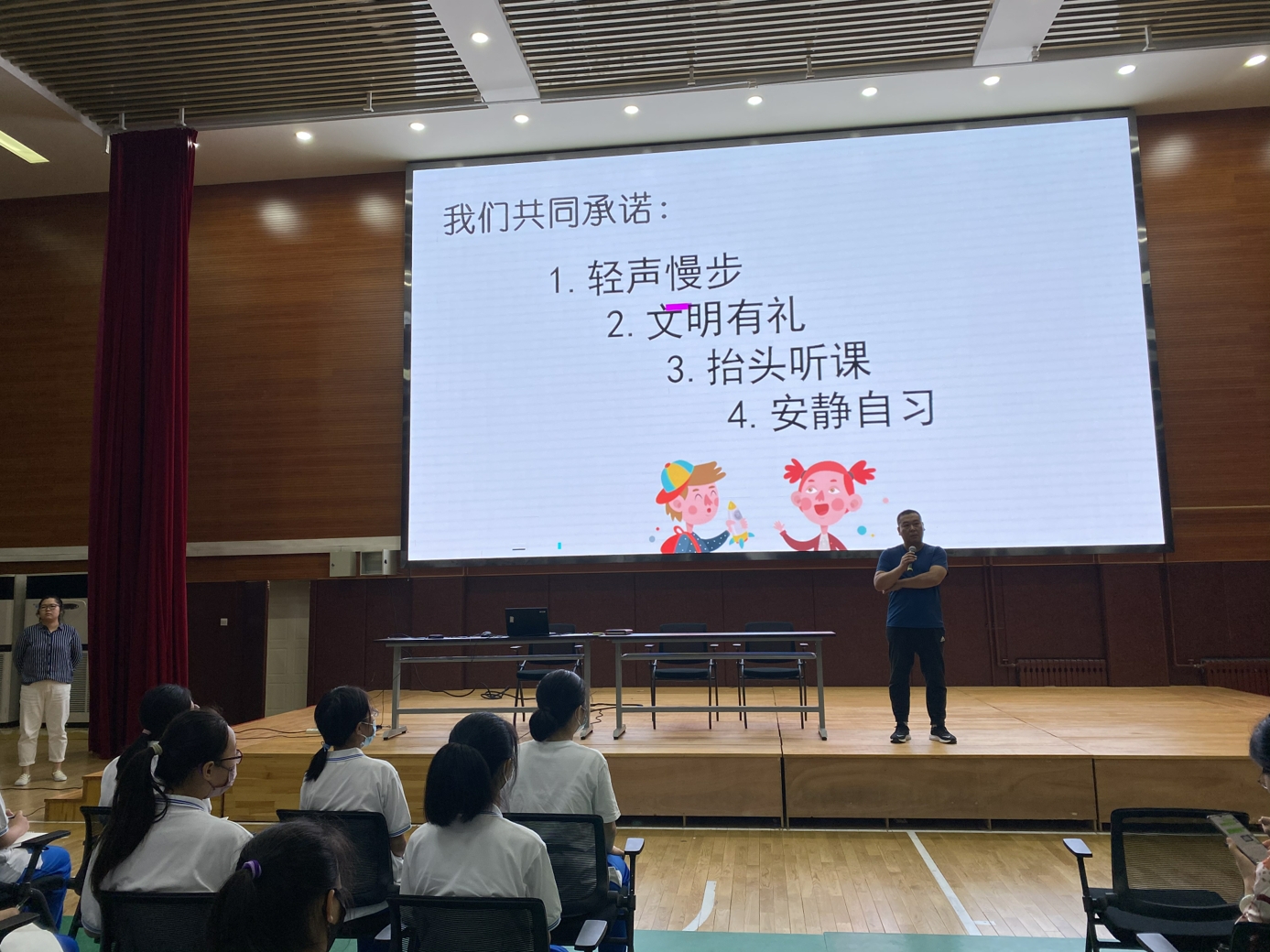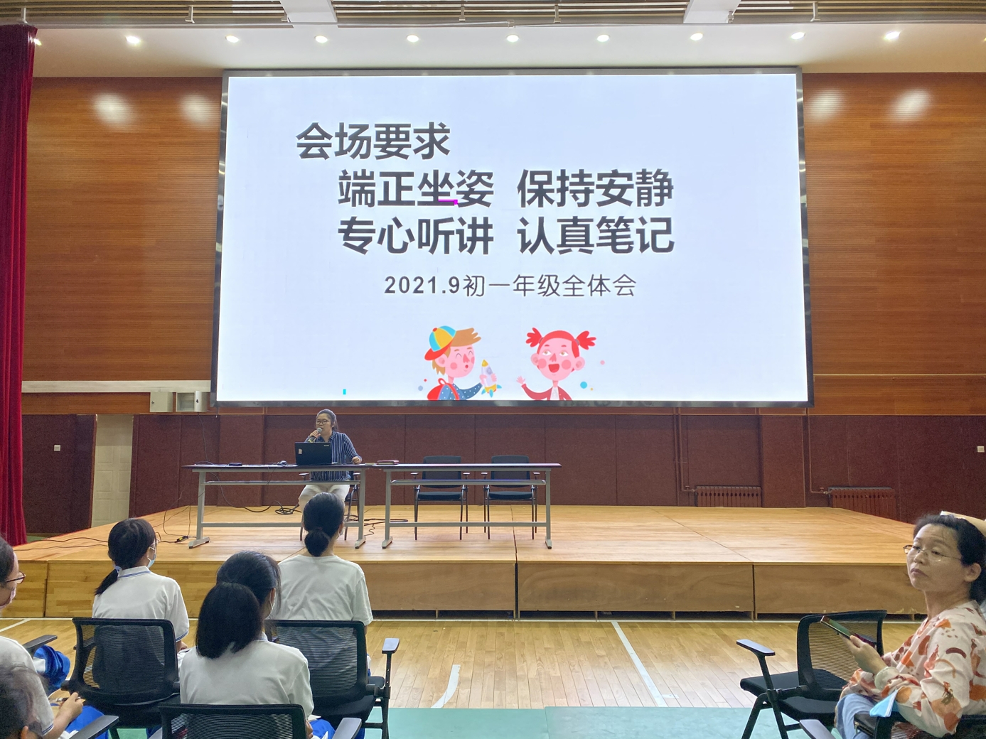 大会召开前,刘老师对本次大会纪律提出四点要求:端正坐姿,保持安静,专心听讲,认真笔记。
