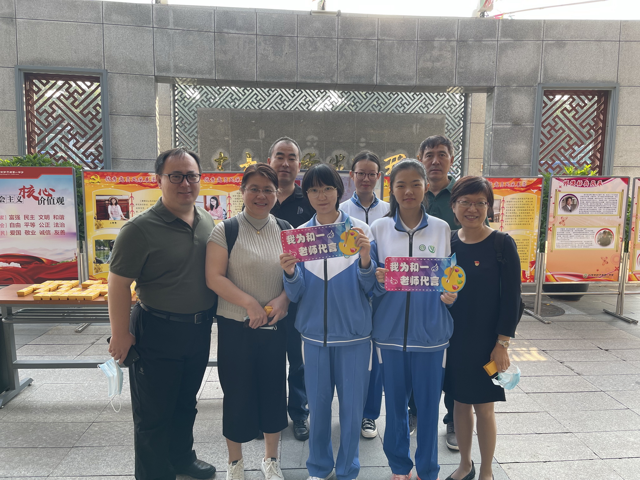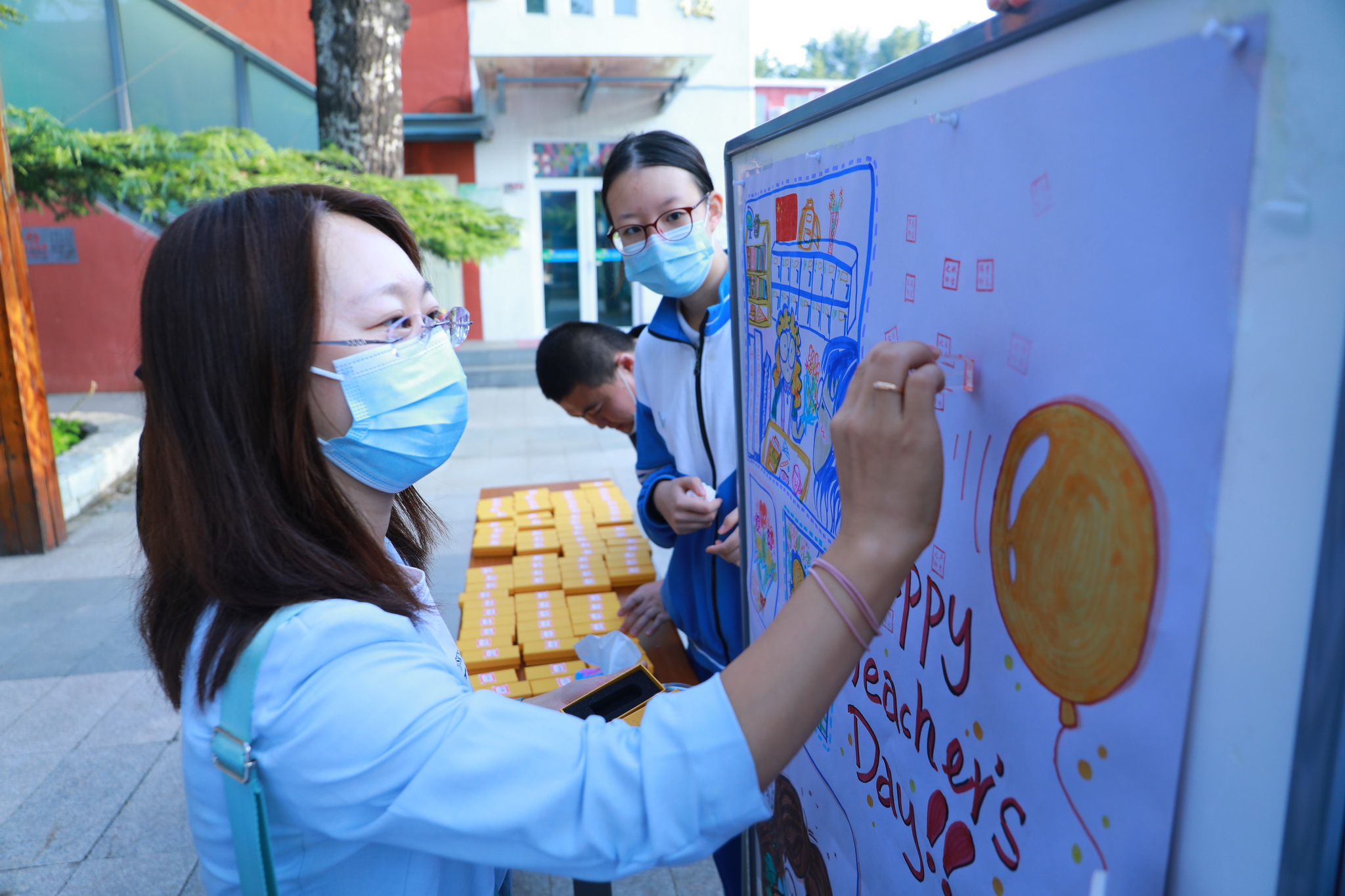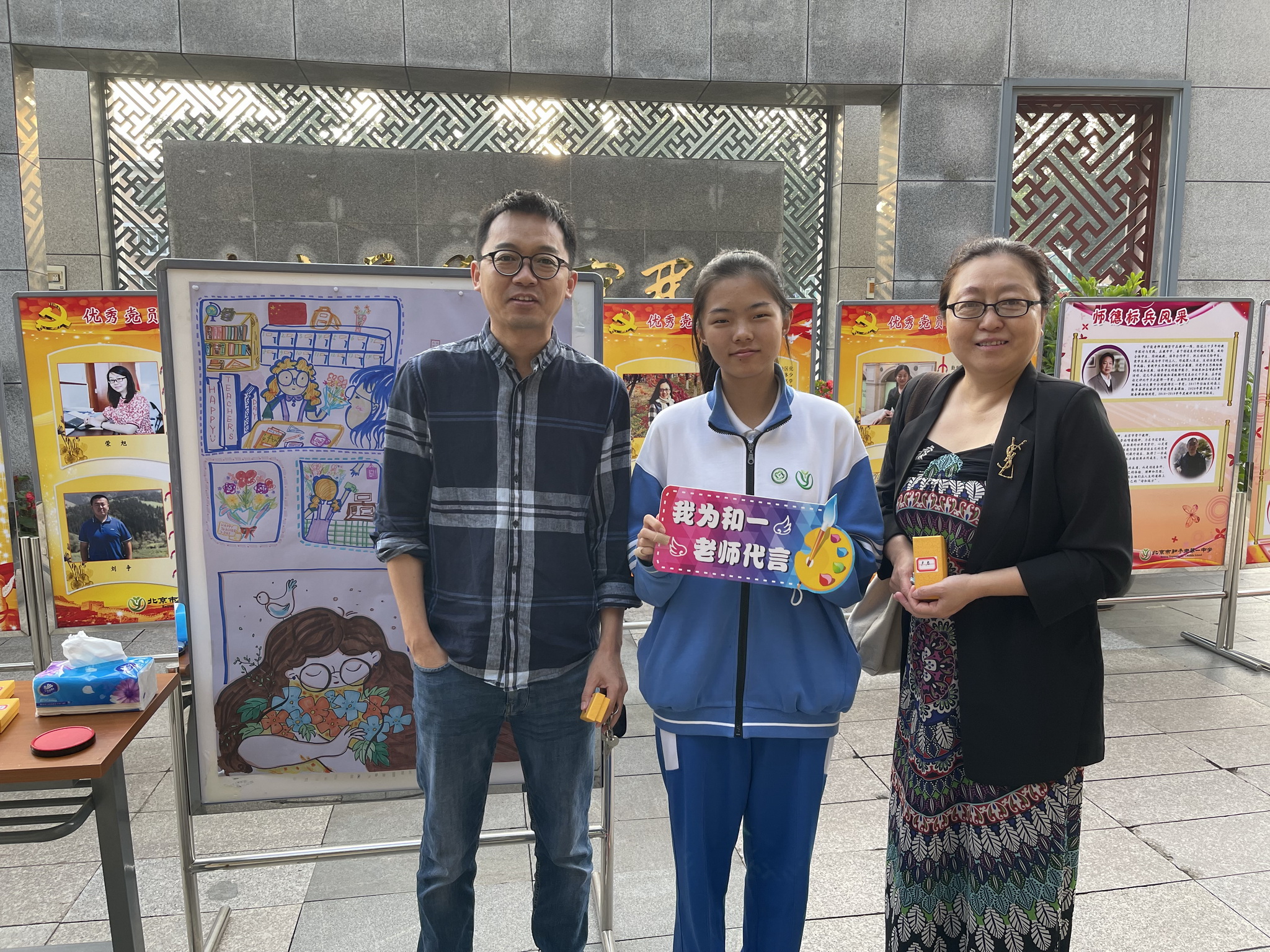 在校门口,老师们将签名章刻在学生亲手绘制的教师节祝福海报上。在郑重而温馨的仪式感中,老师们开启了崭新的一天。走进教学楼,LED滚动屏幕上显示的“赓续百年初心,担当育人使命”“老师,您好”“教师节快乐”等祝福语,更坚定了老师们的使命感。