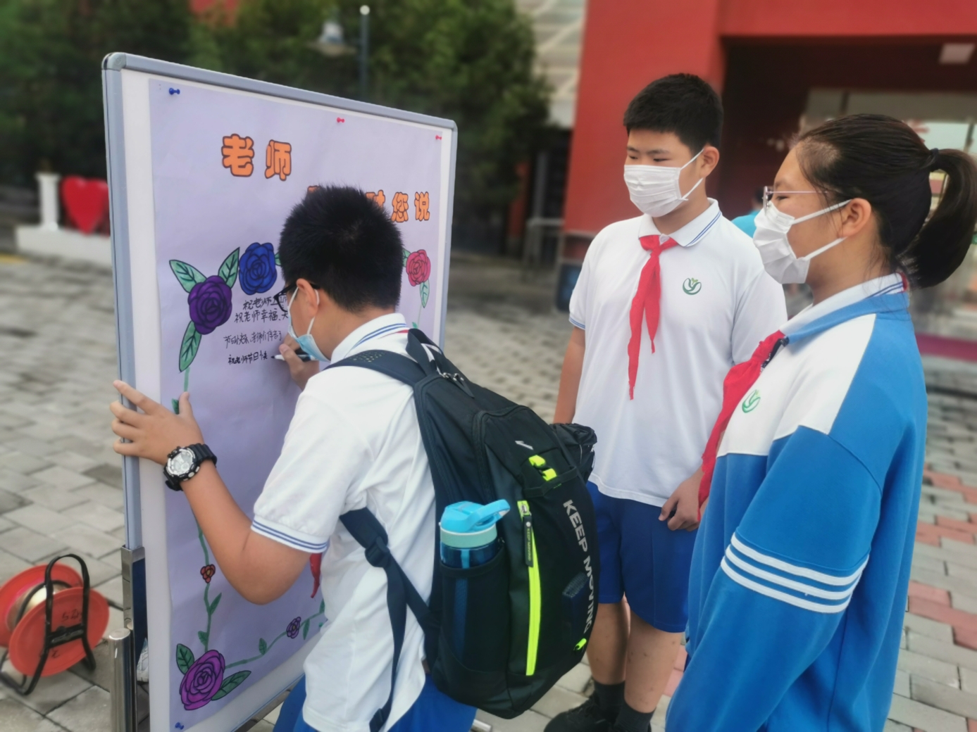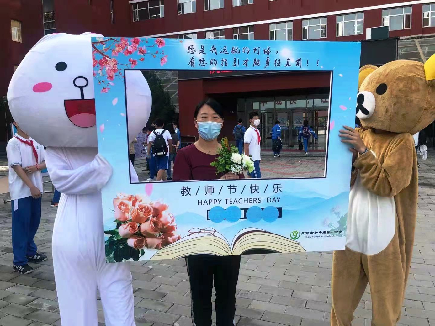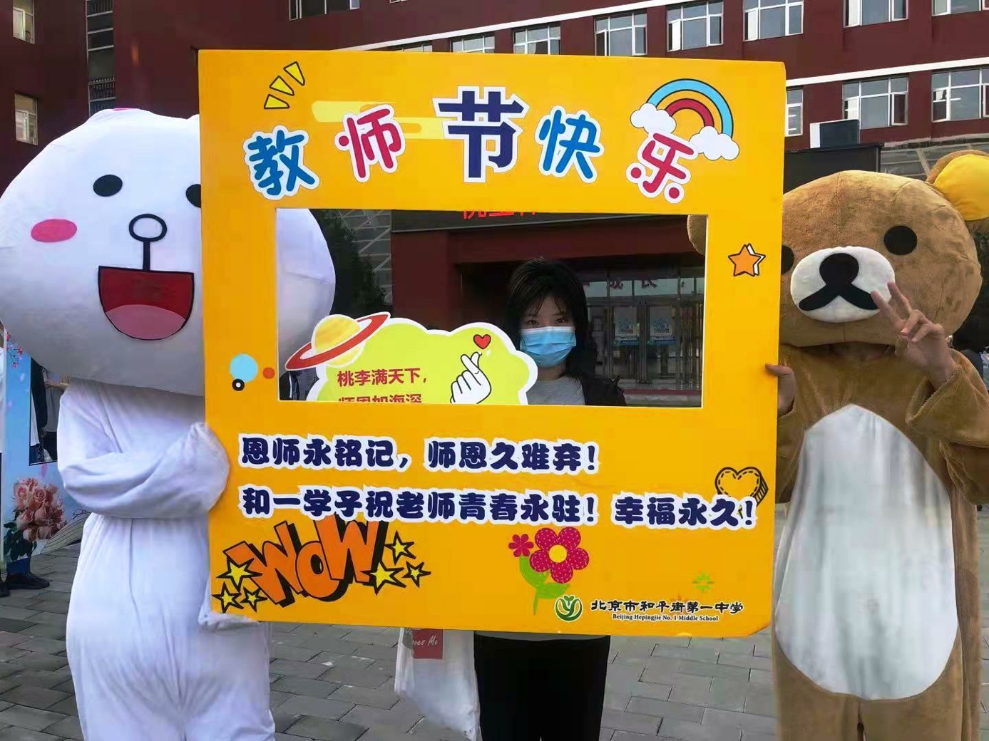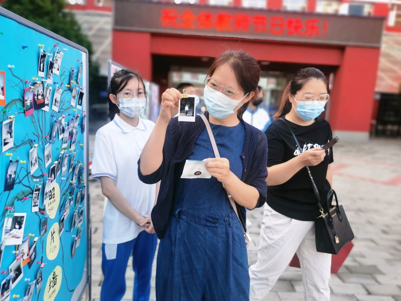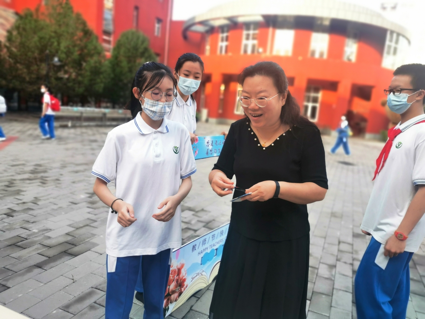 9月10日清晨,两位学生扮演的玩偶在学校小广场迎接师生的到来。同学们纷纷在“老师,我想对您说”区域留下对老师的节日祝福。老师们有的抽取“甜蜜礼包”,礼包里的喉糖和幸运小纸条让老师们会心一笑;有的驻足“最美身影照片墙”,开心的取下自己的专属相片;有的在“请留下您的心情”区域描绘出自己的节日心情;有的在拍照区跟学生和玩偶欢笑合影。师生们的欢声笑语伴随着美妙的歌声,现场沉浸在温暖人心的节日氛围中。