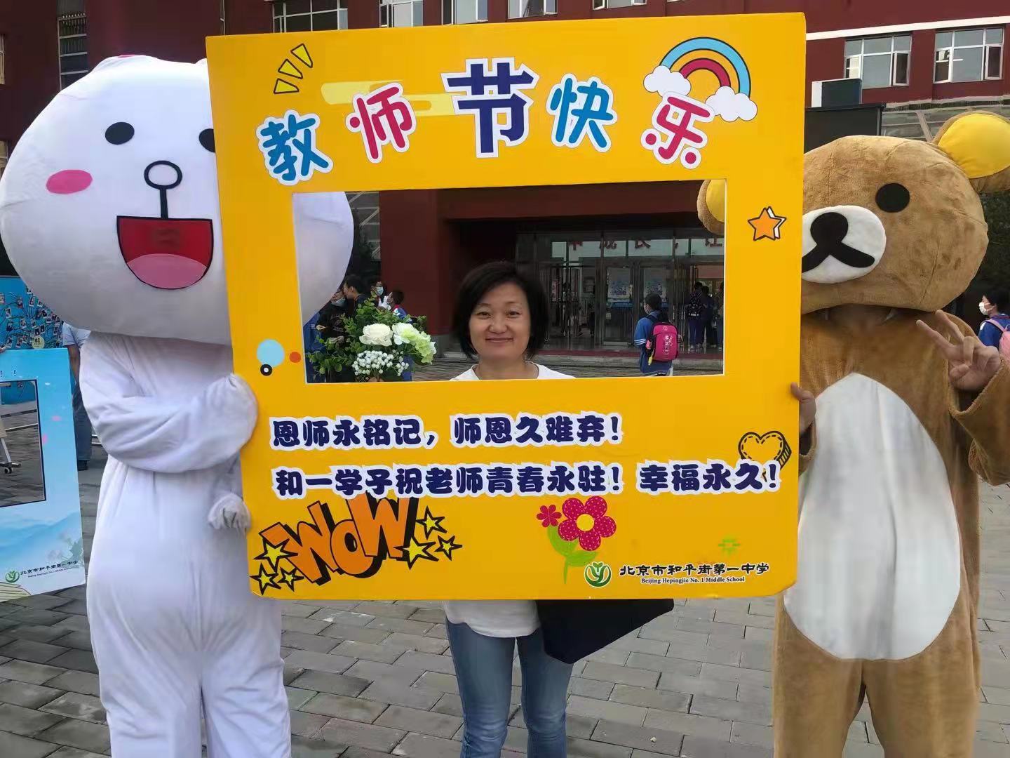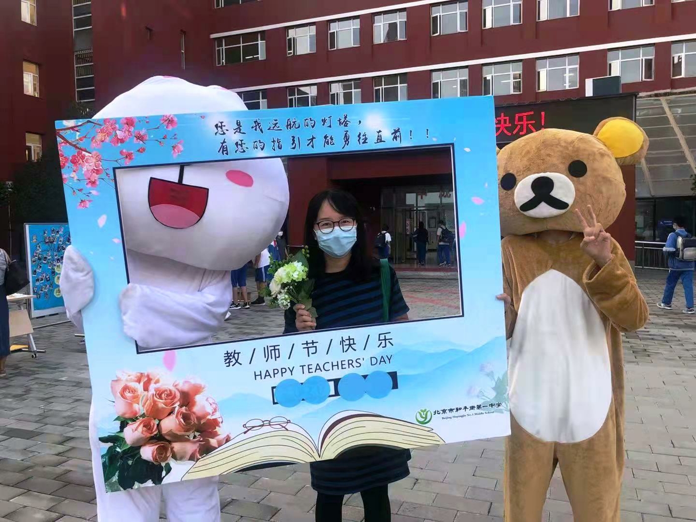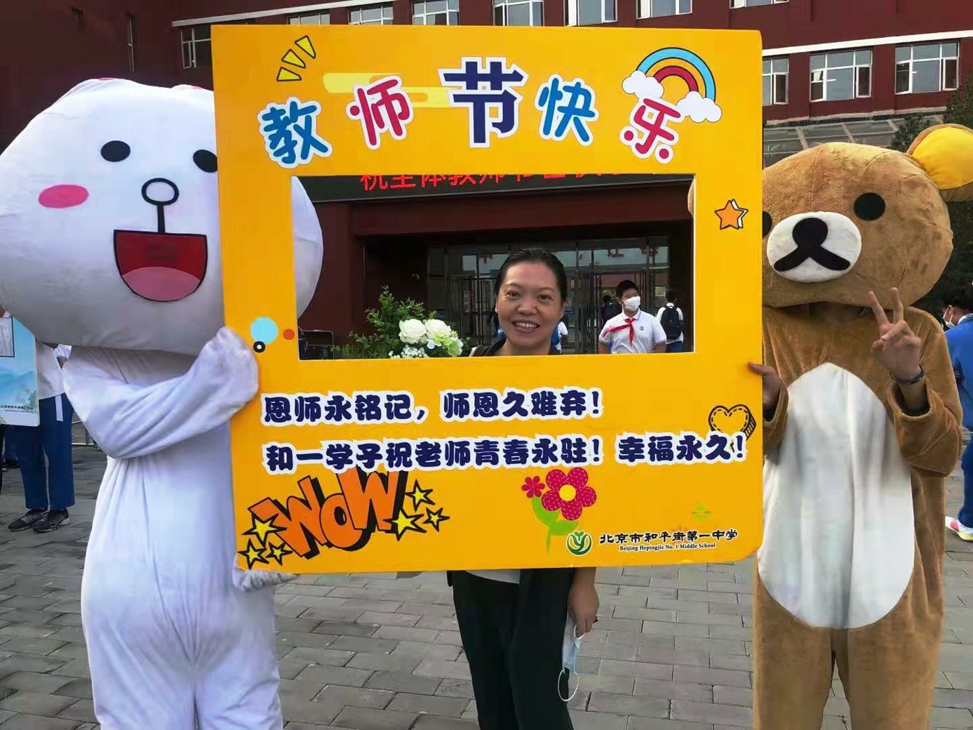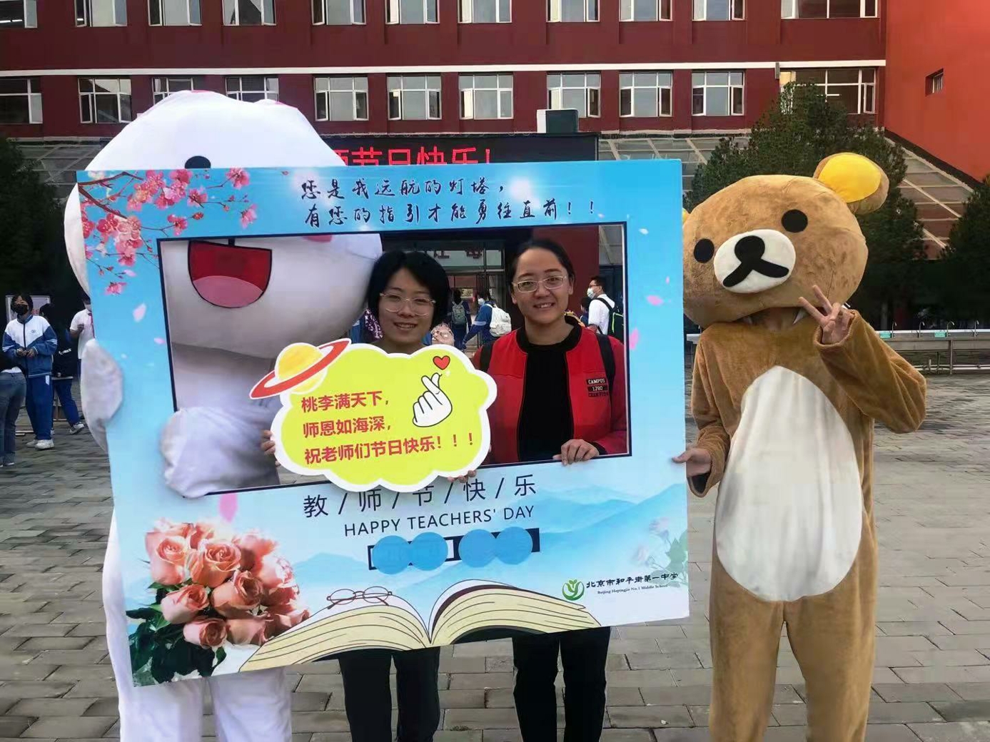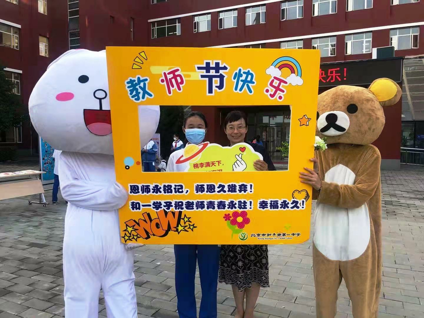 9月10日清晨,两位学生扮演的玩偶在学校小广场迎接师生的到来。同学们纷纷在“老师,我想对您说”区域留下对老师的节日祝福。老师们有的抽取“甜蜜礼包”,礼包里的喉糖和幸运小纸条让老师们会心一笑;有的驻足“最美身影照片墙”,开心的取下自己的专属相片;有的在“请留下您的心情”区域描绘出自己的节日心情;有的在拍照区跟学生和玩偶欢笑合影。师生们的欢声笑语伴随着美妙的歌声,现场沉浸在温暖人心的节日氛围中。