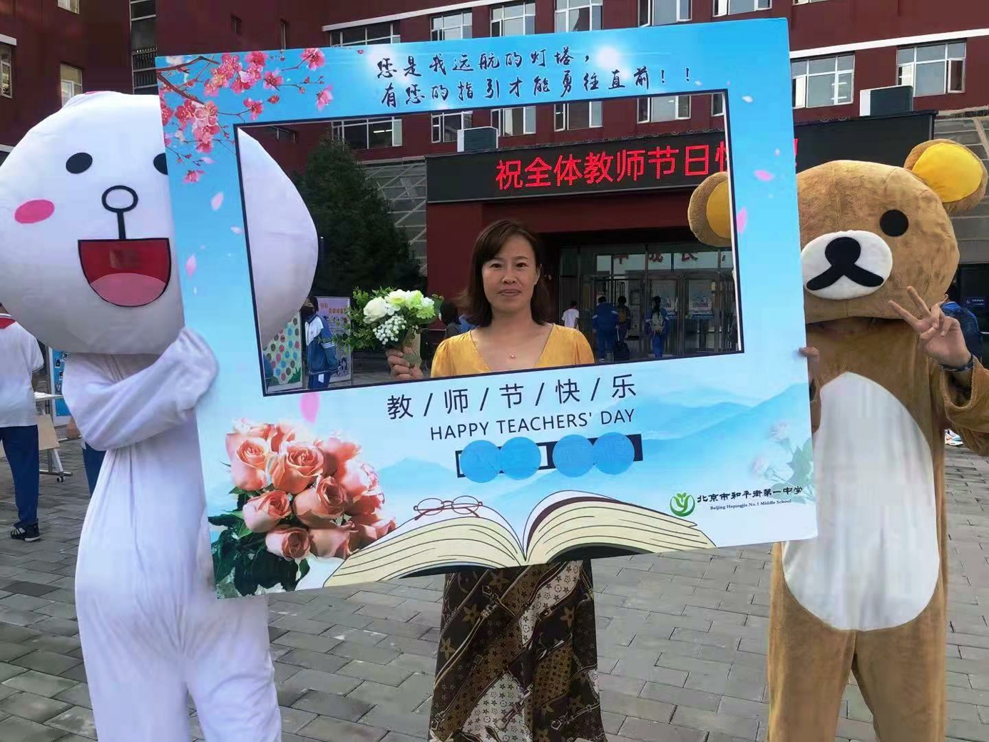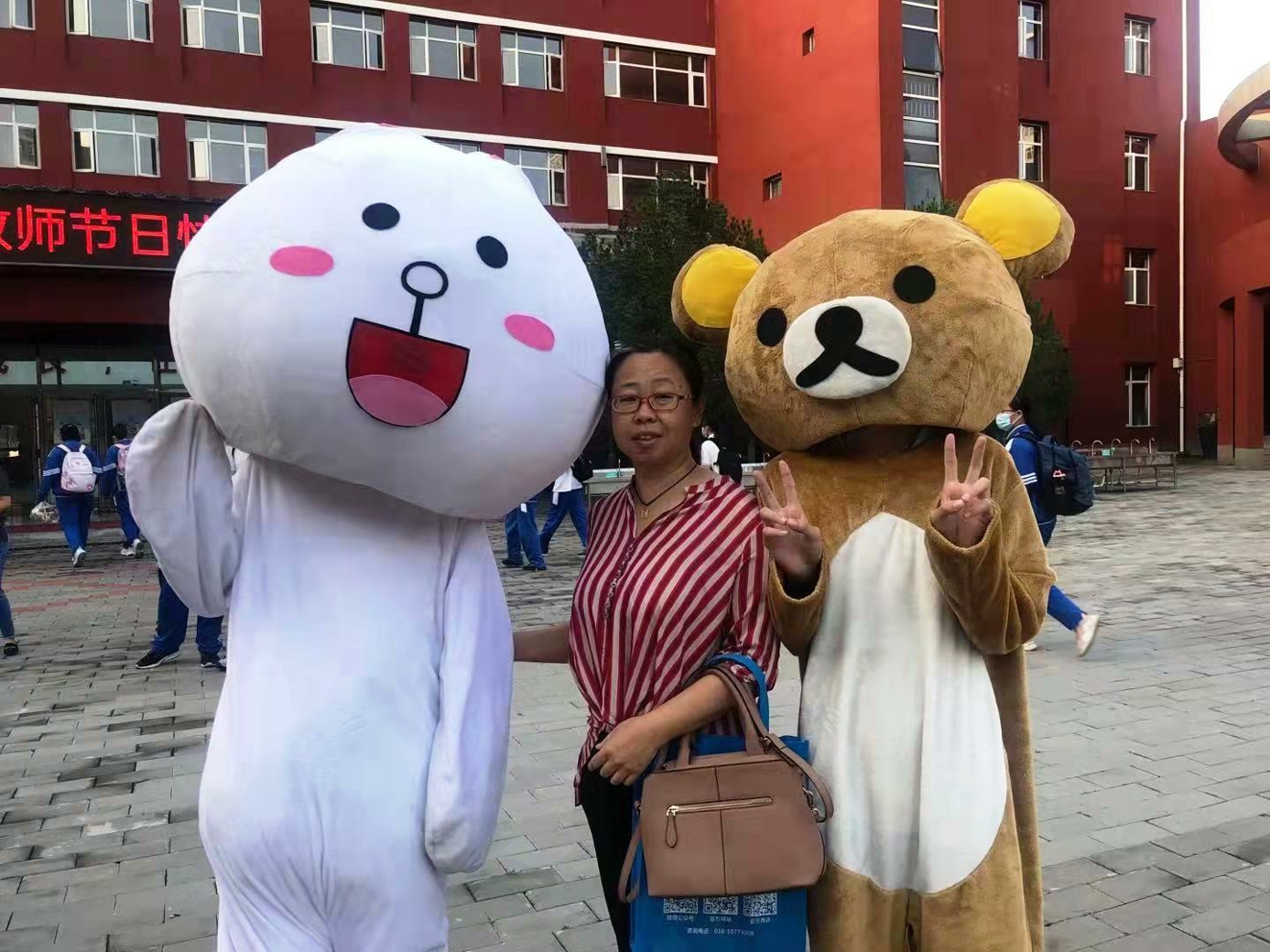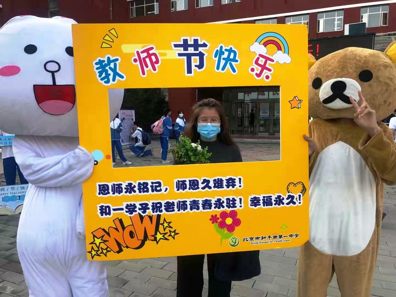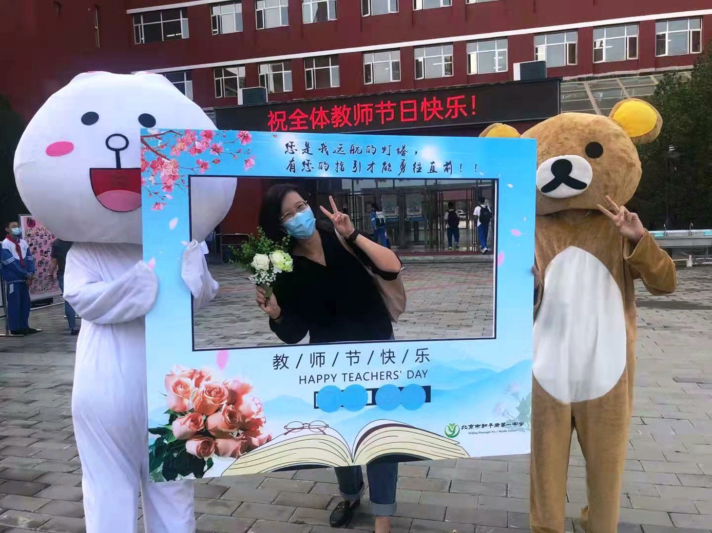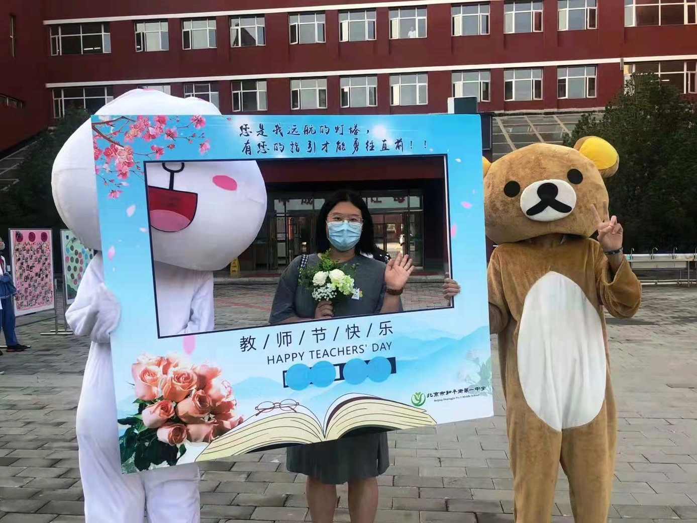 9月10日清晨,两位学生扮演的玩偶在学校小广场迎接师生的到来。同学们纷纷在“老师,我想对您说”区域留下对老师的节日祝福。老师们有的抽取“甜蜜礼包”,礼包里的喉糖和幸运小纸条让老师们会心一笑;有的驻足“最美身影照片墙”,开心的取下自己的专属相片;有的在“请留下您的心情”区域描绘出自己的节日心情;有的在拍照区跟学生和玩偶欢笑合影。师生们的欢声笑语伴随着美妙的歌声,现场沉浸在温暖人心的节日氛围中。