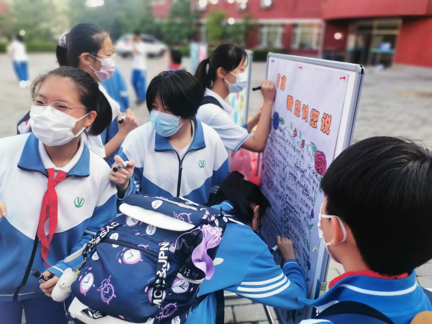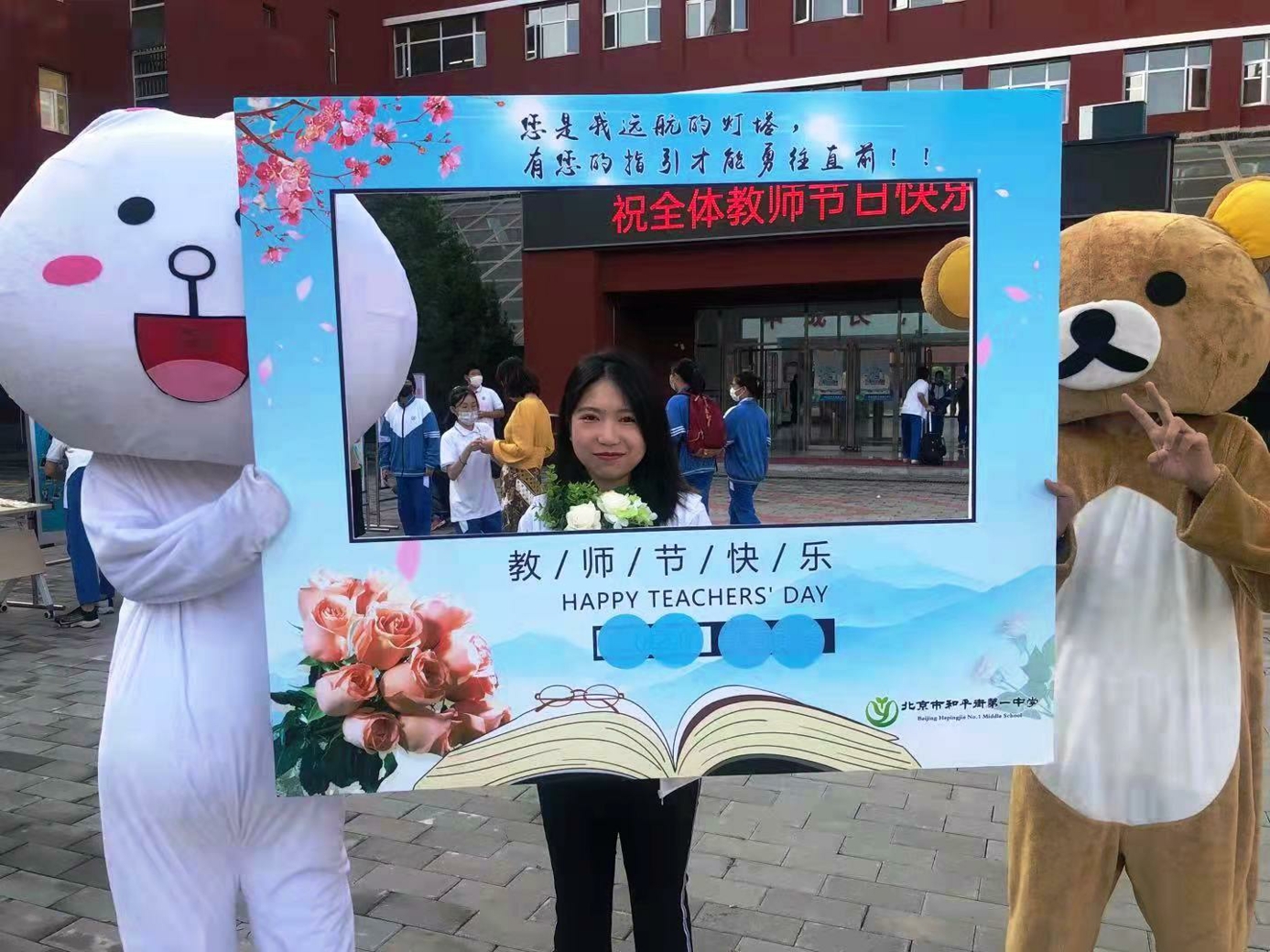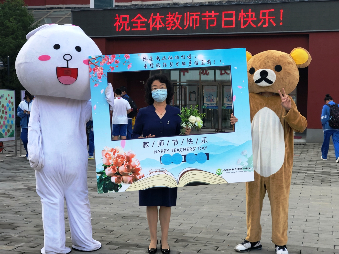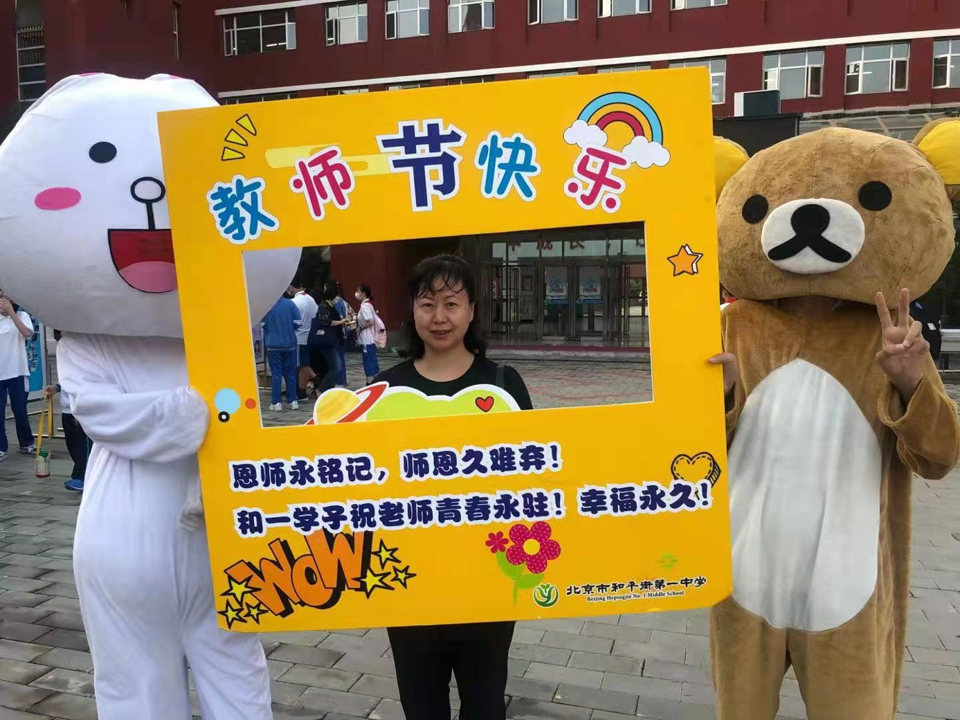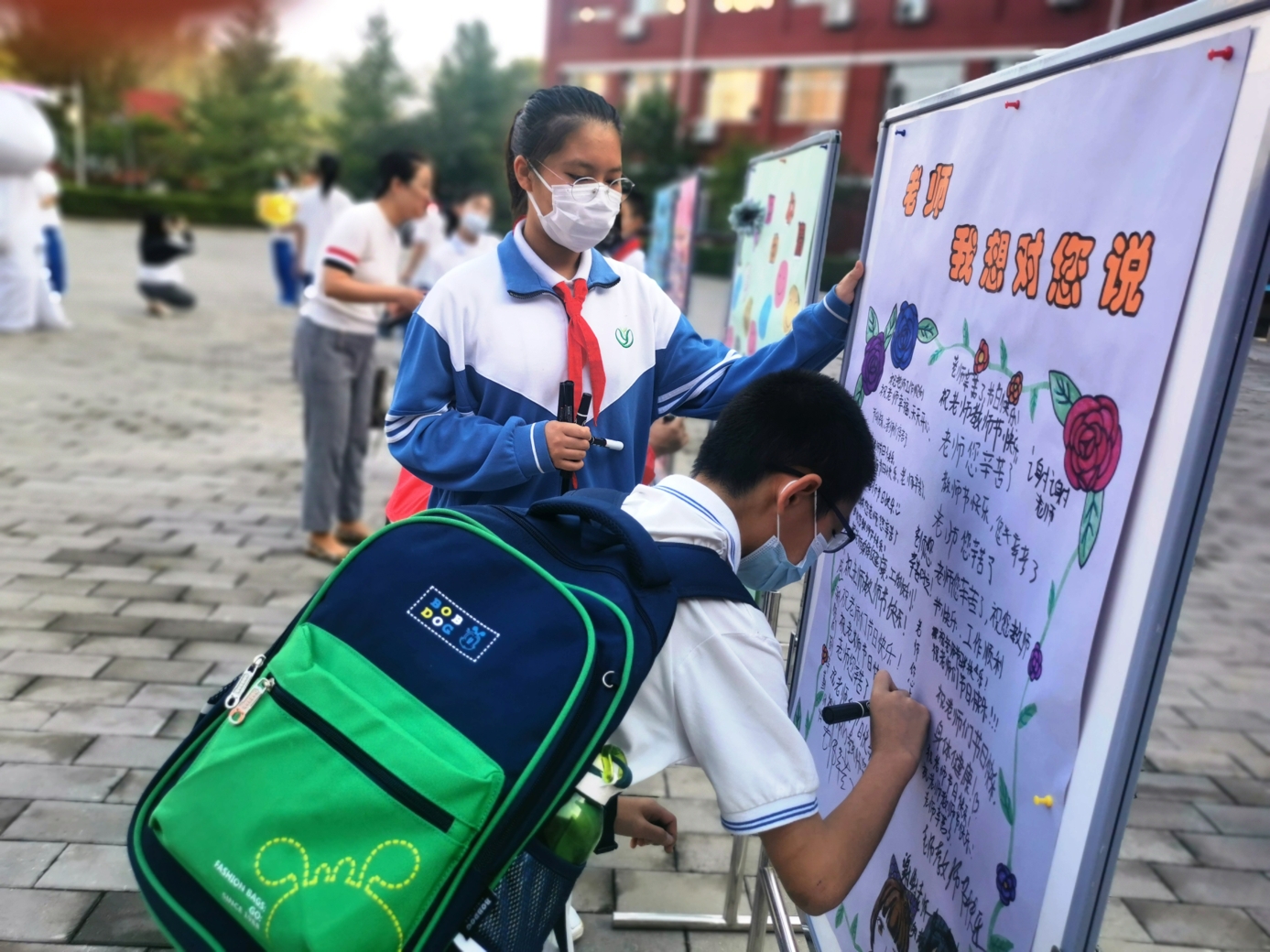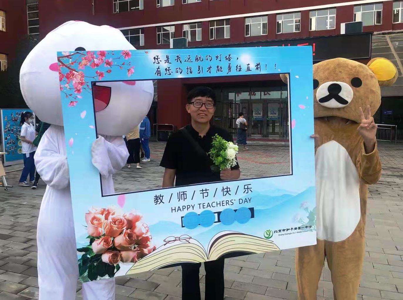 9月10日清晨,两位学生扮演的玩偶在学校小广场迎接师生的到来。同学们纷纷在“老师,我想对您说”区域留下对老师的节日祝福。老师们有的抽取“甜蜜礼包”,礼包里的喉糖和幸运小纸条让老师们会心一笑;有的驻足“最美身影照片墙”,开心的取下自己的专属相片;有的在“请留下您的心情”区域描绘出自己的节日心情;有的在拍照区跟学生和玩偶欢笑合影。师生们的欢声笑语伴随着美妙的歌声,现场沉浸在温暖人心的节日氛围中。