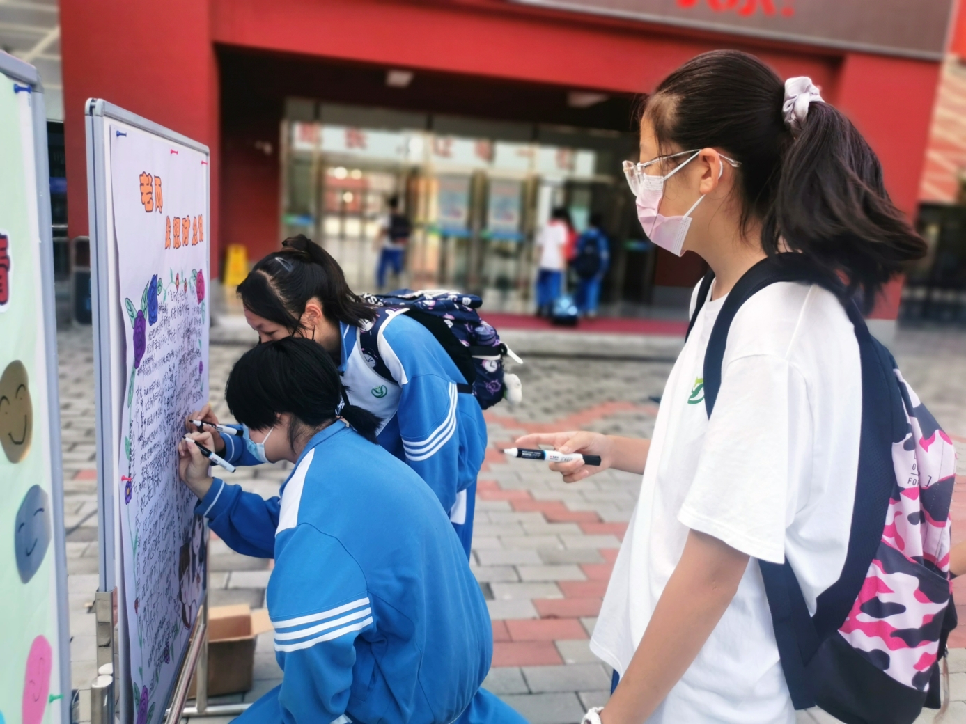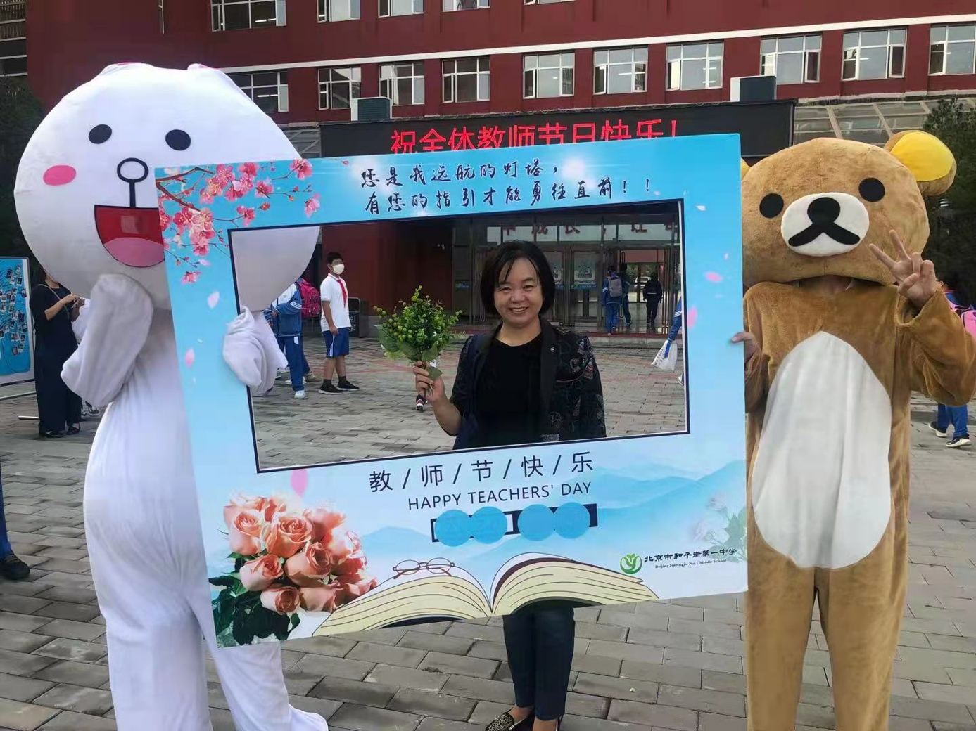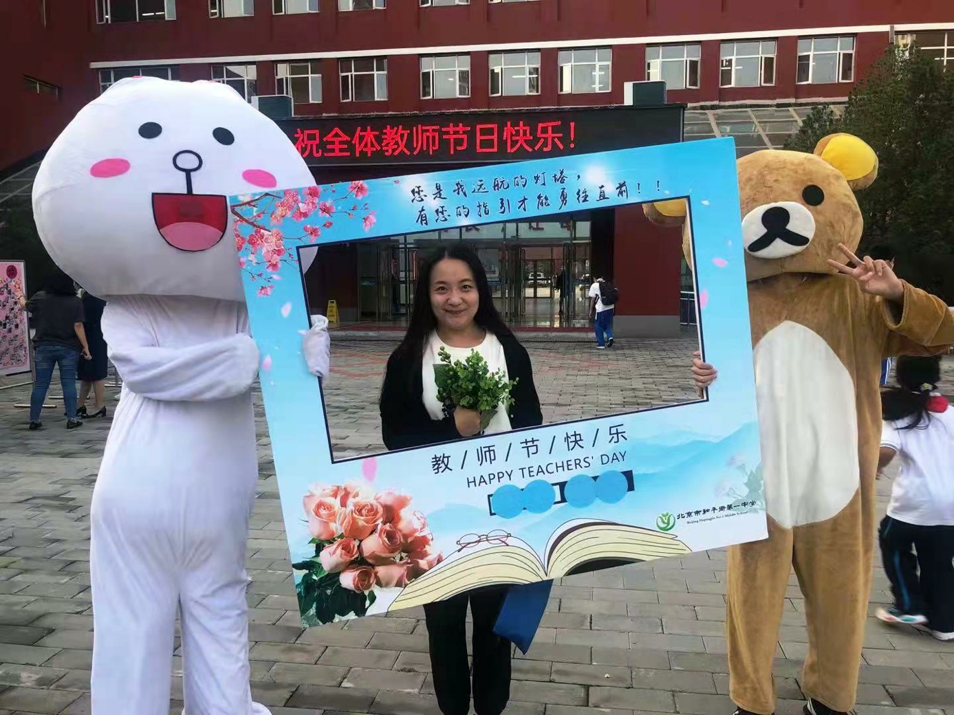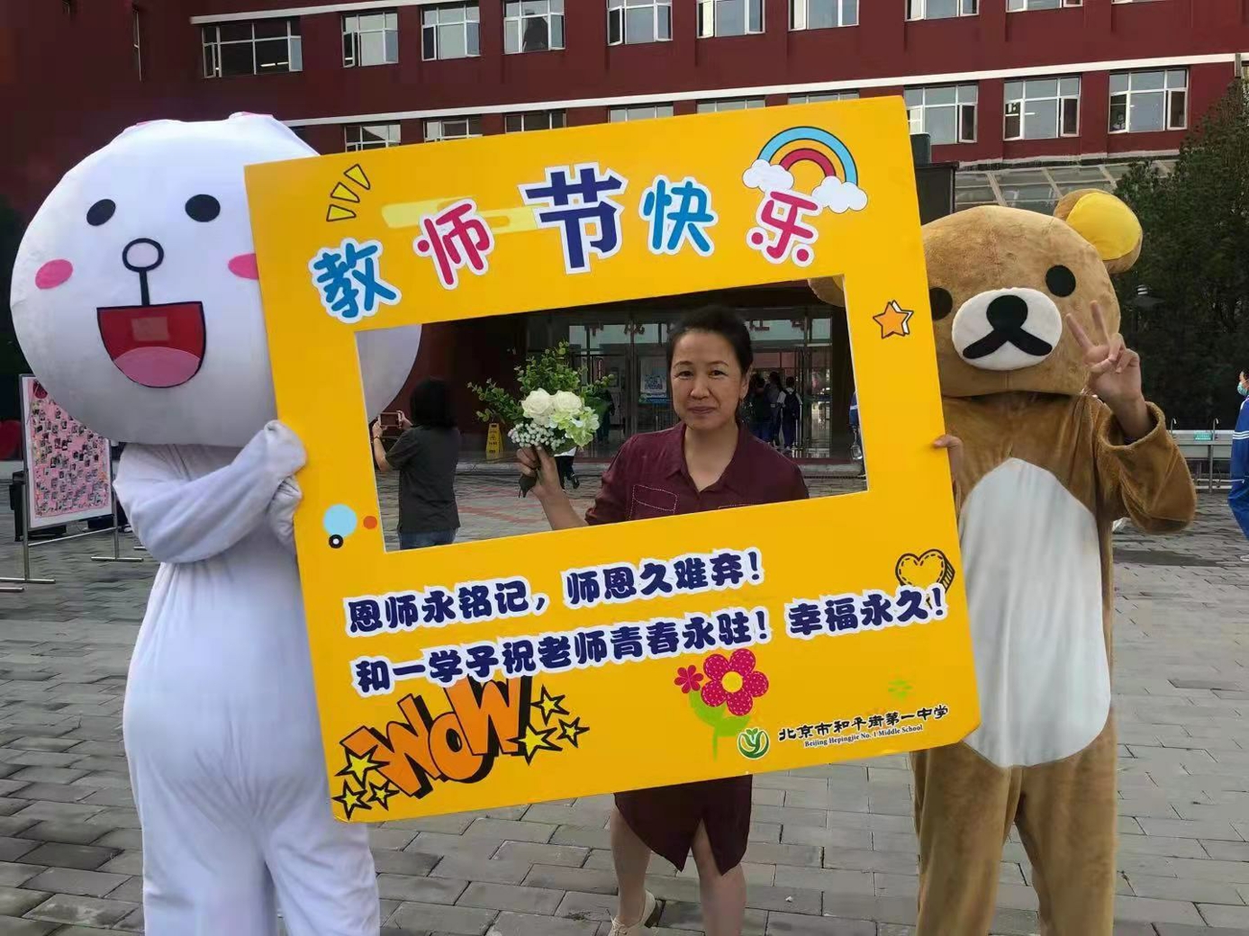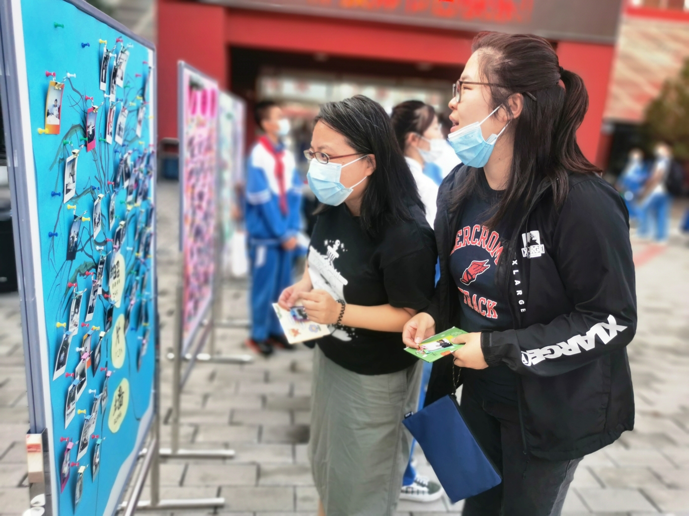 9月10日清晨,两位学生扮演的玩偶在学校小广场迎接师生的到来。同学们纷纷在“老师,我想对您说”区域留下对老师的节日祝福。老师们有的抽取“甜蜜礼包”,礼包里的喉糖和幸运小纸条让老师们会心一笑;有的驻足“最美身影照片墙”,开心的取下自己的专属相片;有的在“请留下您的心情”区域描绘出自己的节日心情;有的在拍照区跟学生和玩偶欢笑合影。师生们的欢声笑语伴随着美妙的歌声,现场沉浸在温暖人心的节日氛围中。