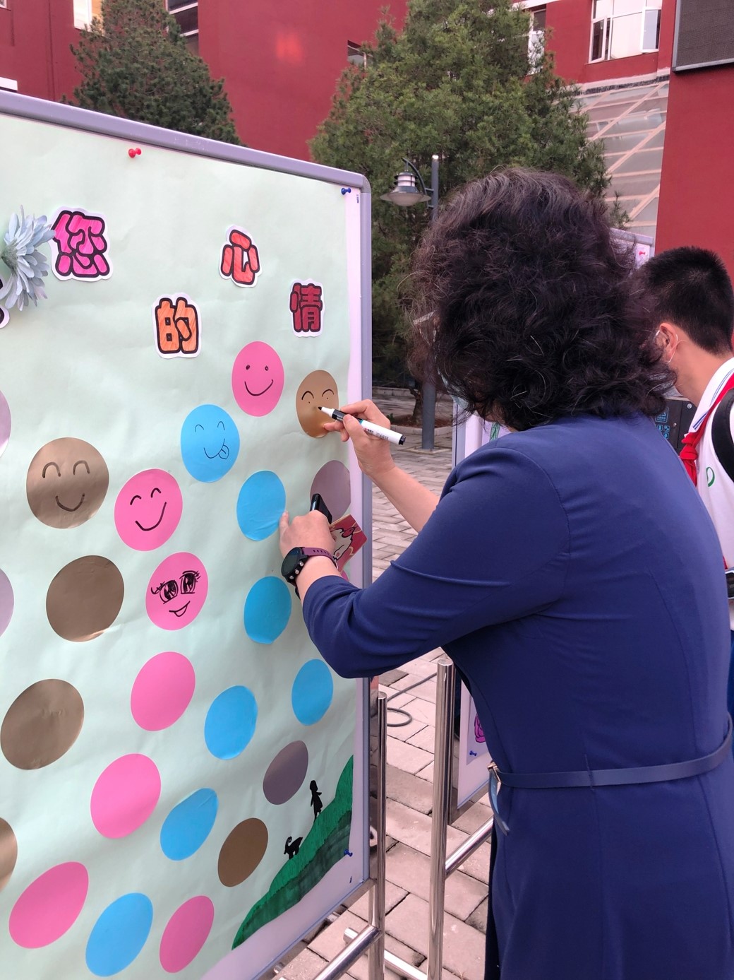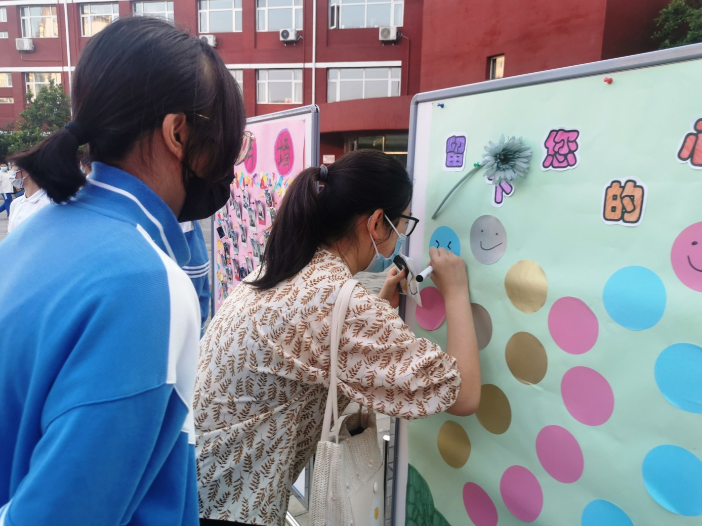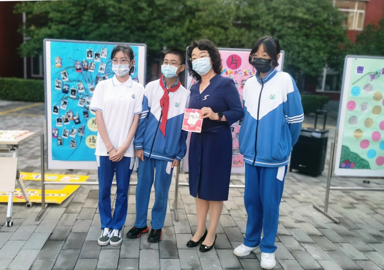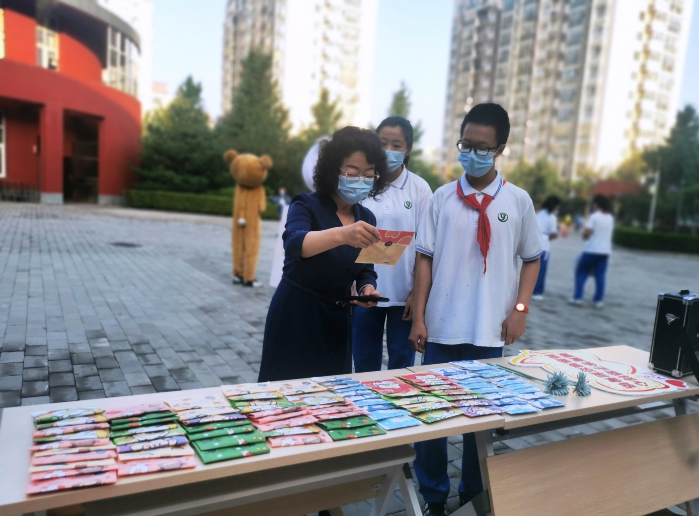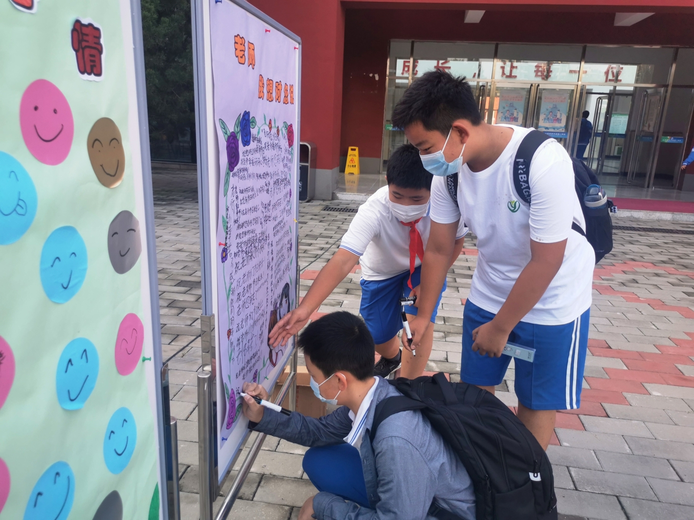 9月10日清晨,两位学生扮演的玩偶在学校小广场迎接师生的到来。同学们纷纷在“老师,我想对您说”区域留下对老师的节日祝福。老师们有的抽取“甜蜜礼包”,礼包里的喉糖和幸运小纸条让老师们会心一笑;有的驻足“最美身影照片墙”,开心的取下自己的专属相片;有的在“请留下您的心情”区域描绘出自己的节日心情;有的在拍照区跟学生和玩偶欢笑合影。师生们的欢声笑语伴随着美妙的歌声,现场沉浸在温暖人心的节日氛围中。