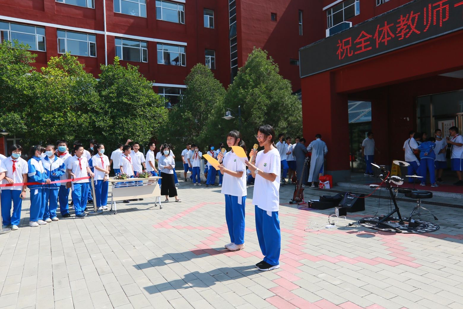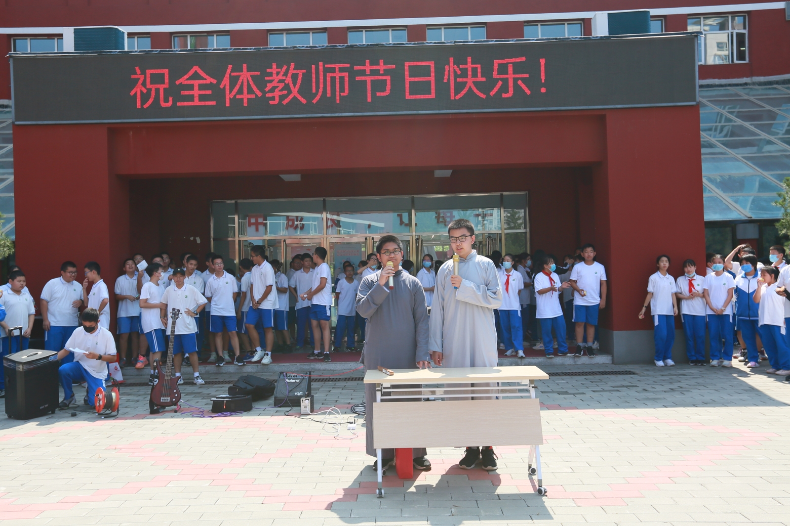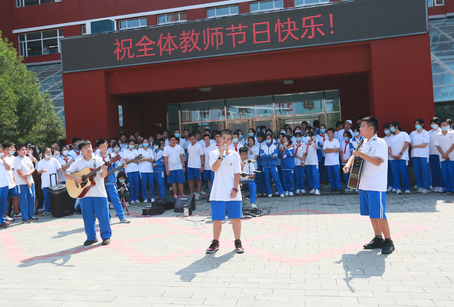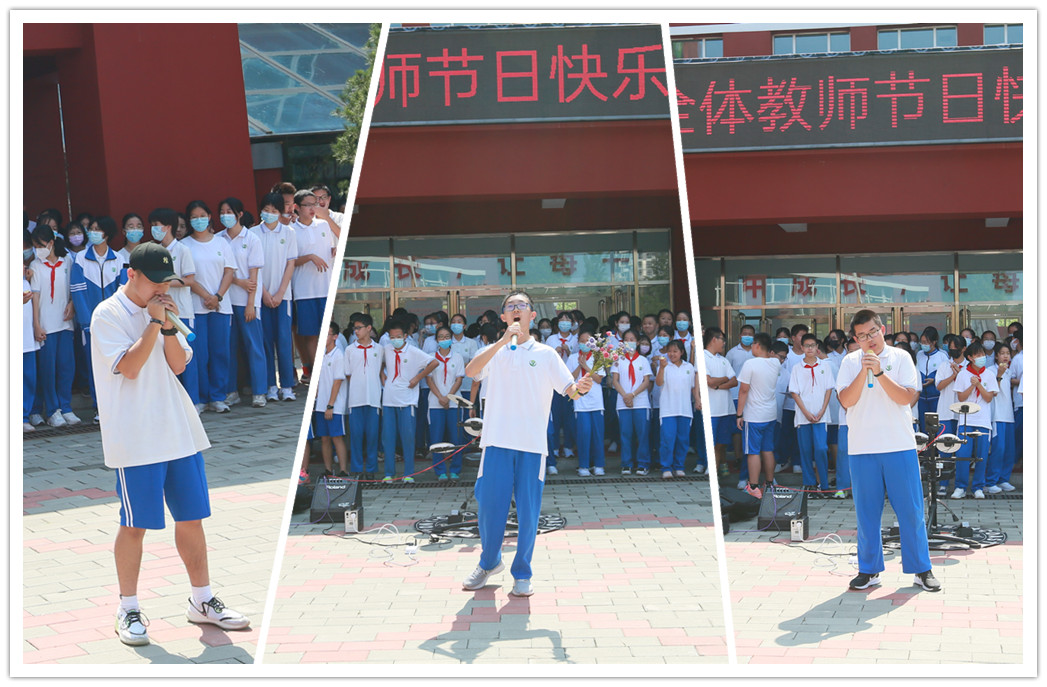 中午,同学们精心准备的教师节专场演出“想把我唱给你听”在朝来校区小广场粉墨登场。初一11班范馨文和乔汐玥同学采用朗诵配合演唱的形式赞美和祝福老师。初三13班王泽群和何子霖同学用相声《欢庆教师节》祝愿老师们笑口常开。初三16班李畅、初三9班王宇凡和初三14班周硕的歌曲串烧给老师们送上节日里的欢唱。最后,由初二13班王隽一、彭湘棋、赵子墨,初二12班周子霖和初二14 张屹茨,共5位同学组成的新工业革命乐队的专业演出把活动推向高潮。伴随着优美的歌声,同学们真挚地道上一句:老师,您辛苦了。
