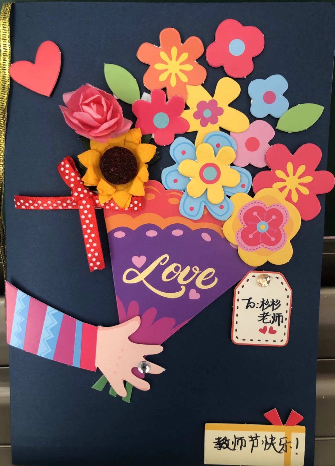 孩子们用自己的方式为老师庆祝节日,做到了用朴素、多样的形式表达对老师的感谢之情,如:亲手做贺卡、花束,并献上深深地祝福:"老师节日快乐!您辛苦了!"