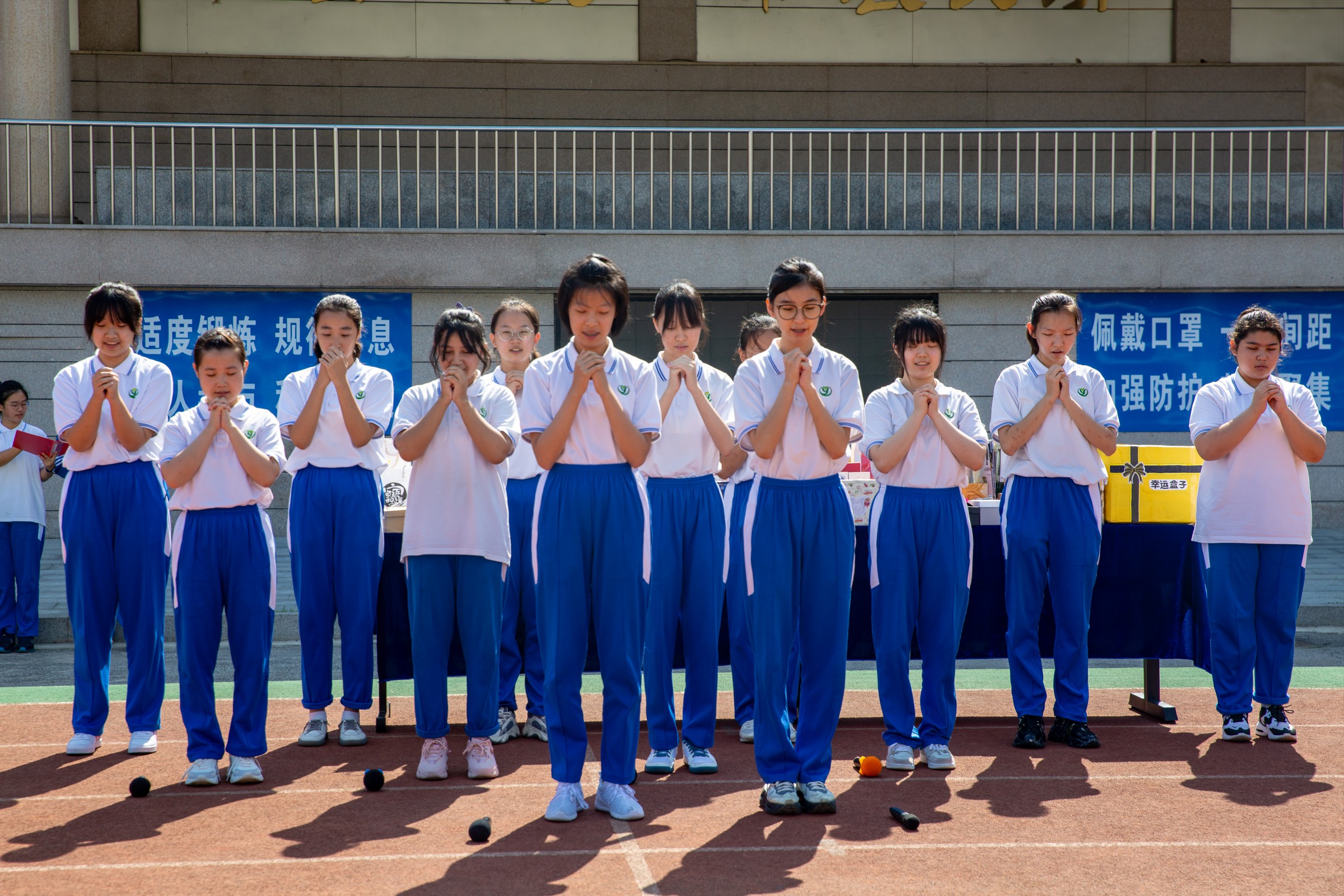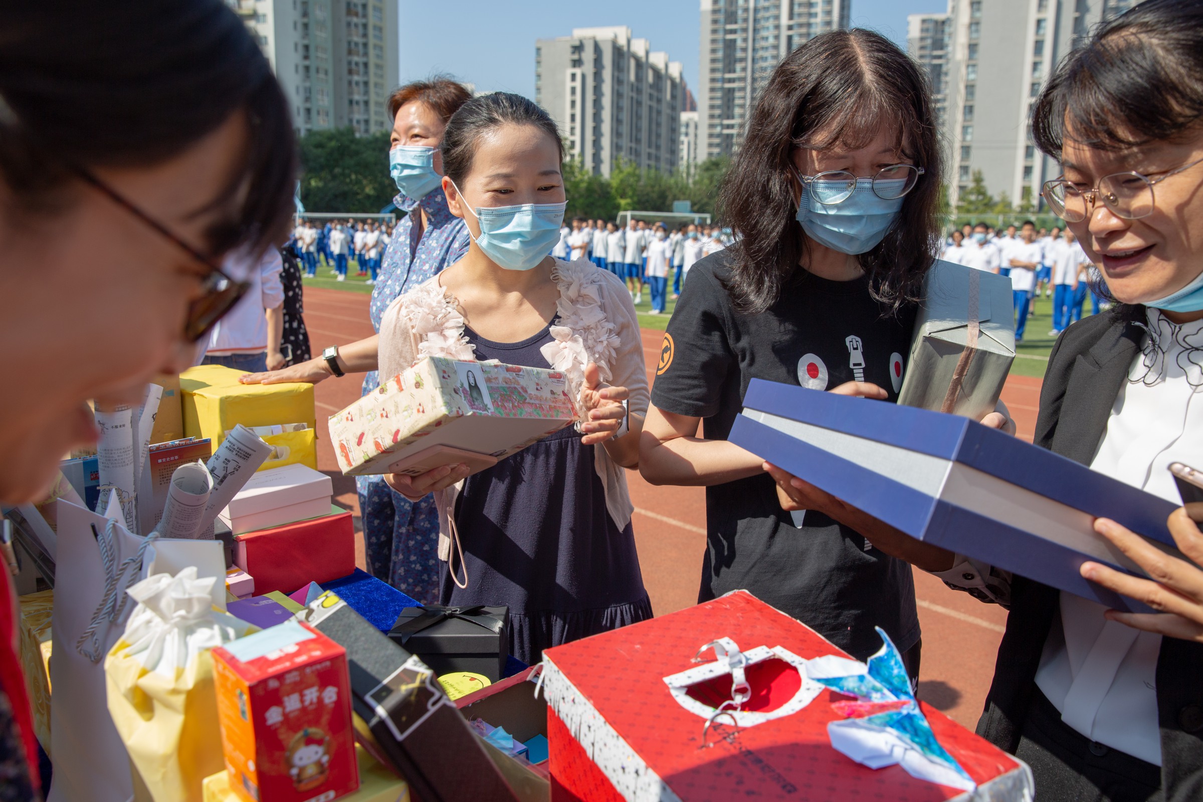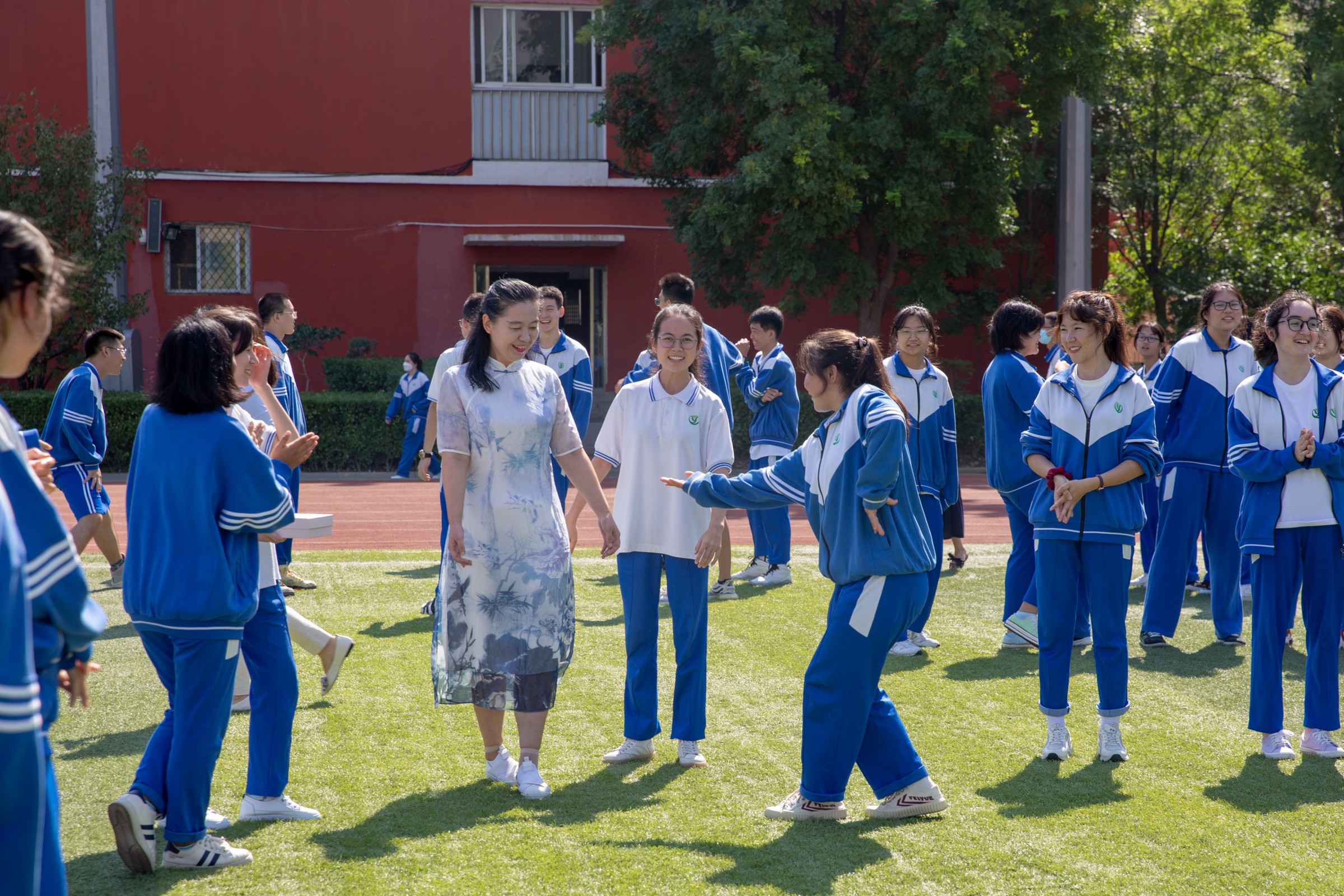 9月开学伊始,学生们就早早以班级为单位为老师准备“盲盒”,里面有糖果、护嗓含片、贺卡等。10日早上,伴随着温馨的音乐,学生们将自己的祝福悬挂在了校园的围墙上,并向老师赠送了学校准备的教师纪念印章。校门口展出了部分老师的在课堂里的“口头禅”,字里行间中无不流露出浓浓的师生情。课间操时间,合唱团为全体老师们真情献歌,老师们纷纷抽取“盲盒”,大家脸上都洋溢着幸福的笑容。随后,各班以班级为单位开展了形式多样的庆祝活动,有的表演民族舞,有的合唱一支歌,有的跟老师一起做游戏……整个操场成了一片欢乐的海洋。