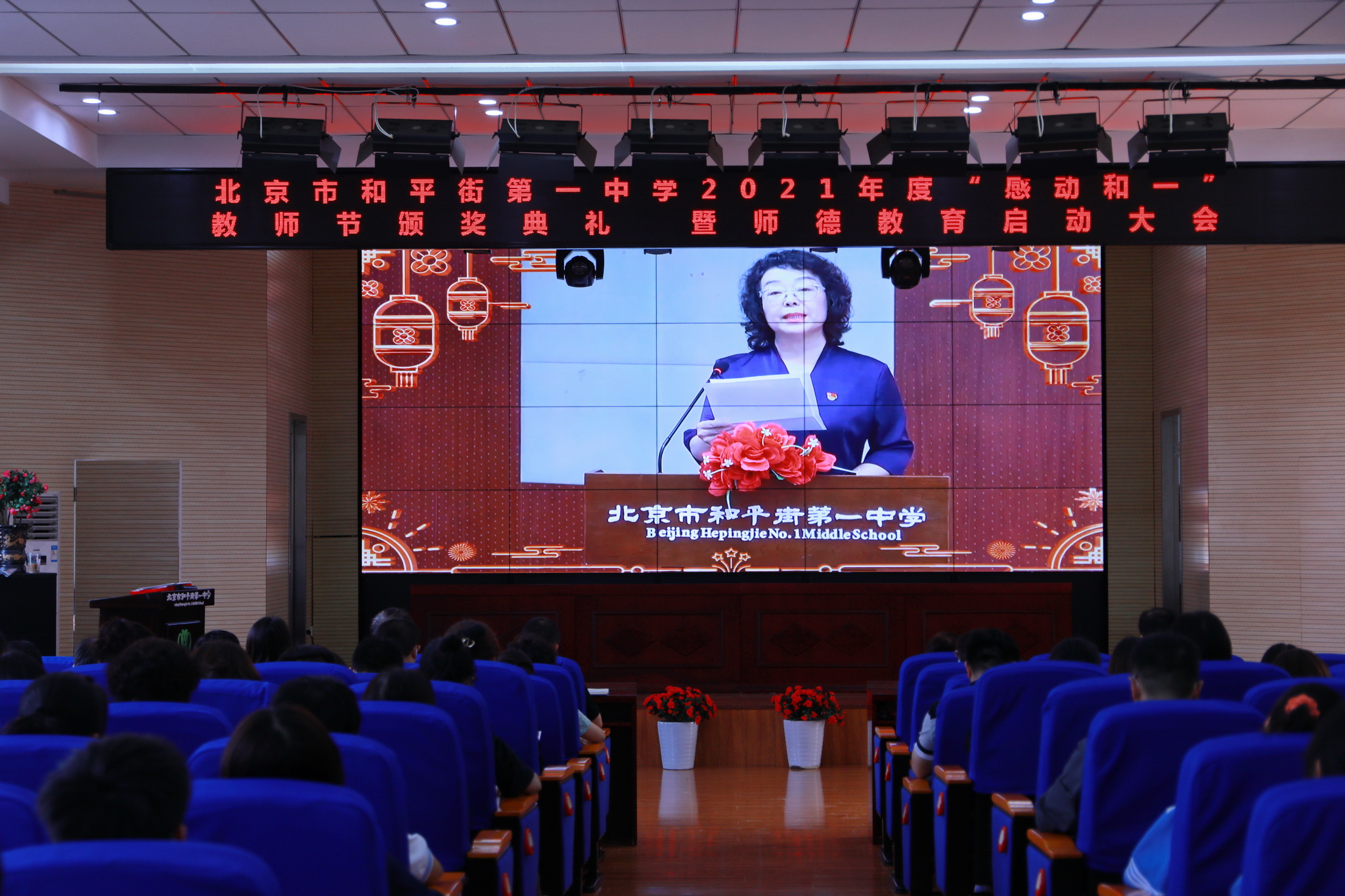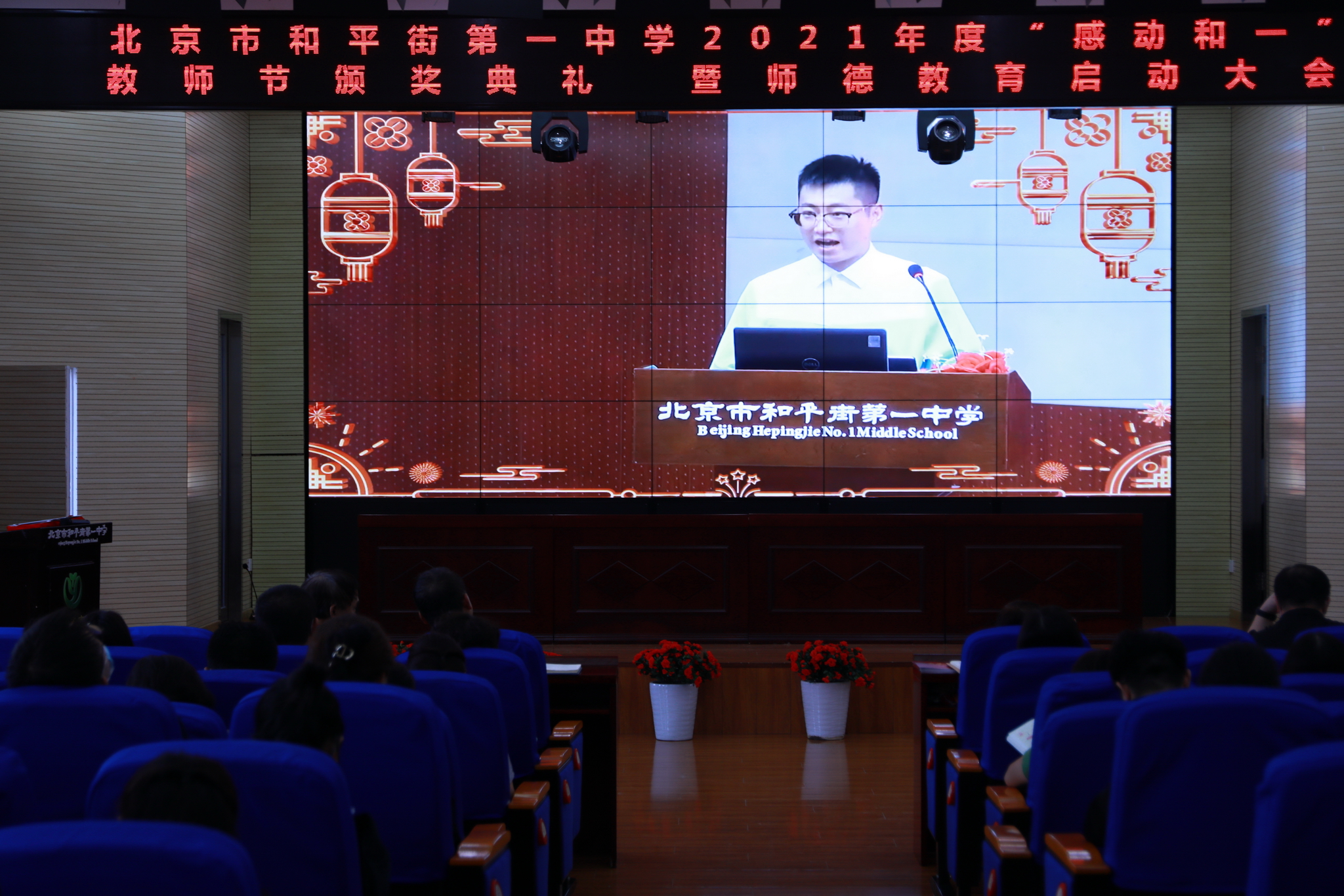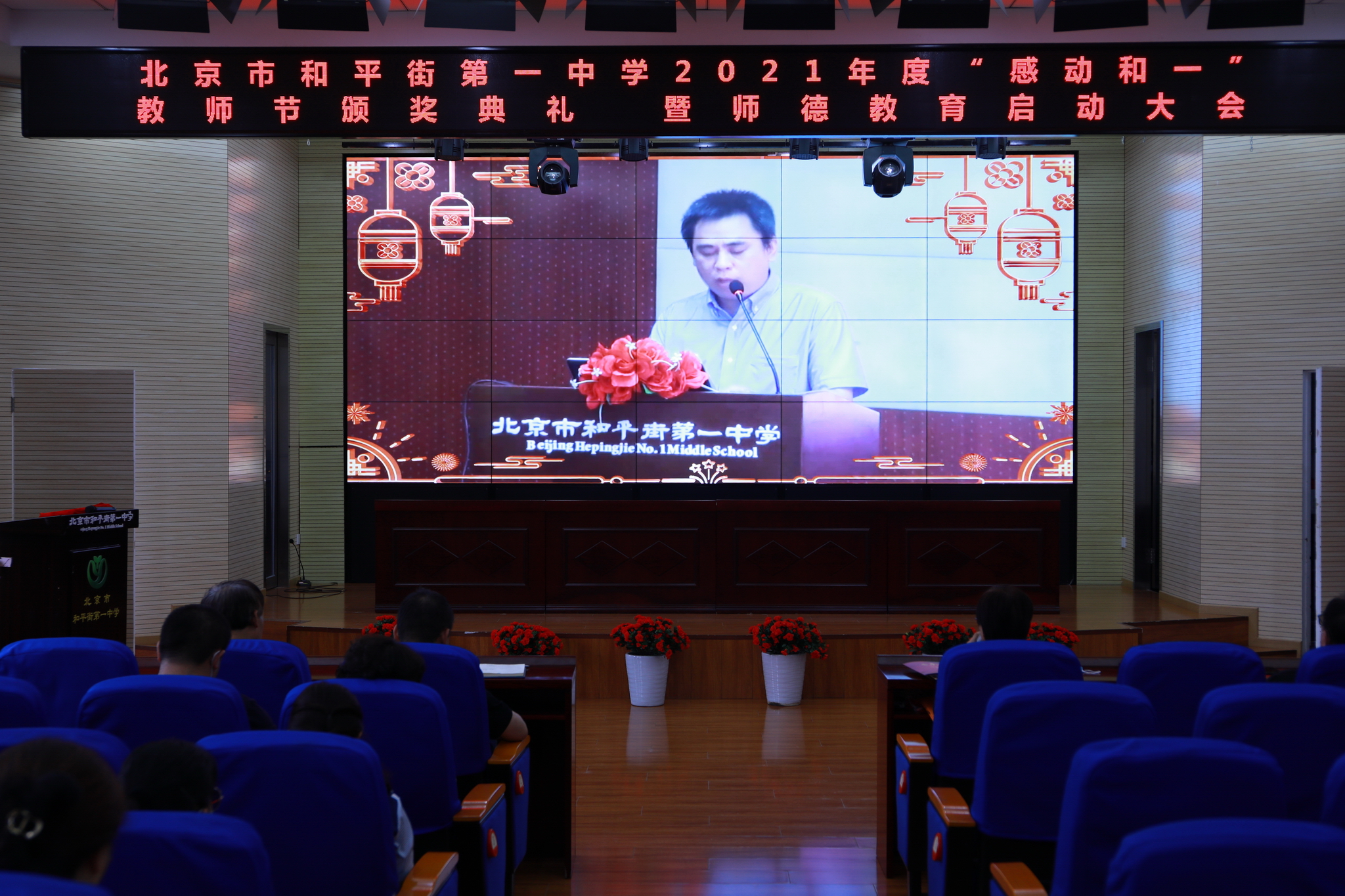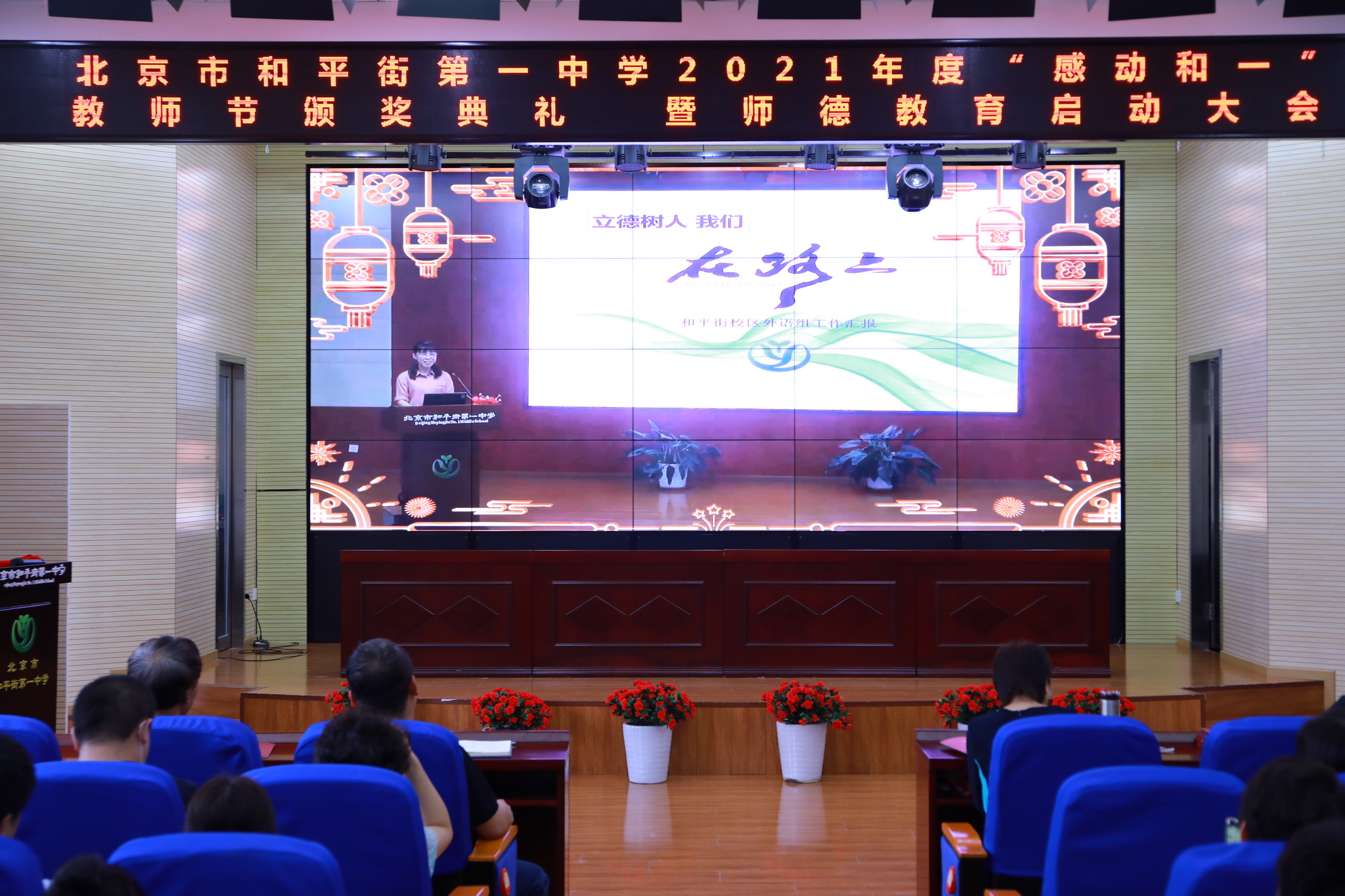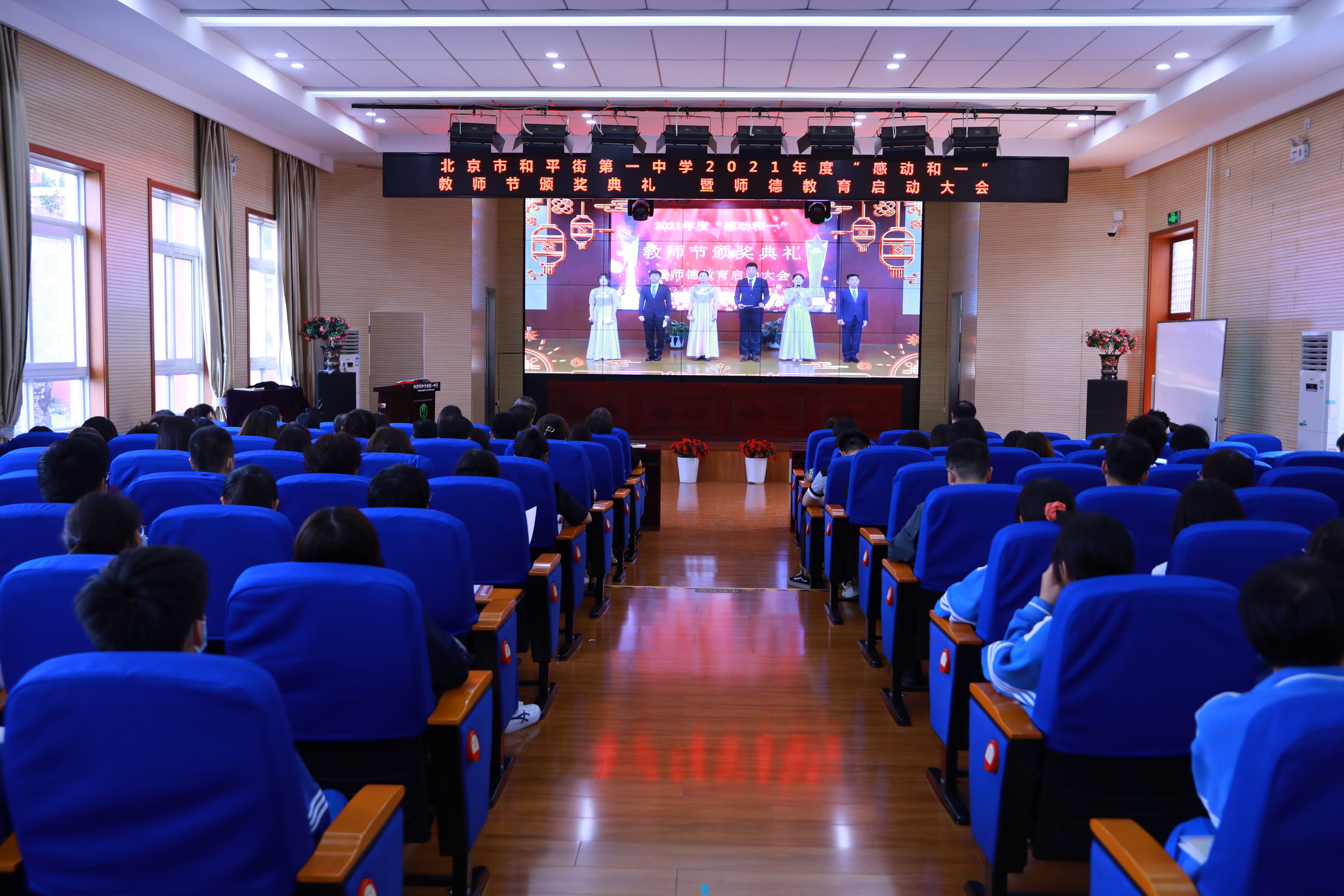 2021年9月14日下午,和平街一中隆重举行2021年度“感动和一”教师节颁奖典礼暨师德教育启动大会。六校区教职工及学生代表分别来到校区指定会场,共同庆祝教师们重要的节日。按照疫情防控要求,本次活动改为录播和校区现场颁奖的方式进行。