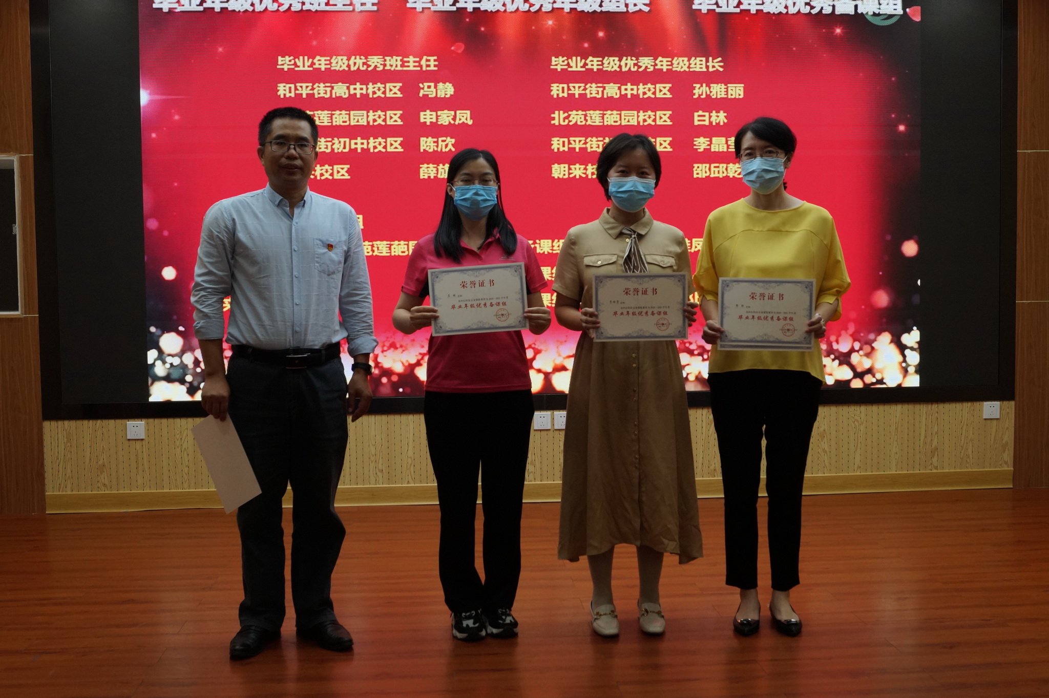 刘怡然、张利、石权三位老师分别作为师德标兵、优秀班主任、优秀共产党员代表进行了发言。三位老师分别以“长大后我就成了你——从‘和一学子’走向‘和一教师’”“最美好的遇见”“建党百年,广场有我们”为题,分享了作为青年教师与和一共成长的故事,作为班主任用心总结的有效班级管理经验,作为共产党员在建党百年庆祝大会活动中率先垂范、无私奉献的感人故事。周烨、李金花、孙少勇等三位老师作为教育教学成果奖获奖集体、优秀教研组、优秀备课组代表分别进行发言。周老师以 “开发实施综合课程 培育优秀和一学子”为题,介绍了奥运村校区文综组在教研组长带领下,开发实施综合课程促进学生全面发展过程中的所思所想所感所悟。李老师和孙老师分别以“立德树人 我们在路上”“凝心聚力 务实笃行 闪智慧之光”为主题,分享了作为教研组长、备课组长带领组内教师潜心教研、共享智慧、愉快奋斗的过程。为今后老师们创新开展教育教学研究提供了方法与借鉴,现场老师们深受感动,也倍受鼓舞。