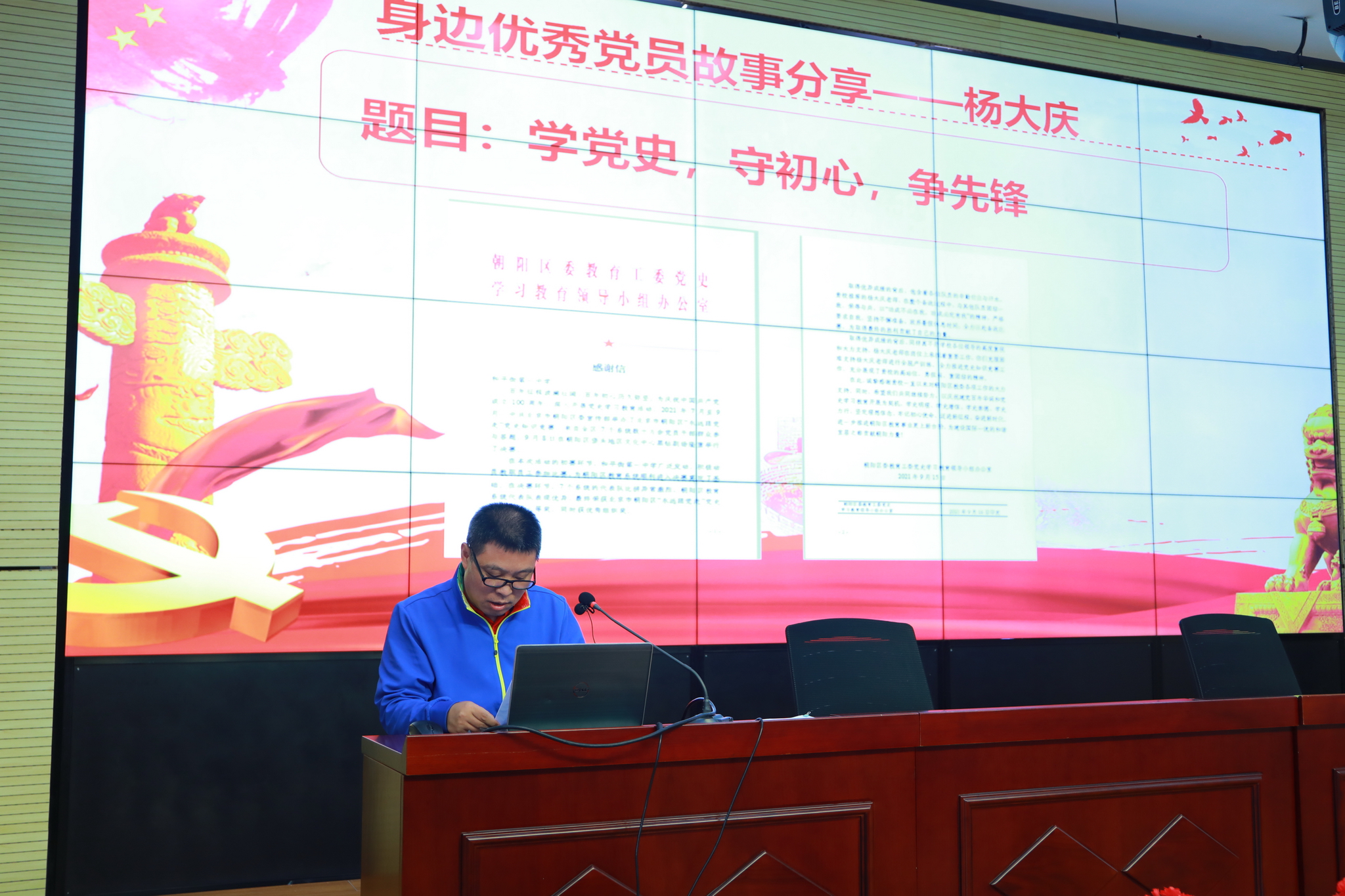 随后,进行“身边优秀共产党员故事交流”,由和平街高中校区杨大庆同志以“学党史,守初心,争先锋”为主题进行党史学习故事分享。杨老师结合自己通过“学习强国”平台学习党史、学习《习近平新时代中国特色社会主义思想学习问答》对自己认识提升的经历,介绍了自己参加“永远跟党走”北京市党史知识竞赛初赛、复赛并最终代表教育系统在朝阳区比赛中获得第四名好成绩的过程,更进一步坚定了自己的初心使命。