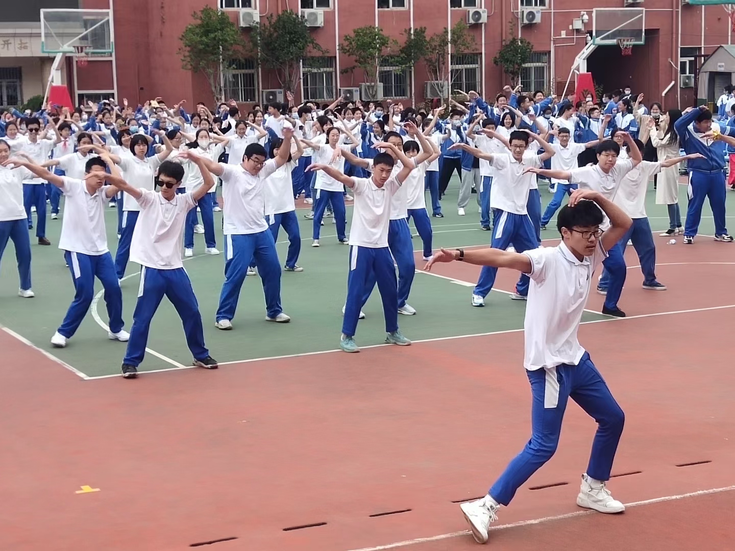 在隆重的升旗仪式结束后,校区主管邹小刚副校长致开幕词,然后分别由初三、初二、初一年级进行国操《舞动青春》的展示。在随后的班级自编操展示中,每一个参赛班级都尽情展现了特色编排,充分体现了班级的凝聚力和向心力,他们的精彩表现迎得了观赛师生的阵阵掌声。在所有班级展示过后,初三6班主动要求返场表演,在他们的带动下,全校同学热血沸腾,跟随动感的节拍加入了队伍中,形成了全校“快闪”瞬间,全校师生自发地高喊:“我爱和一!”将对学校的爱表达出来,会操比赛在热烈的氛围里结束。最后,家委会成员代表初三1班高雅轩的妈妈发表了观赛感言。她感谢学校的邀请、班主任老师的辛苦付出,同时大力表扬了学生们的精彩表演,也对在座的全体师生送上了祝福。