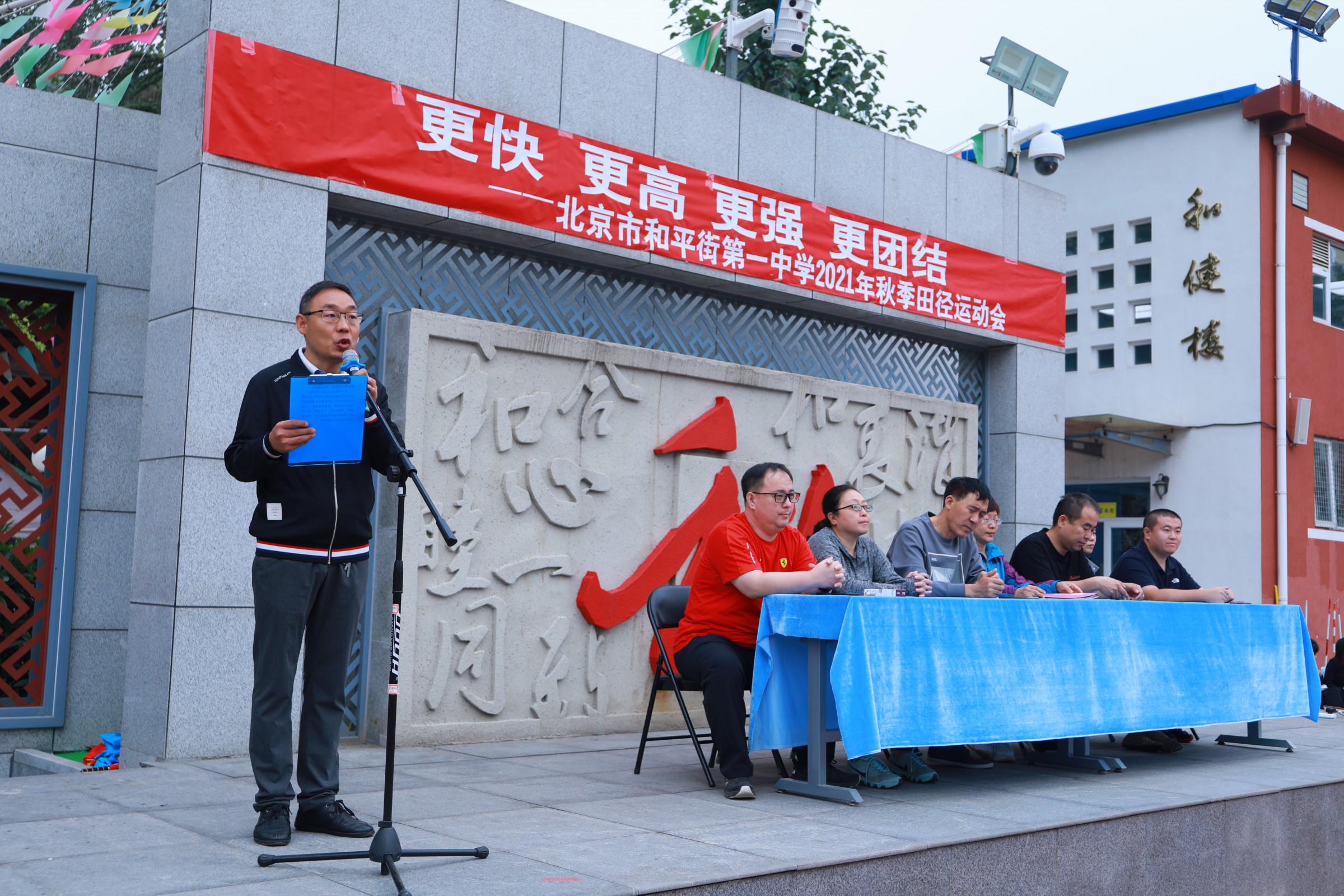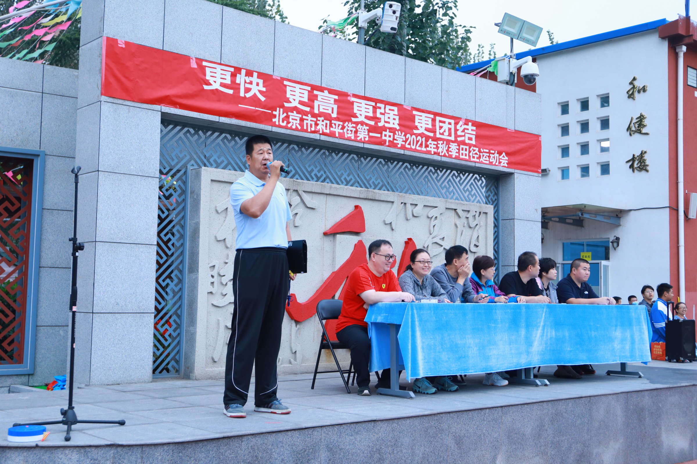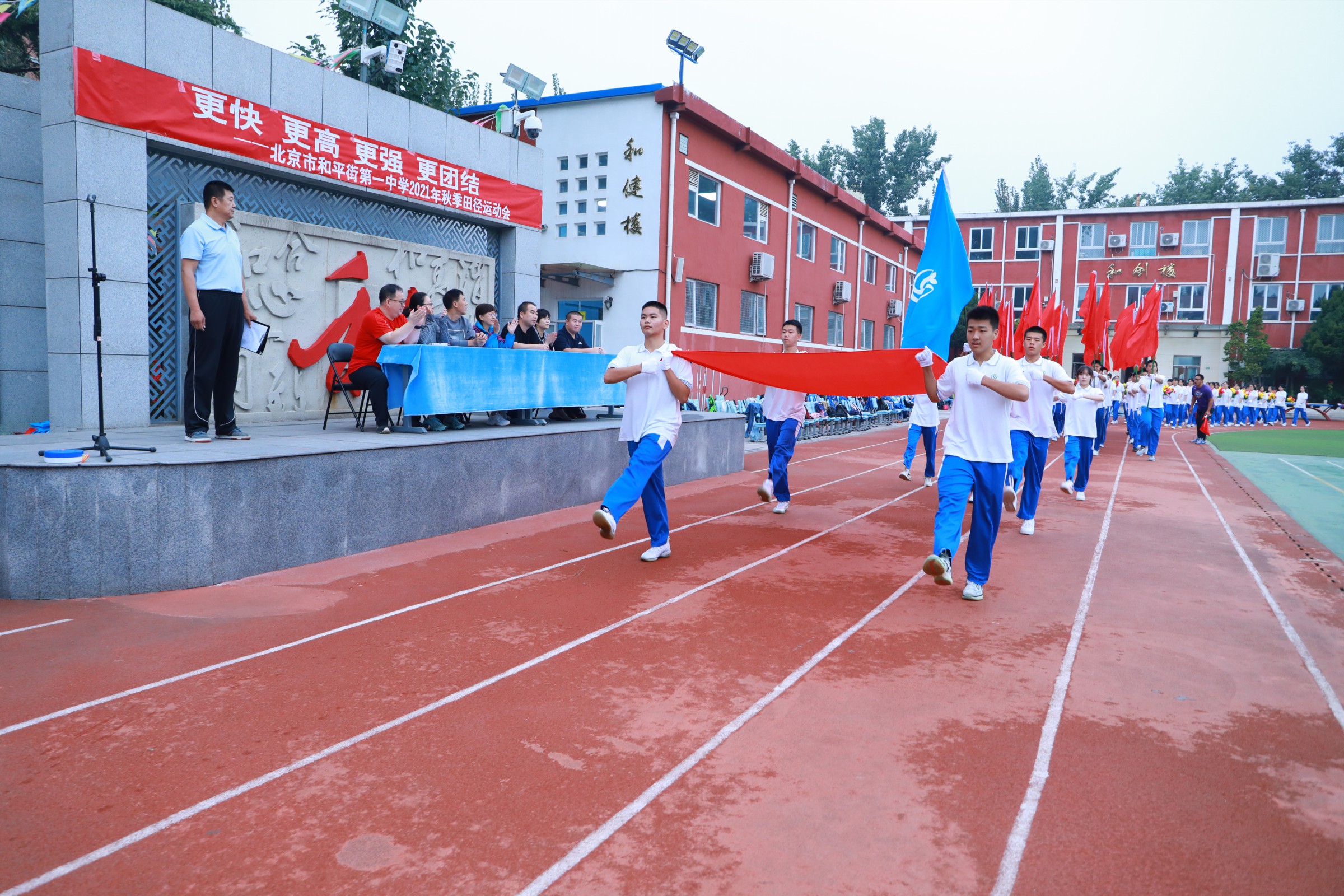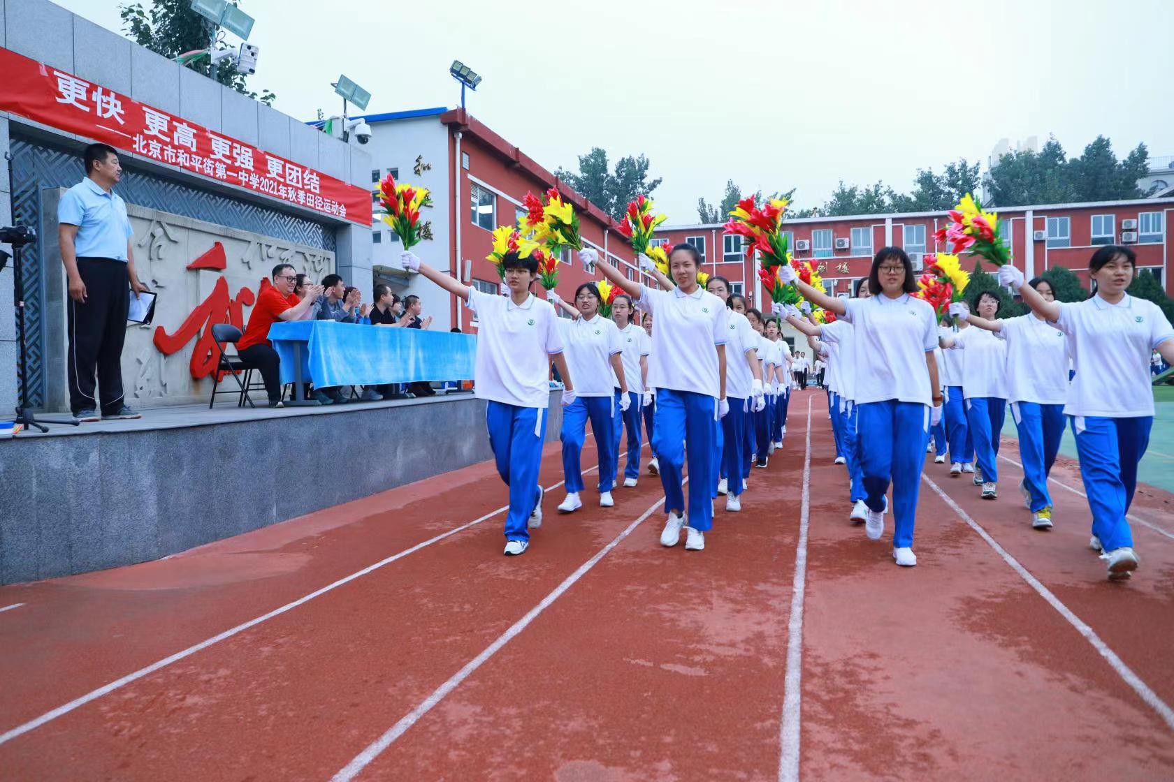 当第32届夏季奥林匹克运动会的圣火在东京熄灭,中国奥运健儿们载誉而归,乘着第十四届全运会东风,莘莘学子带着朝气与活力迈入和一校园。鲜花举起,红旗飘扬,2021年9月30日早7点,北京市和平街第一中学和平街高中校区2021年秋季运动会拉开帷幕。校党总支张静书记、和平街高中校区主管副校长曹成勇、校长助理张习文、校长助理李春光、学生发展处主任卢岩、党办主任崔静、团委书记刘争、全体教师出席了开幕式。开幕式由总务处主任邓科军主持。