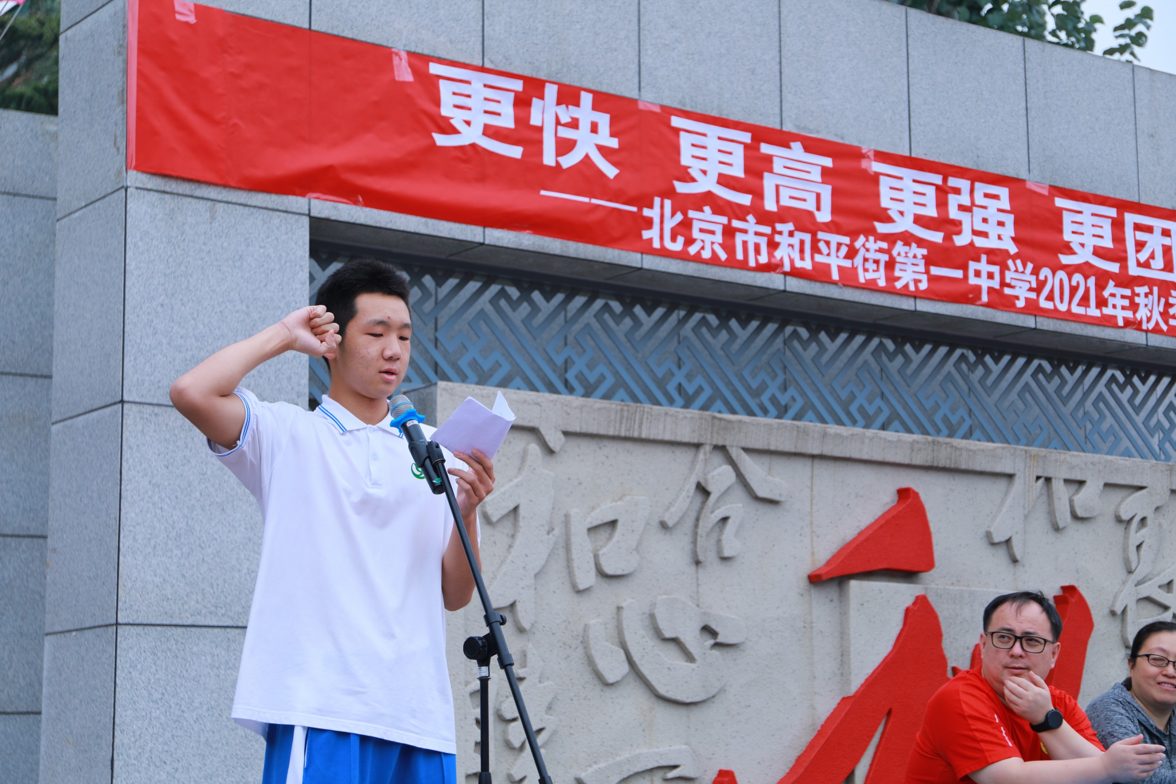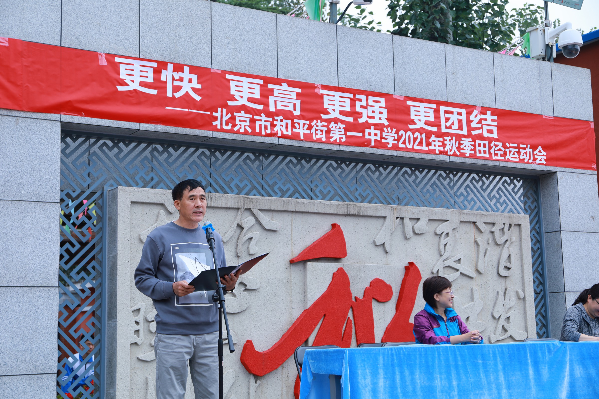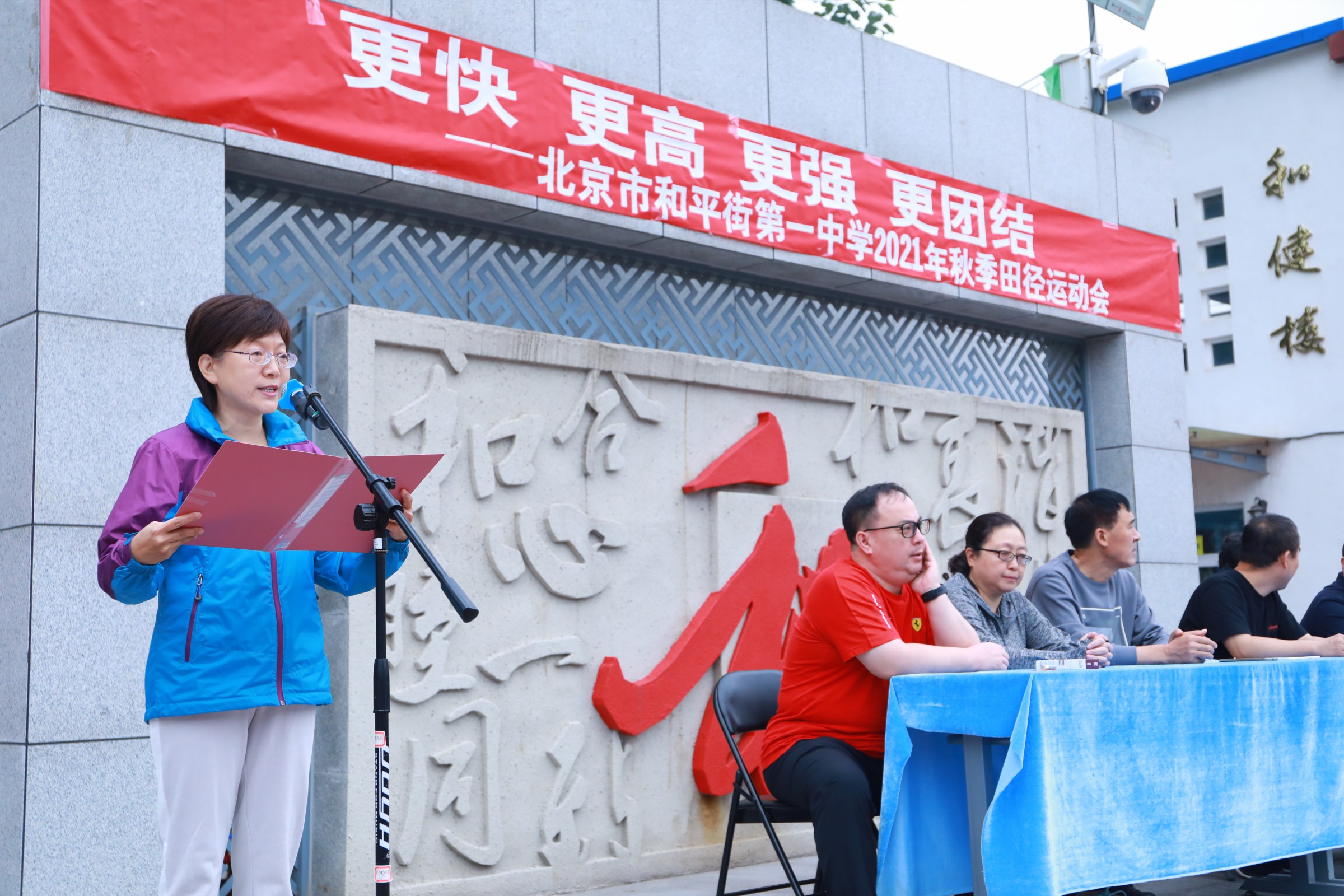 当第32届夏季奥林匹克运动会的圣火在东京熄灭,中国奥运健儿们载誉而归,乘着第十四届全运会东风,莘莘学子带着朝气与活力迈入和一校园。鲜花举起,红旗飘扬,2021年9月30日早7点,北京市和平街第一中学和平街高中校区2021年秋季运动会拉开帷幕。校党总支张静书记、和平街高中校区主管副校长曹成勇、校长助理张习文、校长助理李春光、学生发展处主任卢岩、党办主任崔静、团委书记刘争、全体教师出席了开幕式。开幕式由总务处主任邓科军主持。