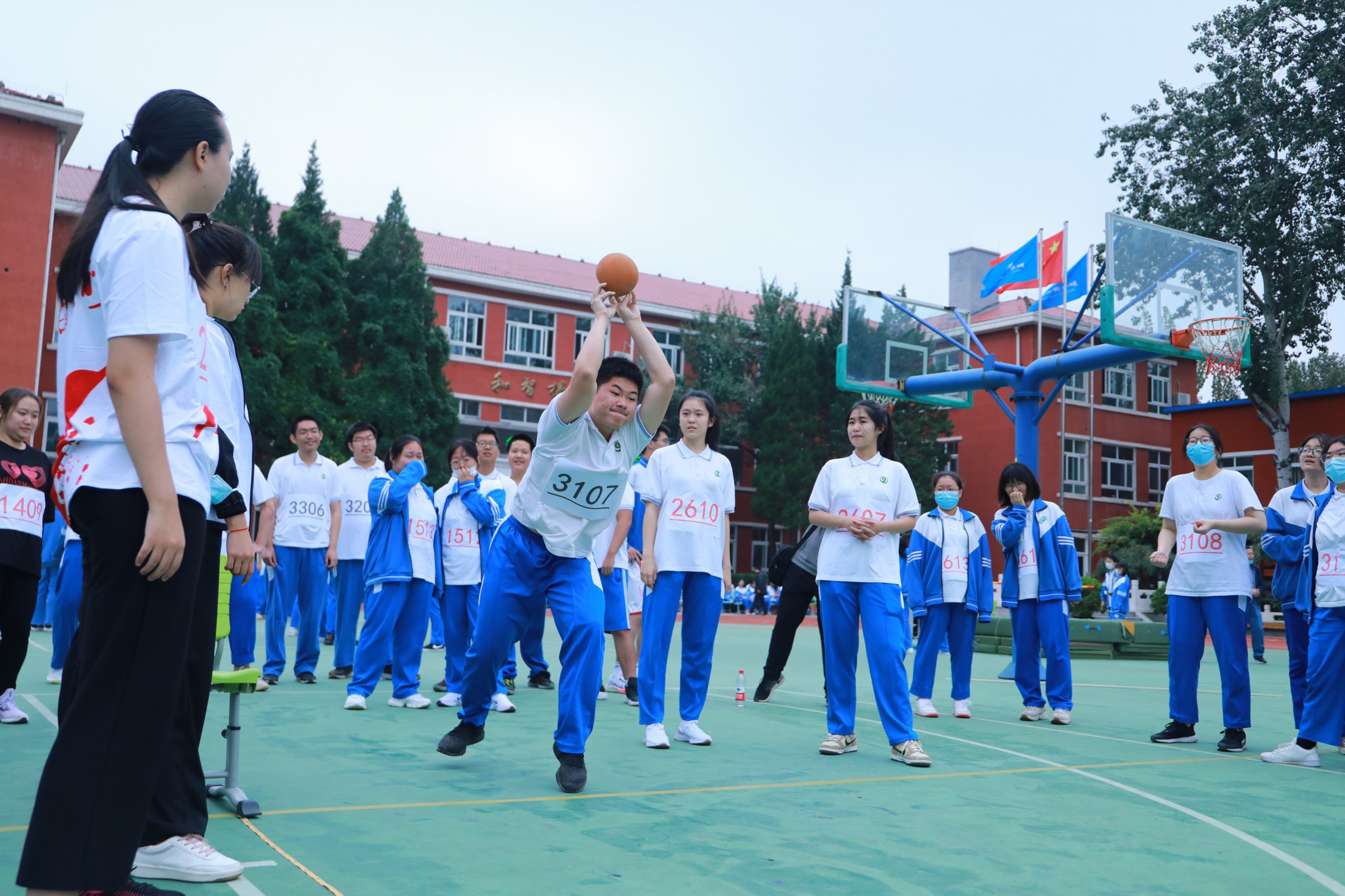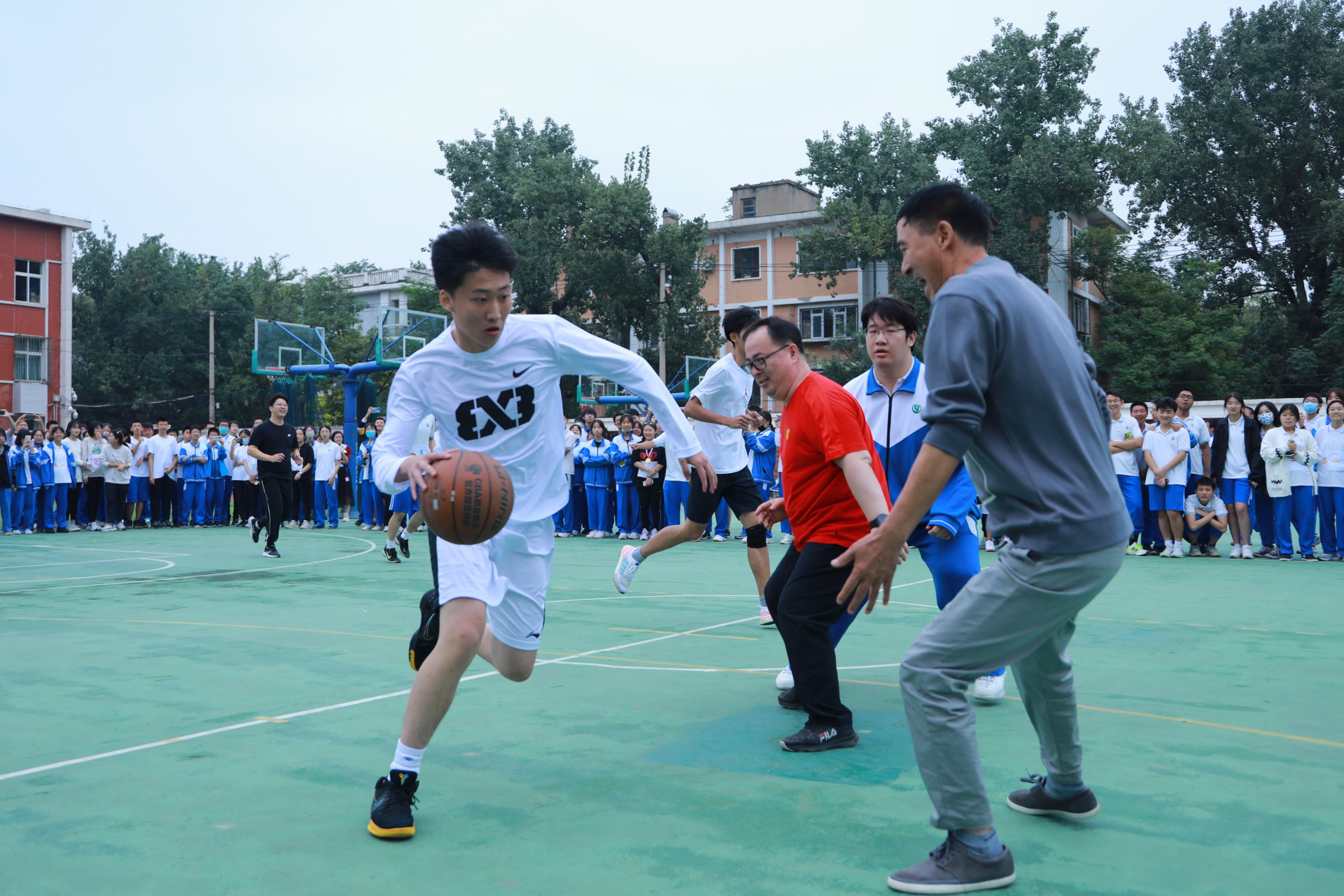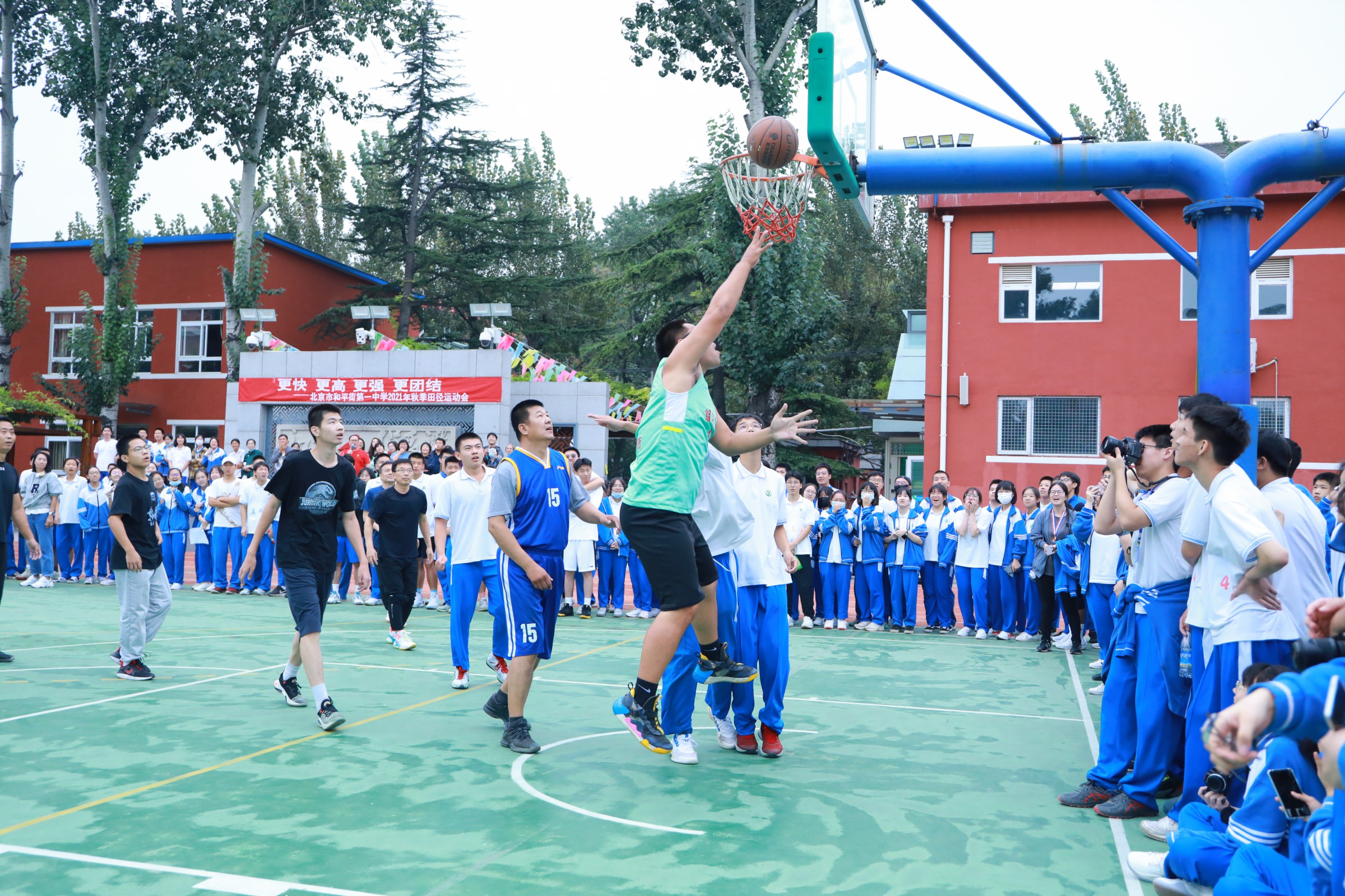 运动会最后,进行了师生篮球比赛。整场比赛中,双方队伍都展现出了不容小觑的实力,用精湛的篮球技巧为大家呈现了一场精彩的视觉盛宴。场下观众的情绪也同样高涨,齐声呐喊、加油助威,响彻云霄。教室里,教师居三尺讲台传道授业解惑,篮球场上,师生热血对抗,共同挥洒汗水,小小的篮球传递着浓浓的师生情谊,拉近彼此之间的距离。