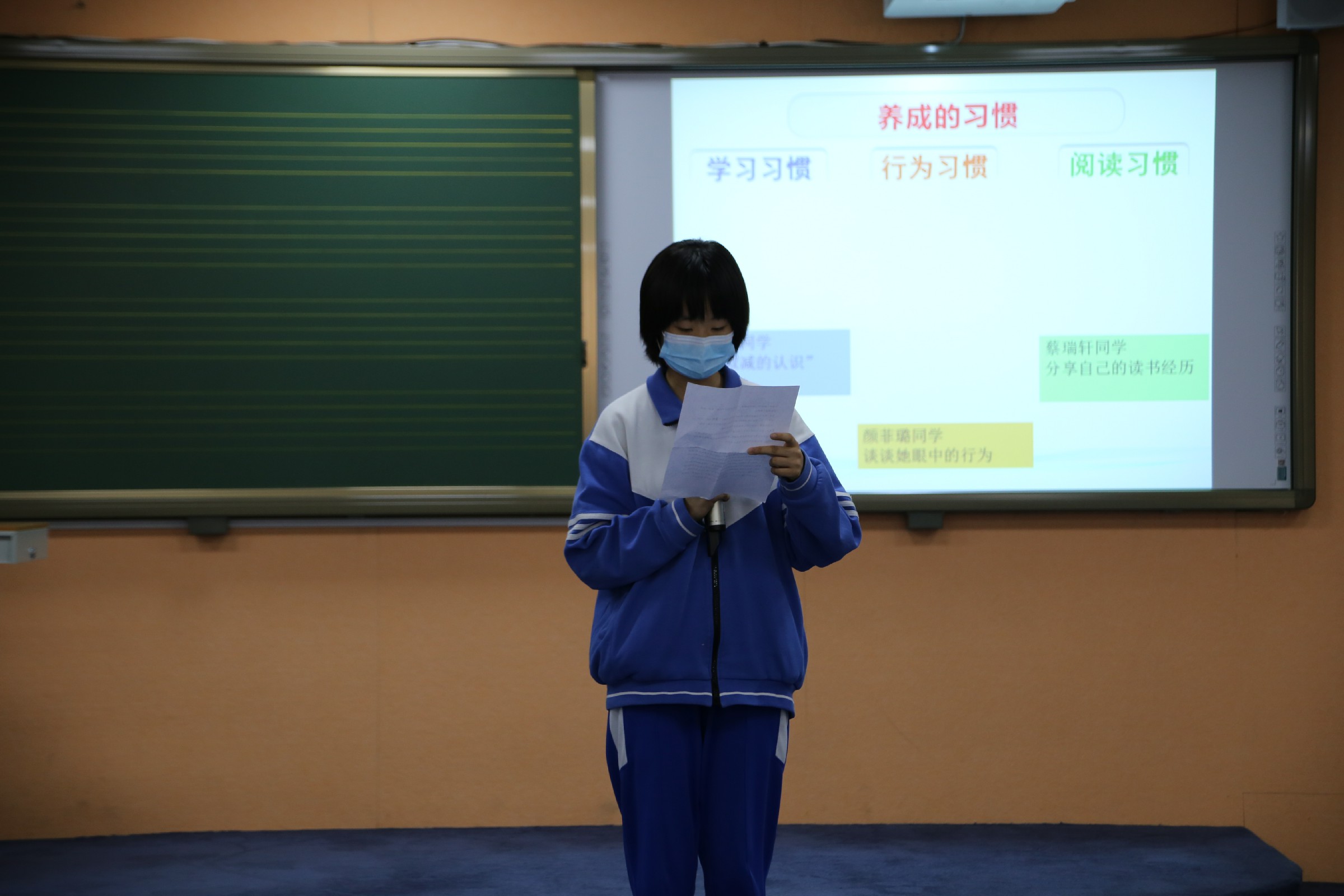 初二(22)班宋珂莹同学结合“双减”政策谈学习习惯。初二(23)班颜菲璐谈她眼中良好的行为习惯,希望同学们用恰当的语言和行动来传递正能量。初二(24)班蔡睿轩同学谈如何培养良好的阅读习惯。道法老师苏丽娜告诉全体学生凡是好的态度和好的方法,都要坚持二十一天转化为习惯。只有形成习惯,好的态度才能随时随地表现,好的方法才能随时随地运用。