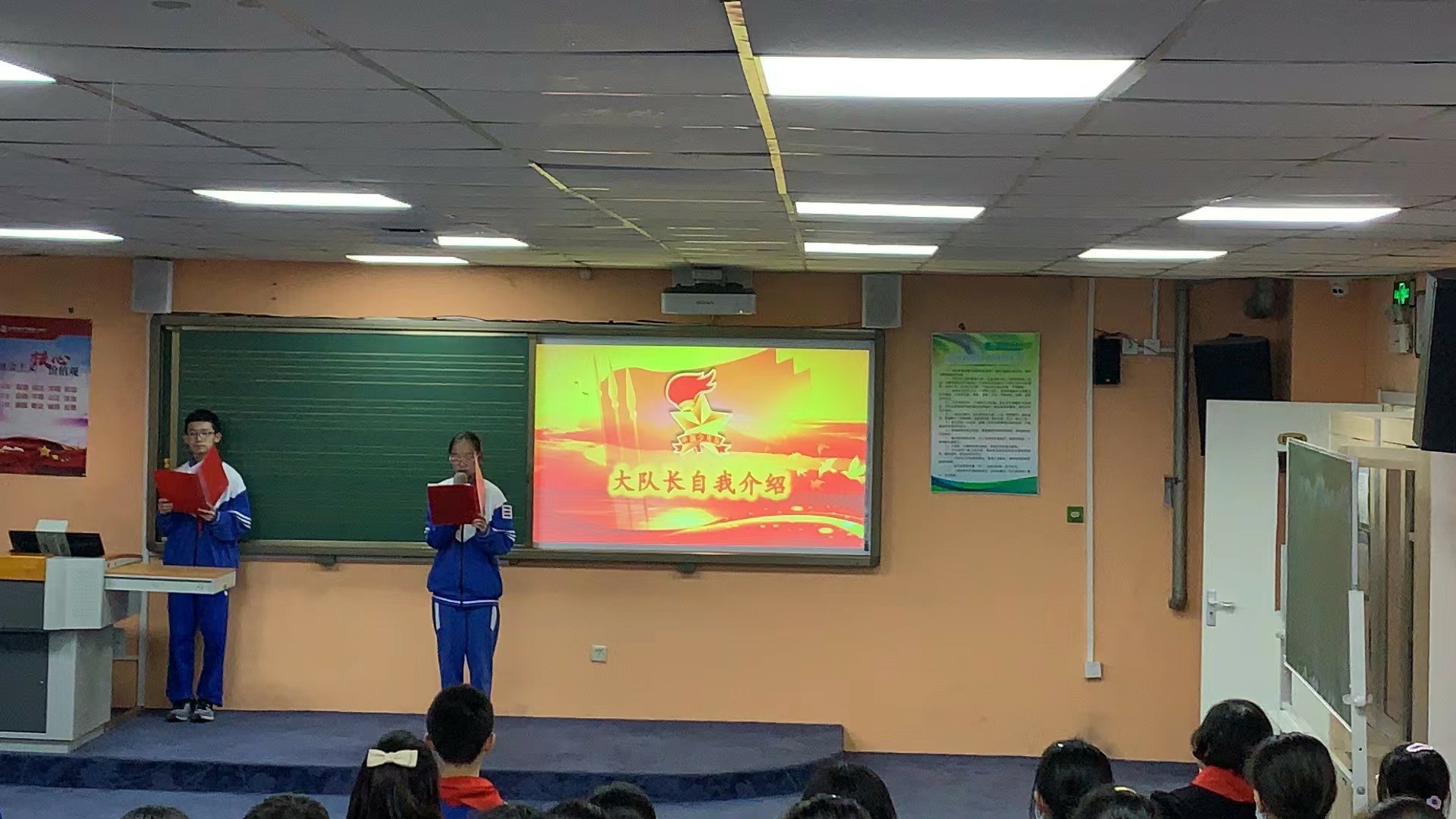 首先进行的是建队仪式,王瑾主任宣布成立新的少先大队和中队,少先队员旗手高高举起鲜红的队旗,全体学生歌唱《少年先锋队队歌》,大队长刘笑月带领同学们庄严宣誓。