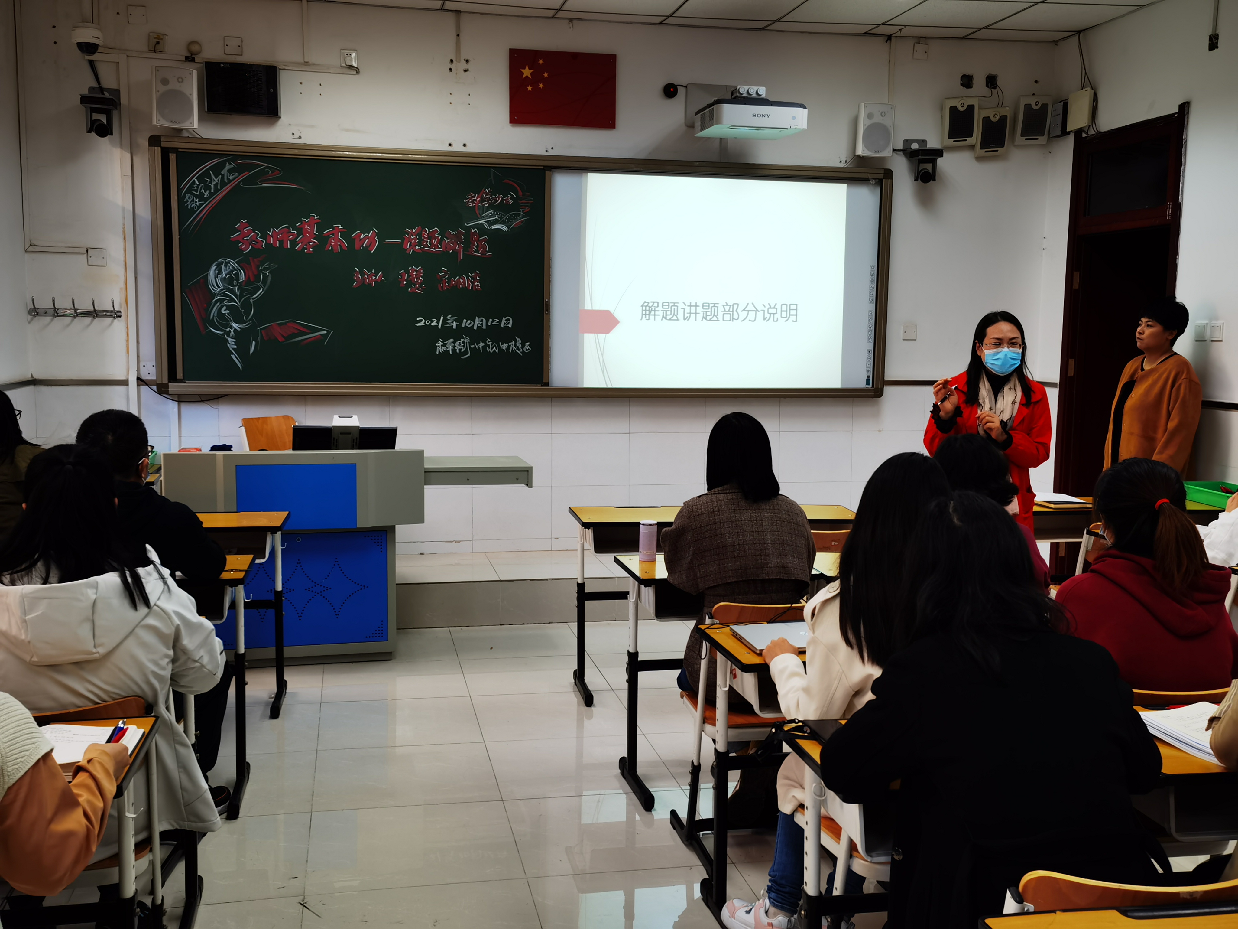 为提升教师教研能力,提高教师教学水平,促进教师专业成长,2021年10月13日和平街第一中学和平街校区初中部在教学楼二层录课教室举办了“教师基本功-解题说题”教学沙龙交流会,会议由教学黄国会主任主持,由首届“朝阳杯”中小学教师基本功展示活动中荣获初中段解题讲题项目一等奖的获得者王慧老师和宋明洁老师主讲。