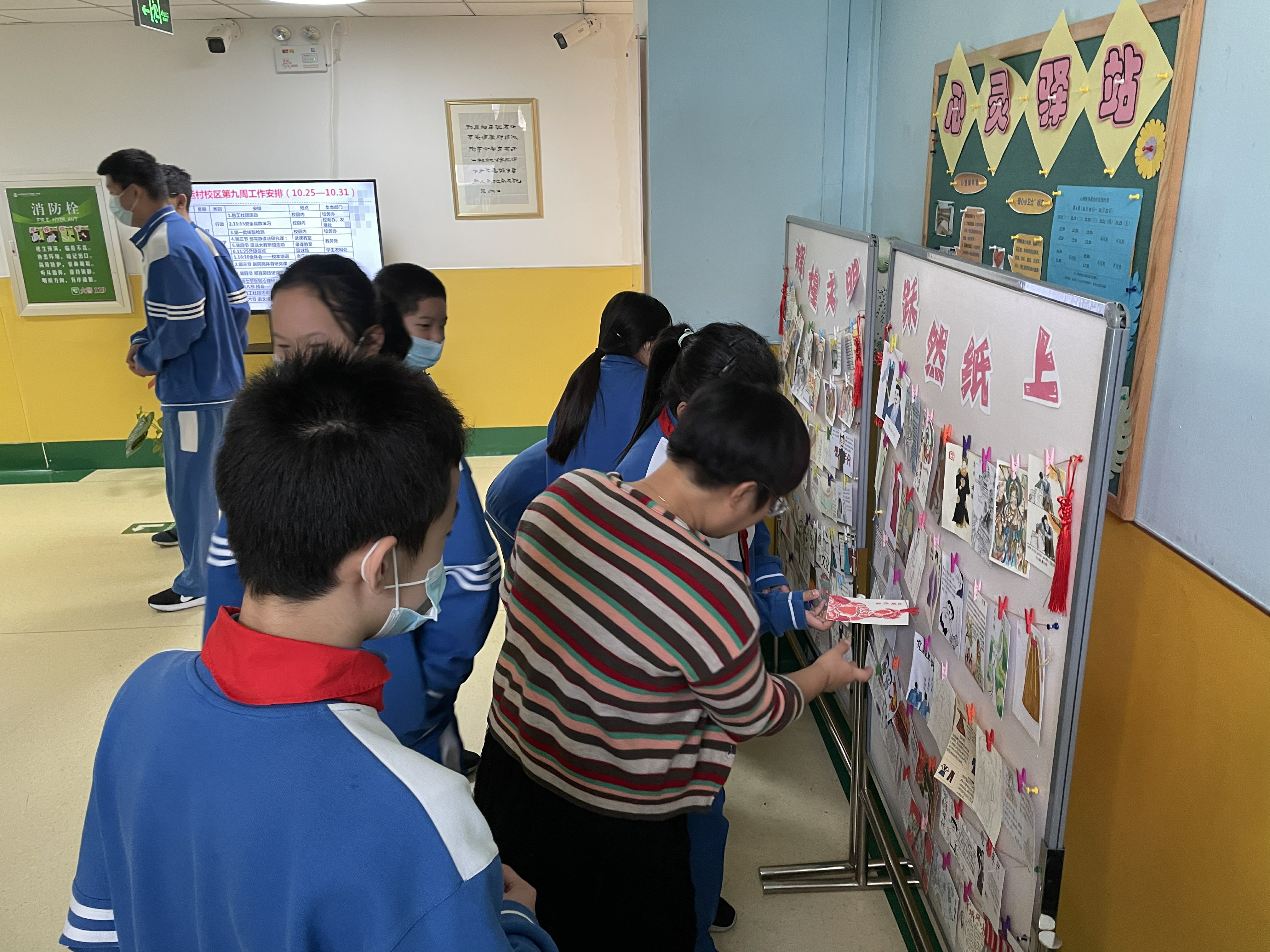 春风化雨,润物无声。学生绘画作品的精彩呈现,激起各位领导和教师的关注,他们用一张张贴纸为心仪的作品投票,师生共融,温柔相待,彼此分享心得。