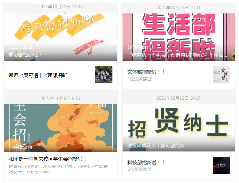 朝来校区学生会面向初一年级组织策划招新活动。本次招新采用线上和线下报名相结合的方式。朝来校区学生会利用公众号平台发布招新公告并开启线上报名通道;学生会六个部门分别发布各自的招新宣传推文。通过这些推文,初一年级新生对学生会各部门的工作有了直观的了解,而且帮助他们更好地选报自己感兴趣的部门;同时学生会各部通过招新推文的制作,梳理总结过去的工作并规划未来的工作。