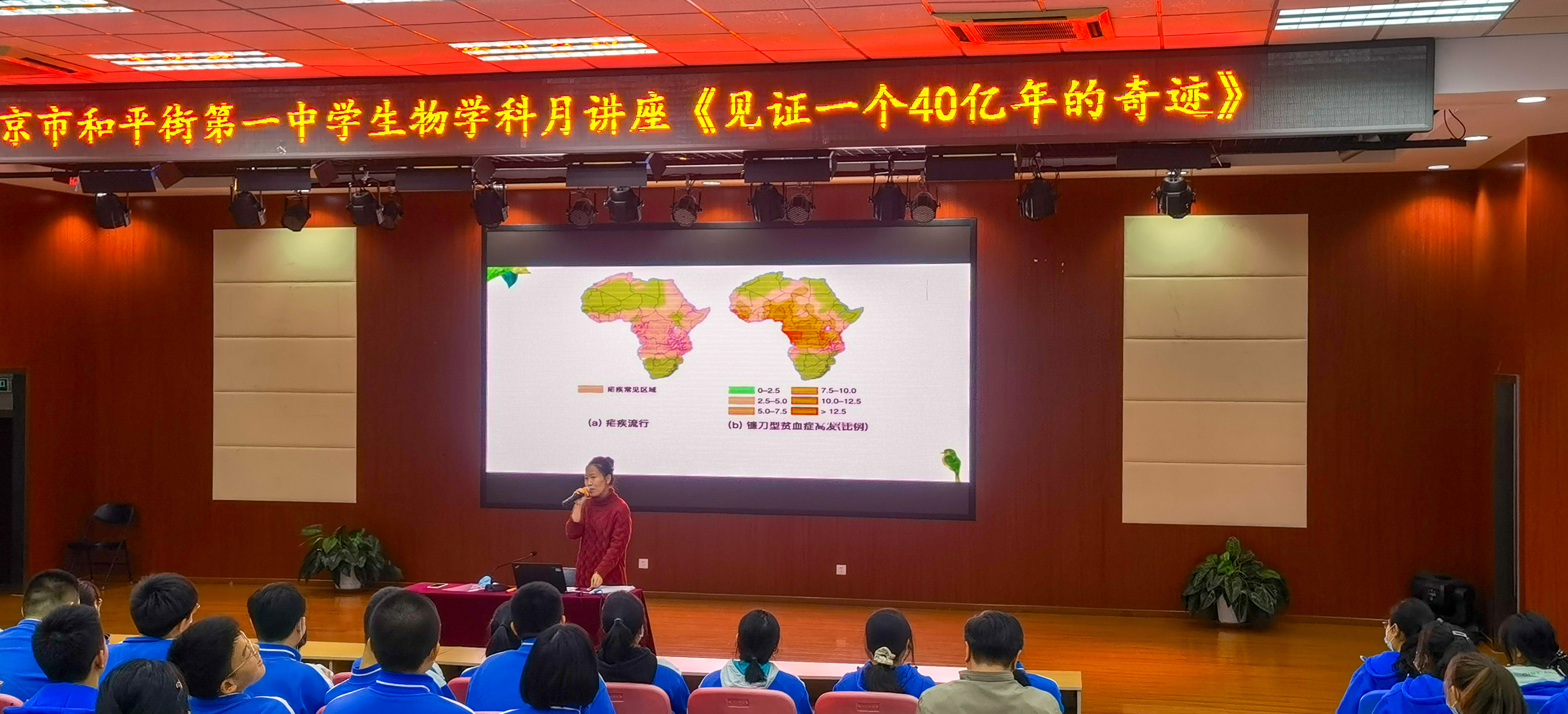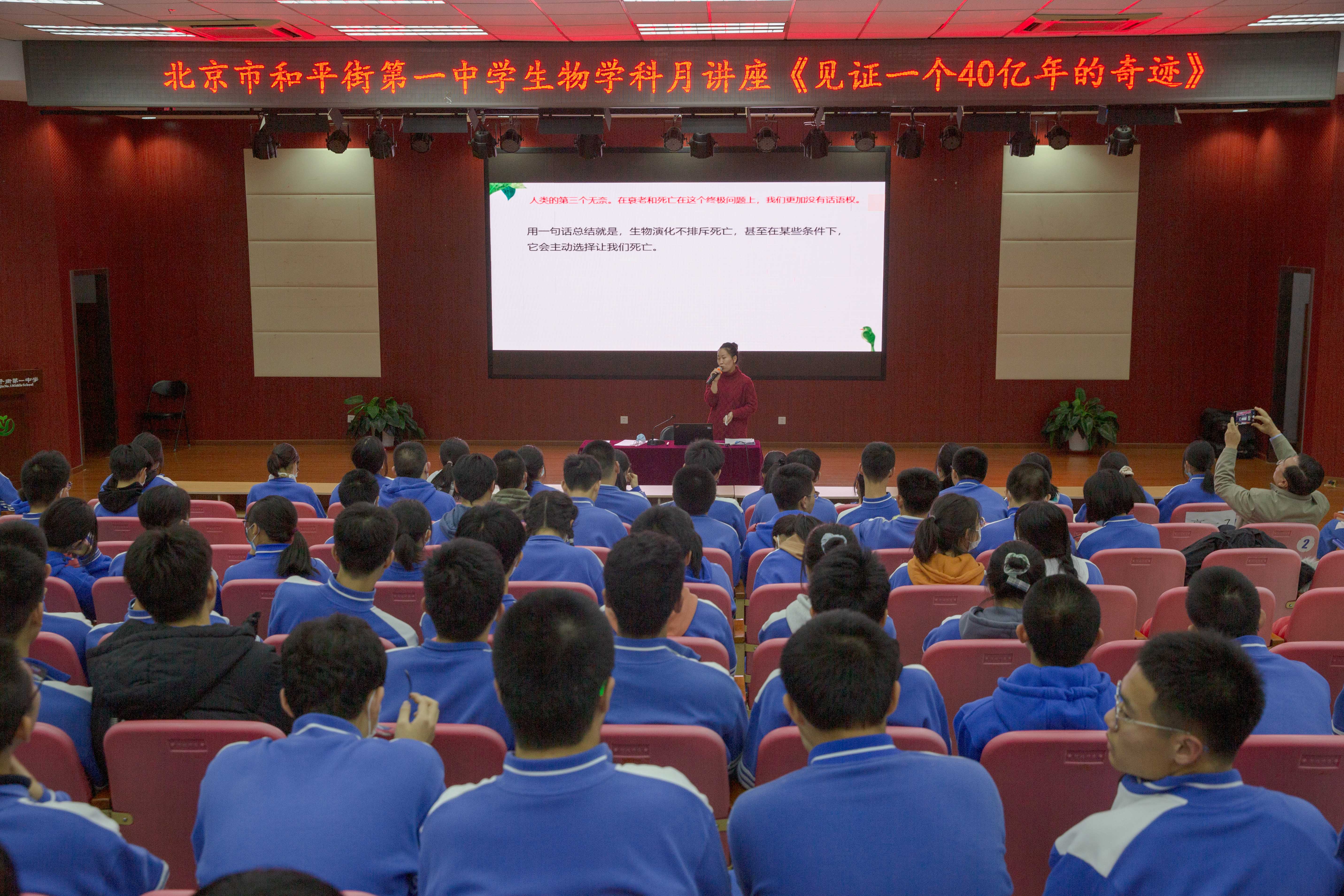 2021年12月1日下午,北京市和平街第一中学莲葩园校区生物学科月科普讲座活动在五层阶梯教室举行。本次科普讲座的题目是《见证一个40亿年的奇迹》,由肖德慧老师担任主讲,高一、高二两个年级三百名学生以及生物教师、高一年级组长程瑞芬老师及高一年级全体班主任、高二年级组长赵楠老师等全程参与了此次活动。